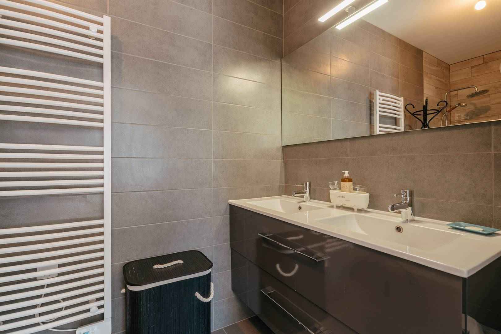 - Séjour avec partie salon (canapé, TV connectée) et partie repas (table et chaises) donnant sur les 2 terrasses exposées sud-ouest et prolongées par le jardin privatif clos (salon de jardin, transats, douche "retour de plage")