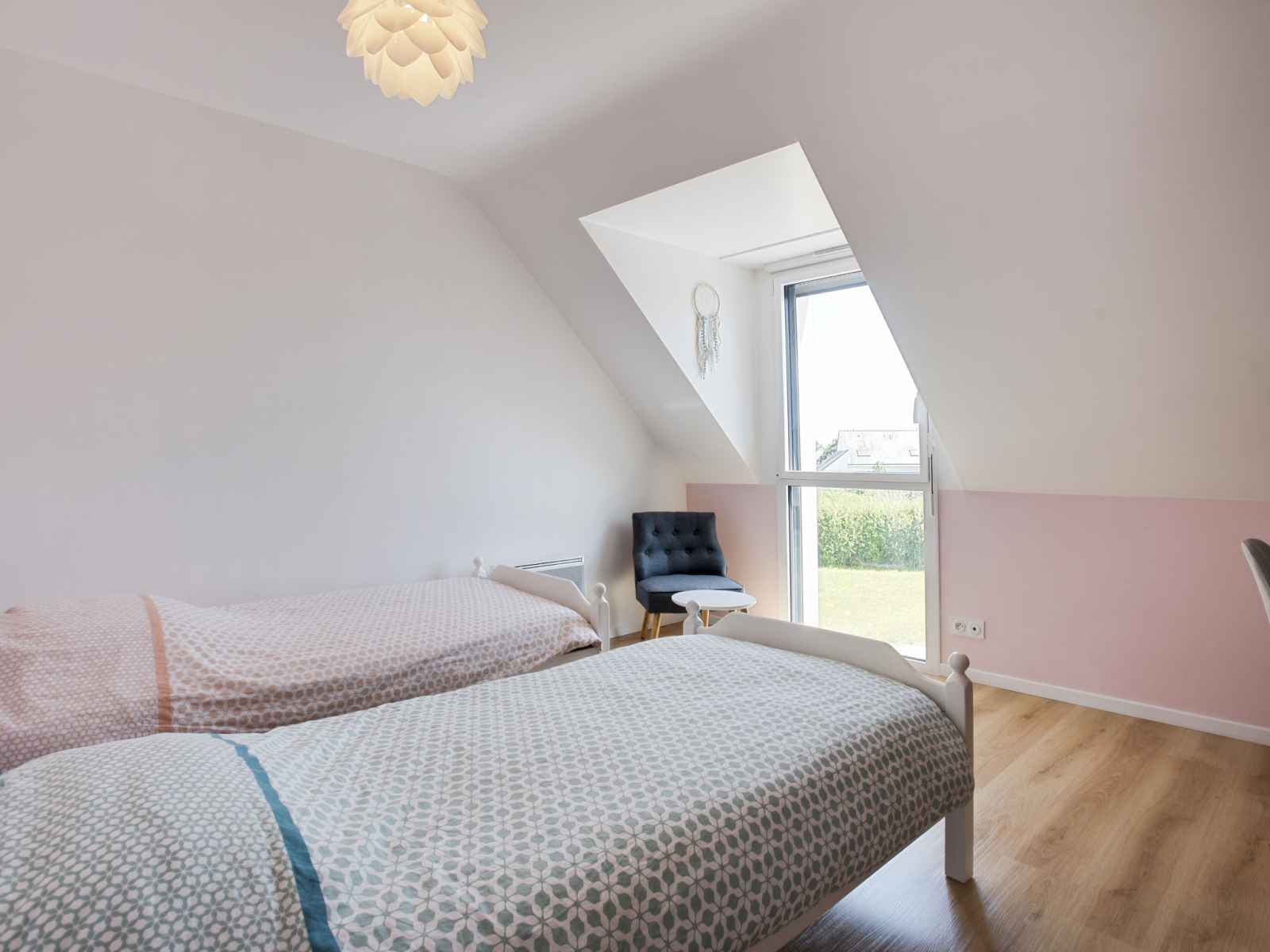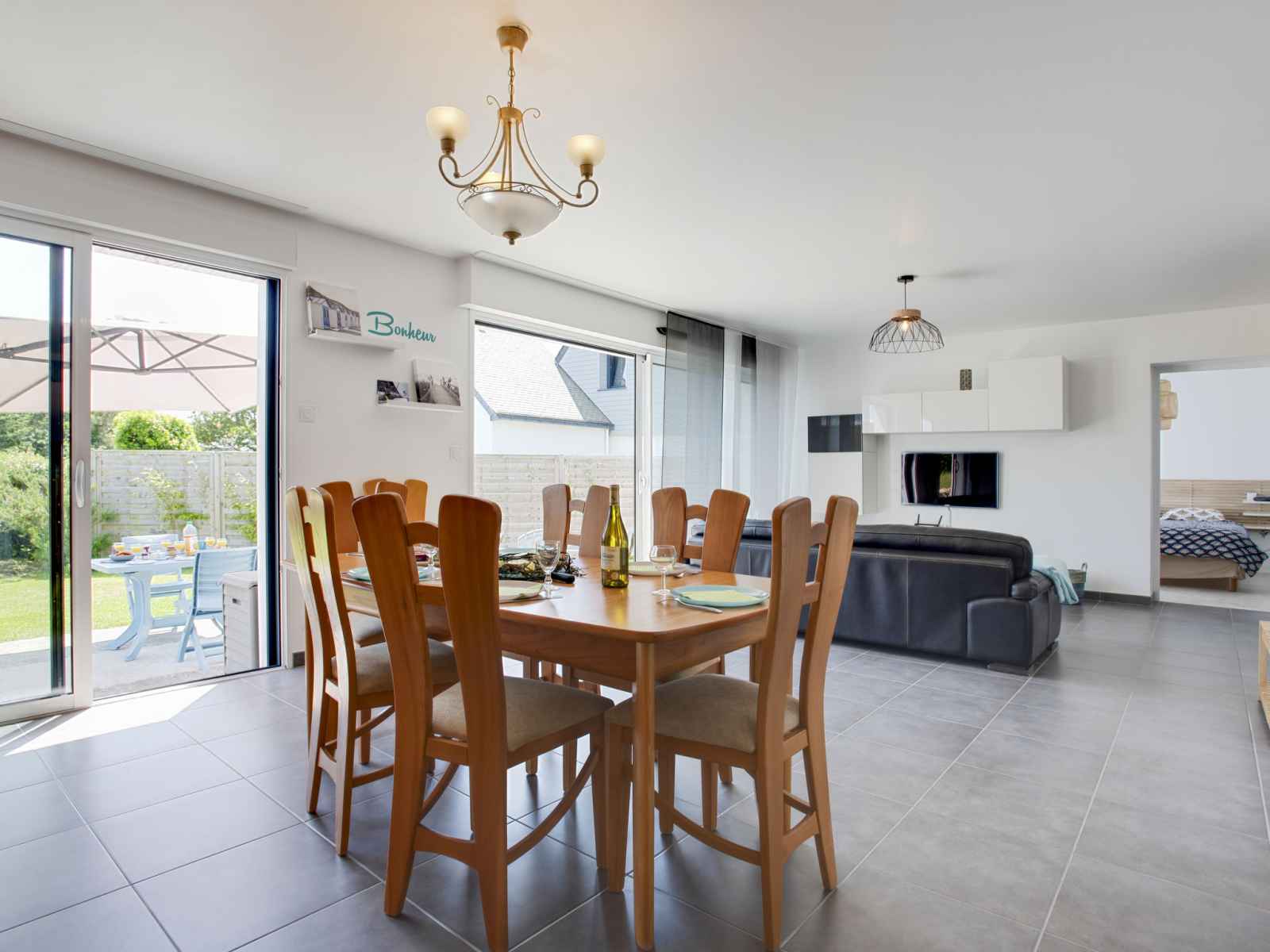 Maison 4 pièces 105 m2 sur 2 niveaux. aménagement agréable: séjour/salle à manger avec tv (écran plat). sortie sur le jardin. 1 chambre avec 1 grand-lit (1 x 160 cm, longueur 200 cm), douche. cuisine ouverte (four, lave-vaisselle, 4 plaques vitrocéramiques, micro-ondes, cafetière électrique). wc séparé. À l'étage supérieur: 1 chambre