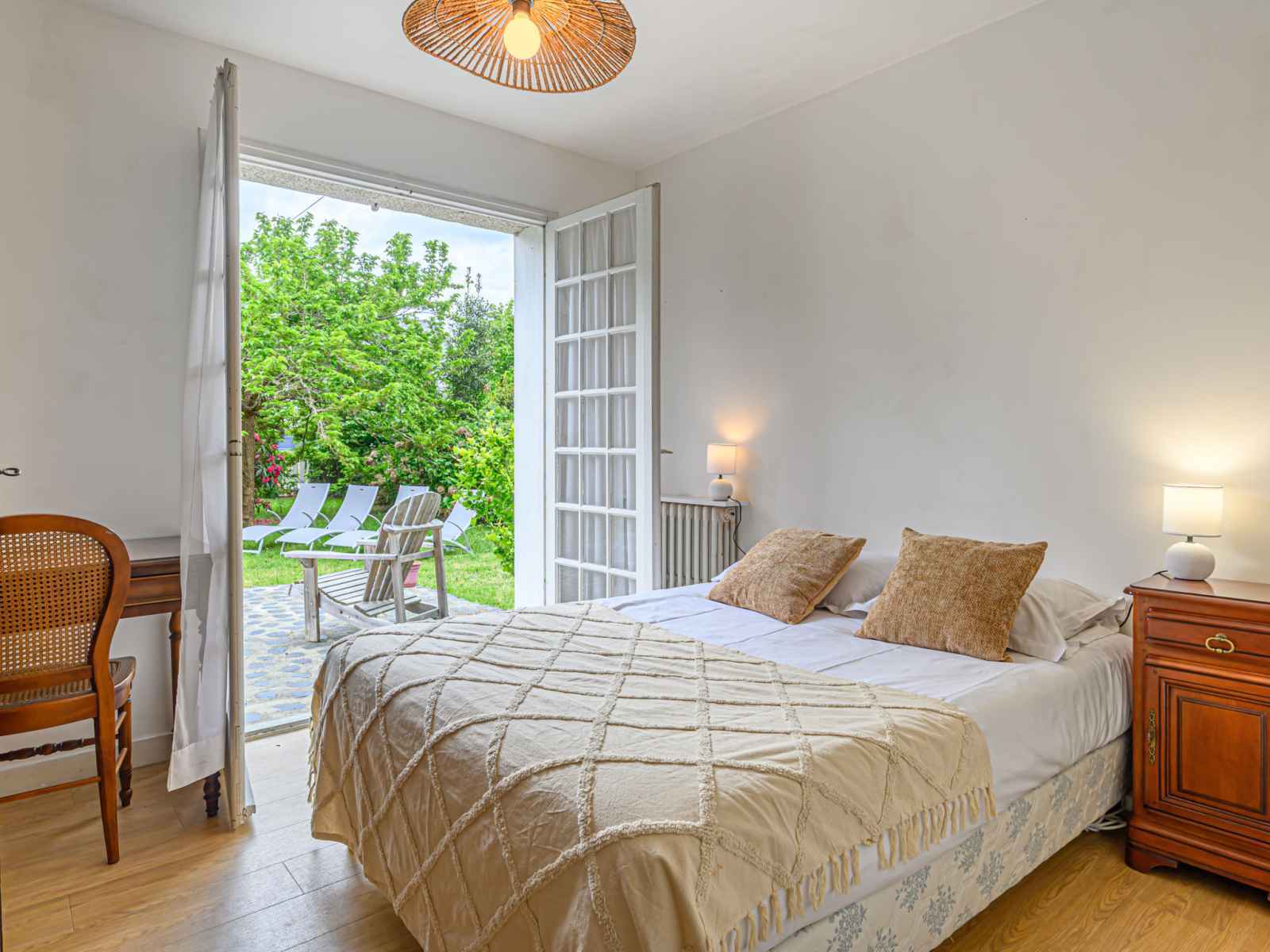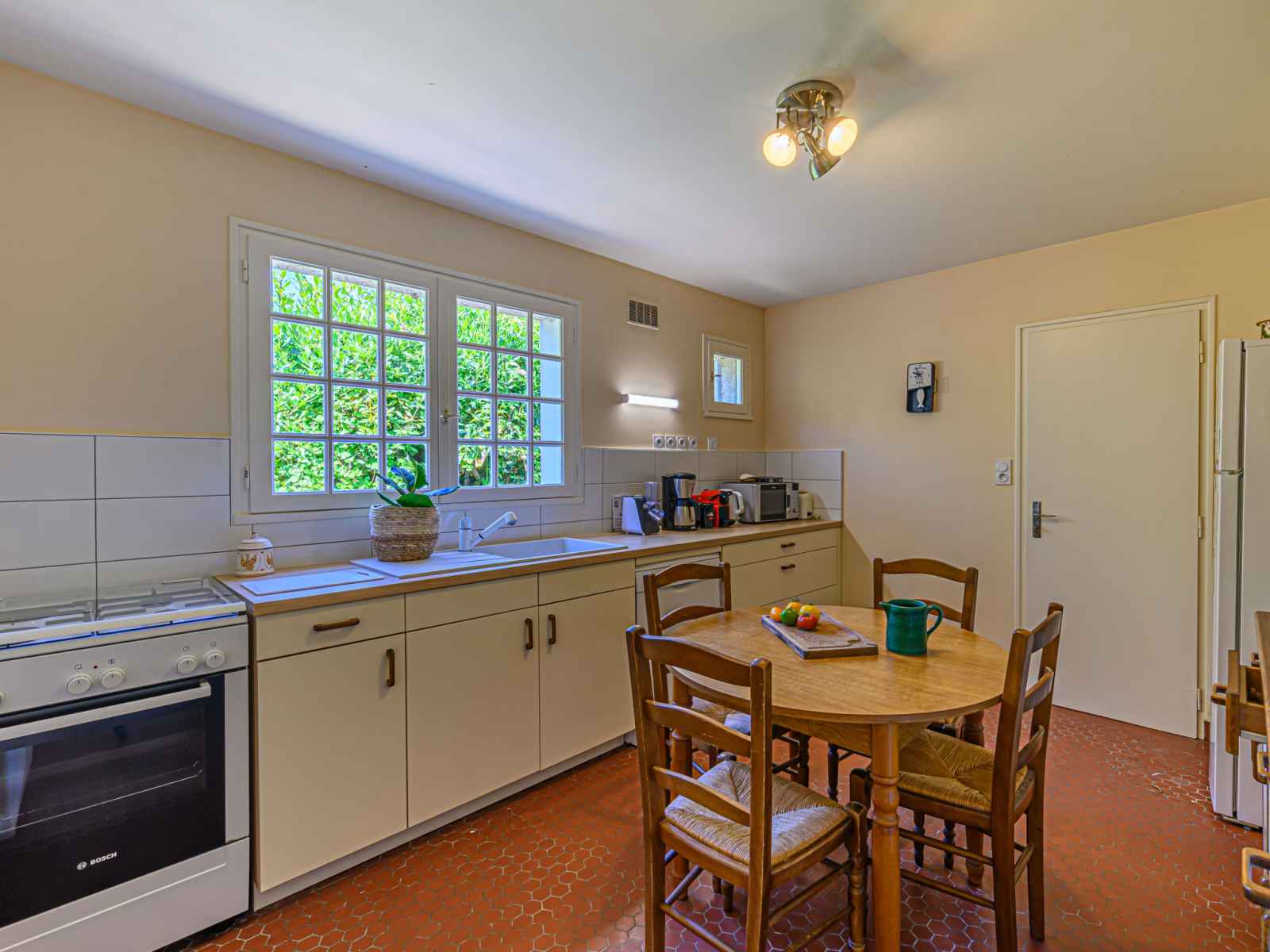 Villa 6 pièces 180 m2 sur 2 niveaux. aménagement confortable: séjour/salle à manger avec cheminée et tv (écran plat). sortie sur la terrasse. 1 chambre avec 1 grand-lit (1 x 140 cm, longueur 190 cm). sortie sur la terrasse. 1 chambre avec 2 lits (90 cm, longueur 190 cm). cuisine (four, 4 feux, grille-pain, bouilloire électrique, cafetière