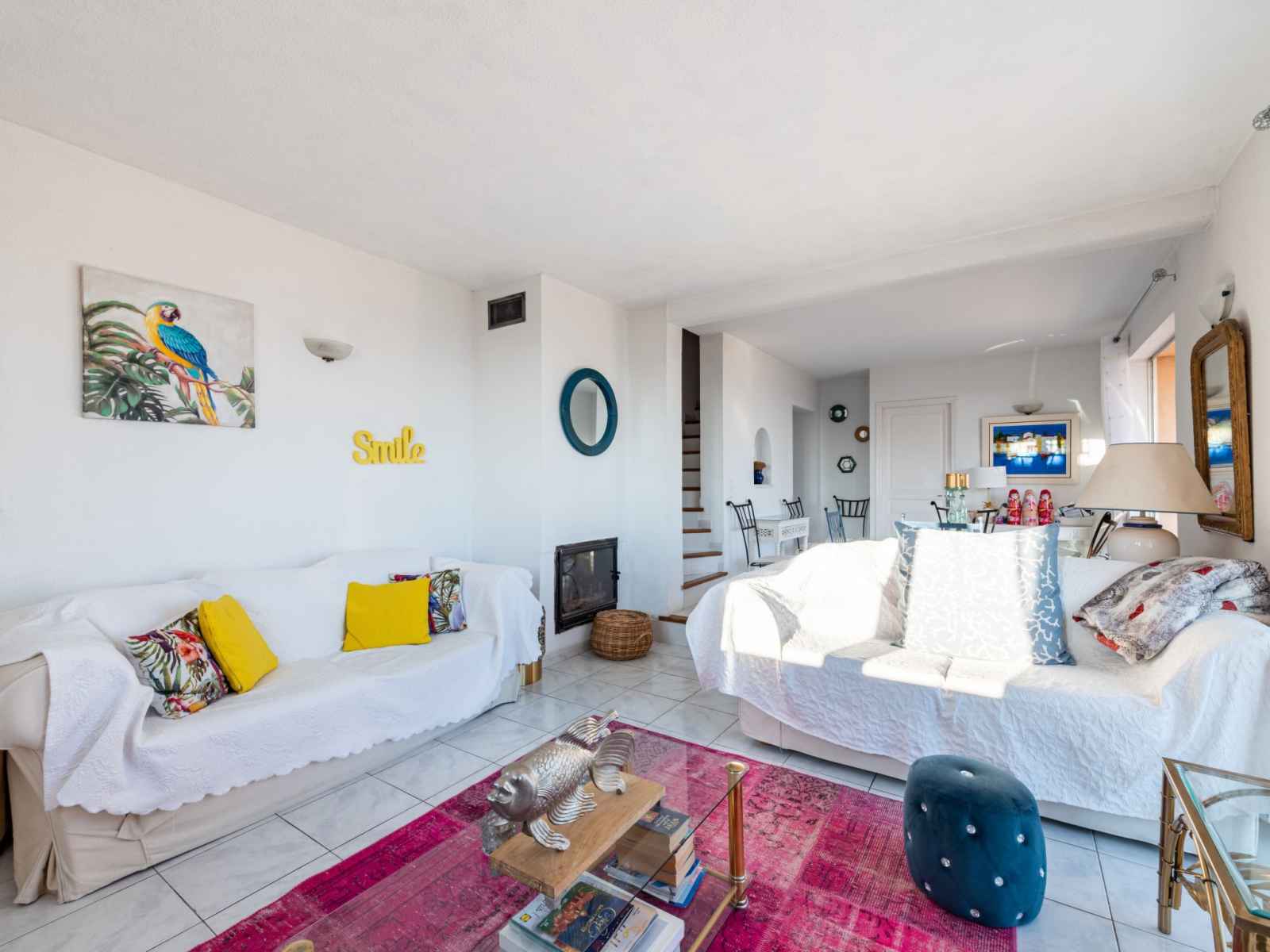 bain/WC. 1 chambre avec 1 lit double (2 x 90 cm, longueur 190 cm), baignoire sabot/WC. Cuisine (mini-four, lave-vaisselle, 4 plaques vitrocéramiques, grille-pain, bouilloire électrique, micro-ondes, congélateur, cafetière électrique, Capsules pour machine à café (Expresso) (NON INCLUSES)). À l'étage supérieur: 1 chambre avec 1 grand-lit (140 cm, longueur 190 cm), salle de bains, bidet, WC séparés, chauffage électrique et air-conditionné. Sortie sur le balcon, sur la terrasse. Balcon 6 m2, situation sud, terrasse 12 m2, couverte, situation sud et situation ouest terrasse 12 m2. Meubles de terrasse, mobilier de balcon, barbecue électrique, chaises longues (6). Très belle vue sur la mer et les alentours. A disposition: lave-linge, fer à repasser. Internet (Connexion WIFI, gratuit). Place de parking (couvert, cloturée, 2 Voitures). Veuillez noter: détecteur de fumée.