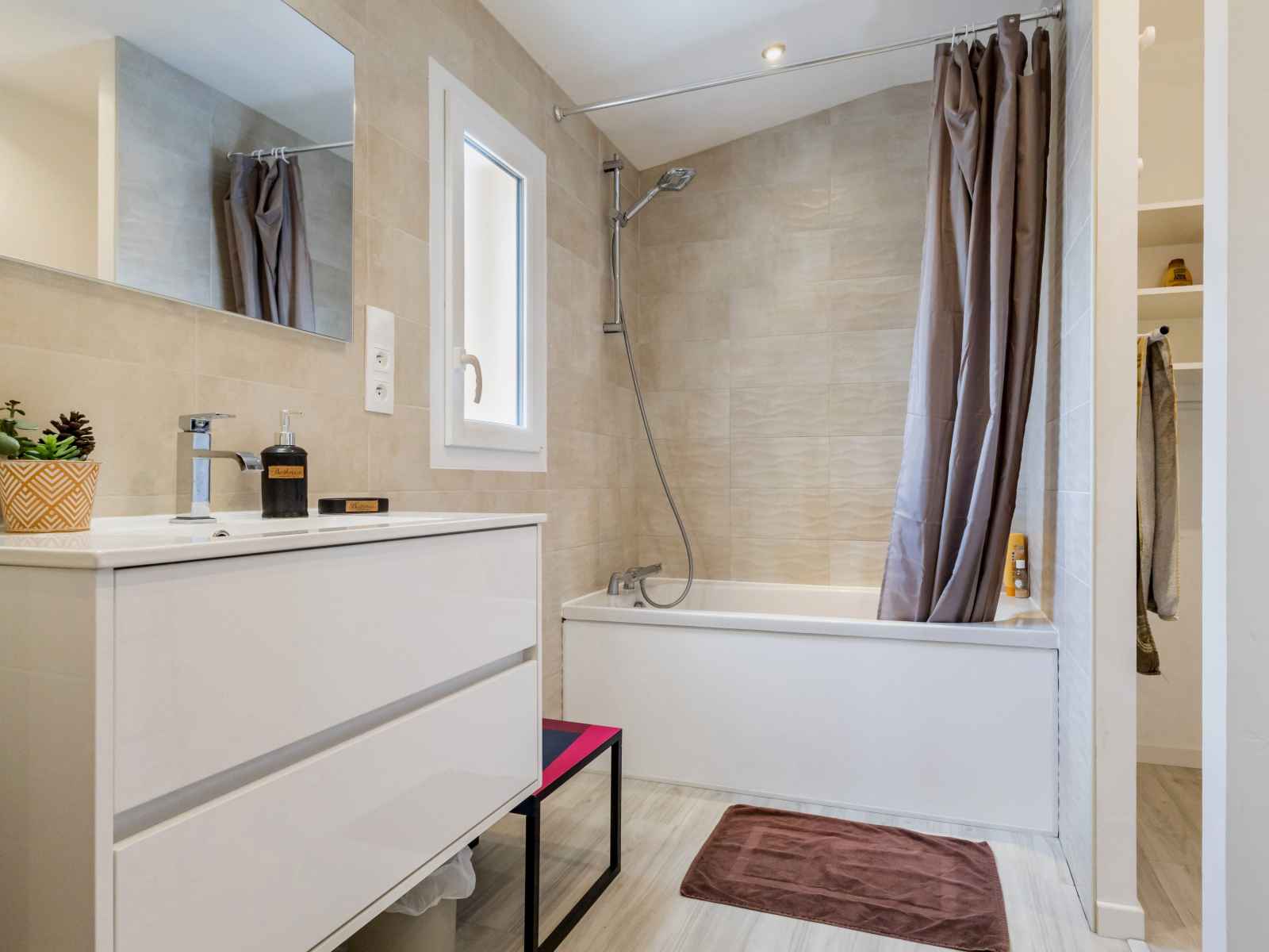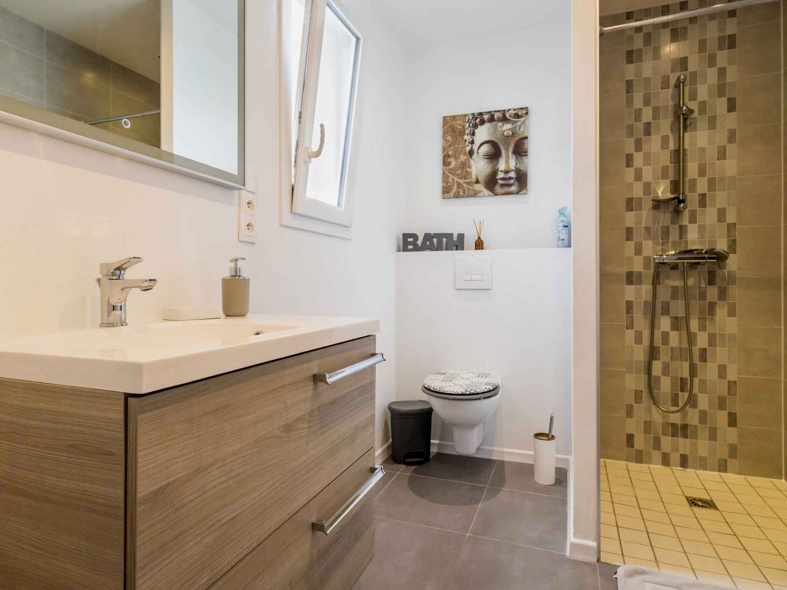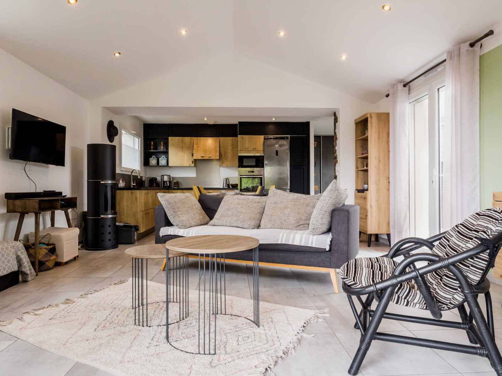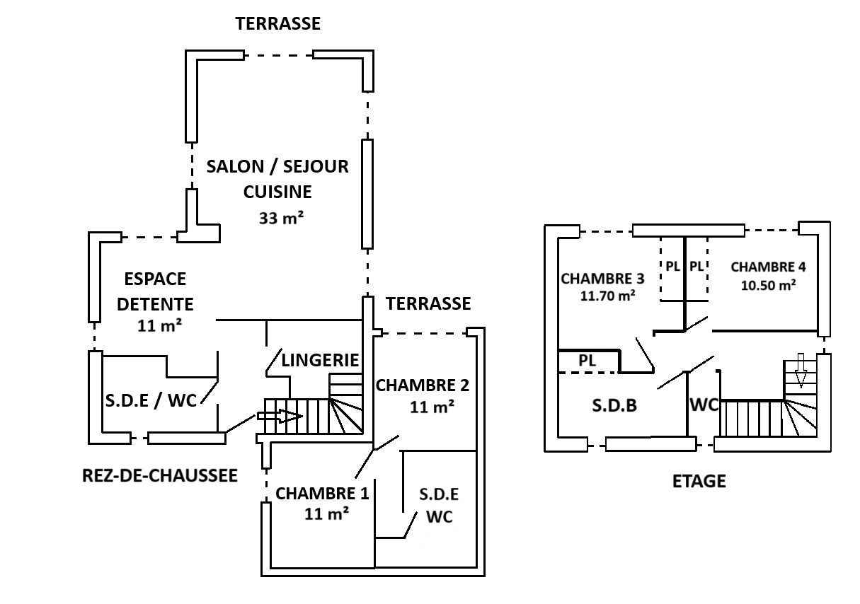 chambres dont 1 accessible par l'extérieur (chacune avec lit 140x190), salle d'eau/wc accessible depuis les 2 chambres, et salle d'eau/wc. Etage : 2 chambres (1: 2 lits 80x200 jumelables, 2: lit 160x200), salle de bains et WC indépendant. Equipements inclus : wifi, barre de son. Compris : draps, linge de toilette, électricité, chauffage électrique par le sol. Non compris : ménage fin de séjour et taxe de séjour. Animal accepté gratuitement (caution 100€).