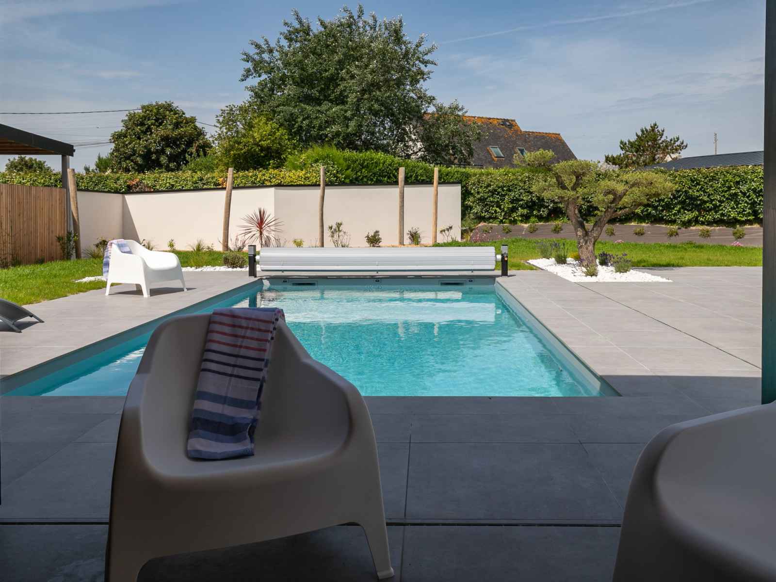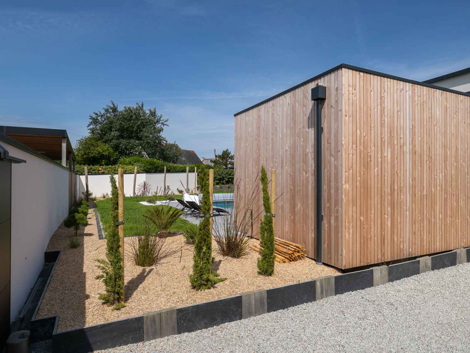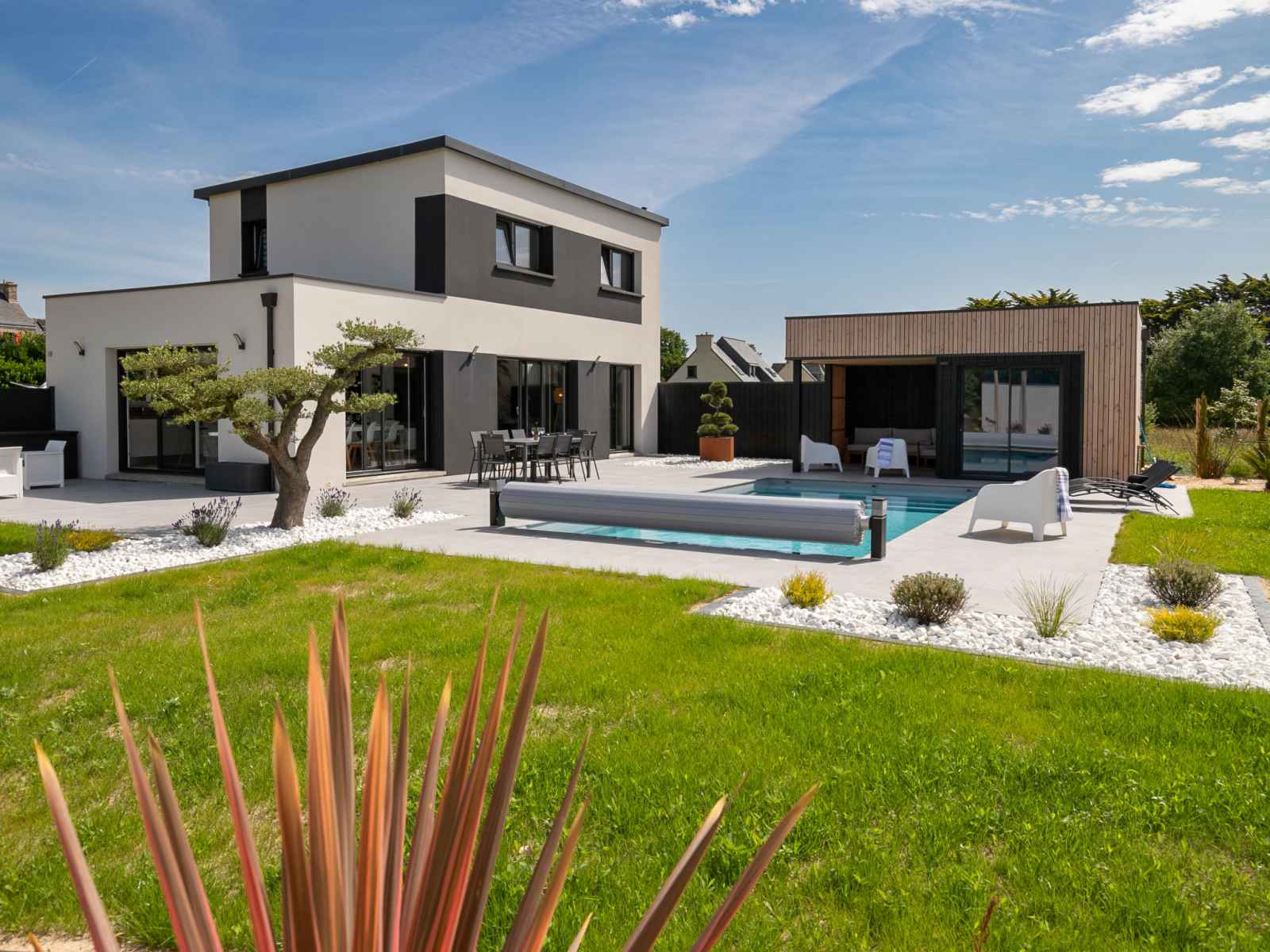 Belle maison individuelle moderne "villa ty coz". dans le quartier de kerfissien, à 6 km du centre de cléder, situation tranquille dans un quartier résidentiel, à 400 m de la mer, à 400 m de la plage. a usage privé: terrain 1'300 m2, jardin avec pelouse et plantes, piscine rectangulaire, chauffée (4 x 8 m, 32 m2, profondeur 150 cm,