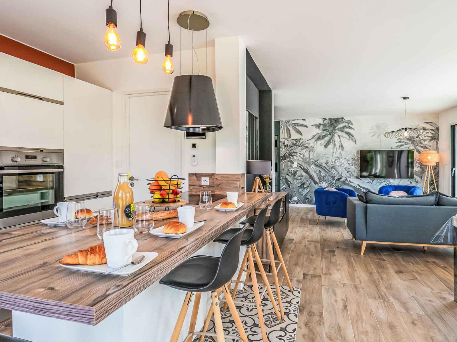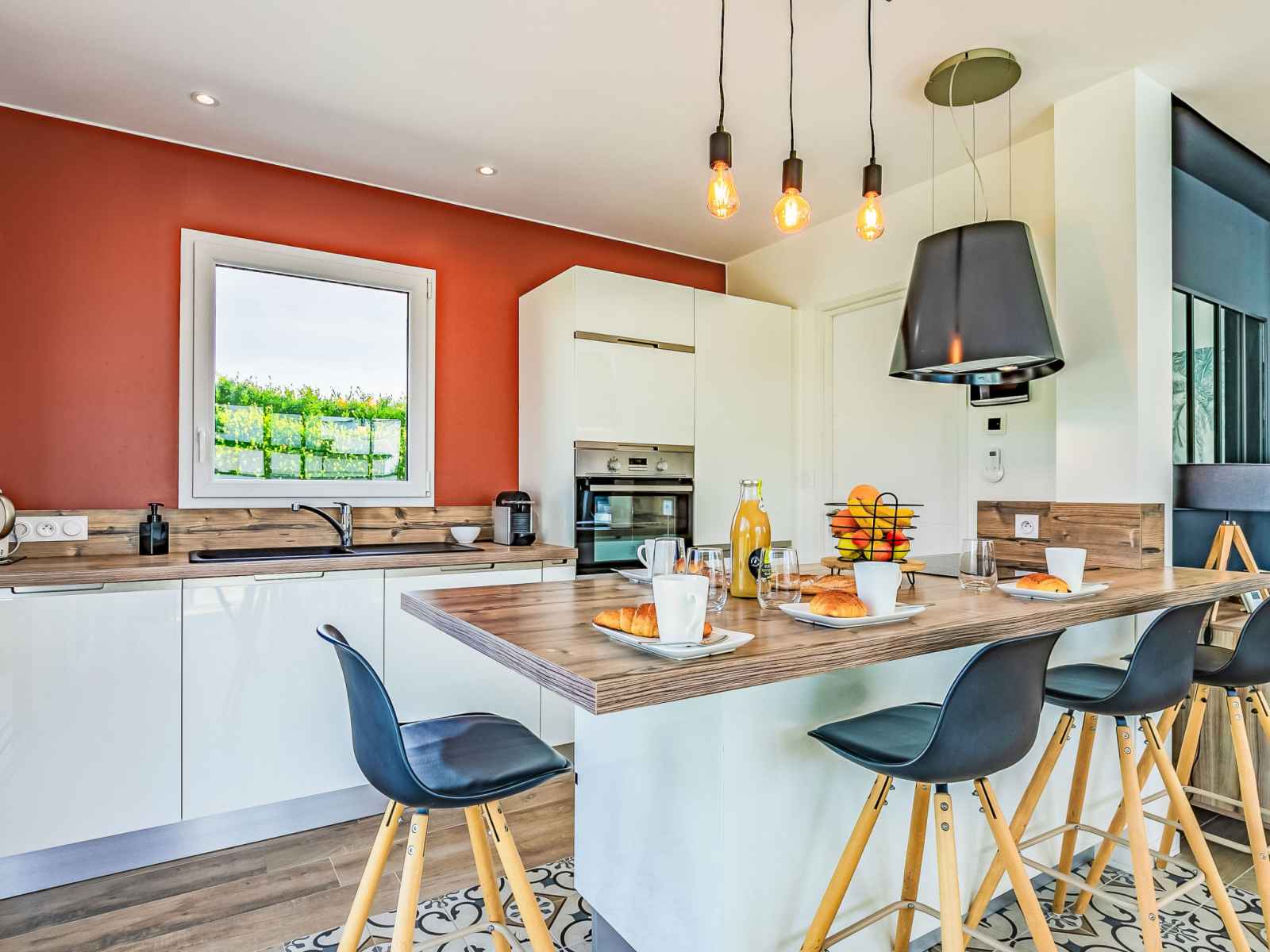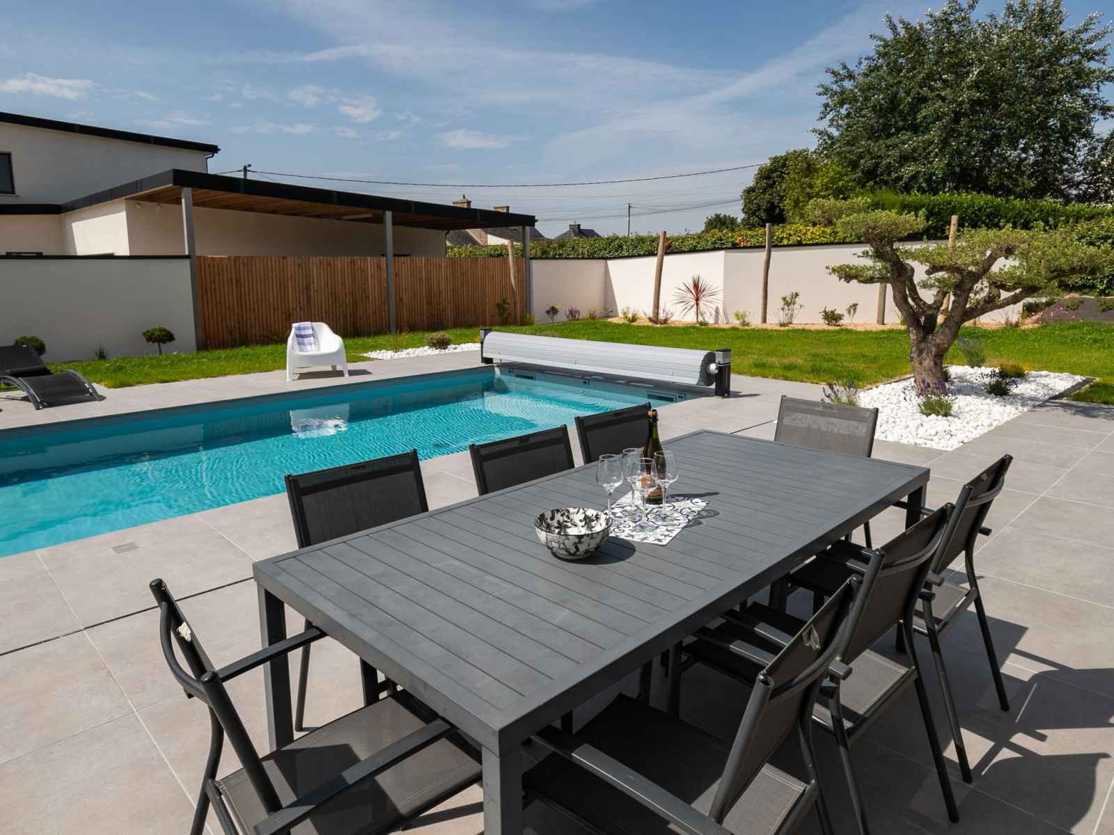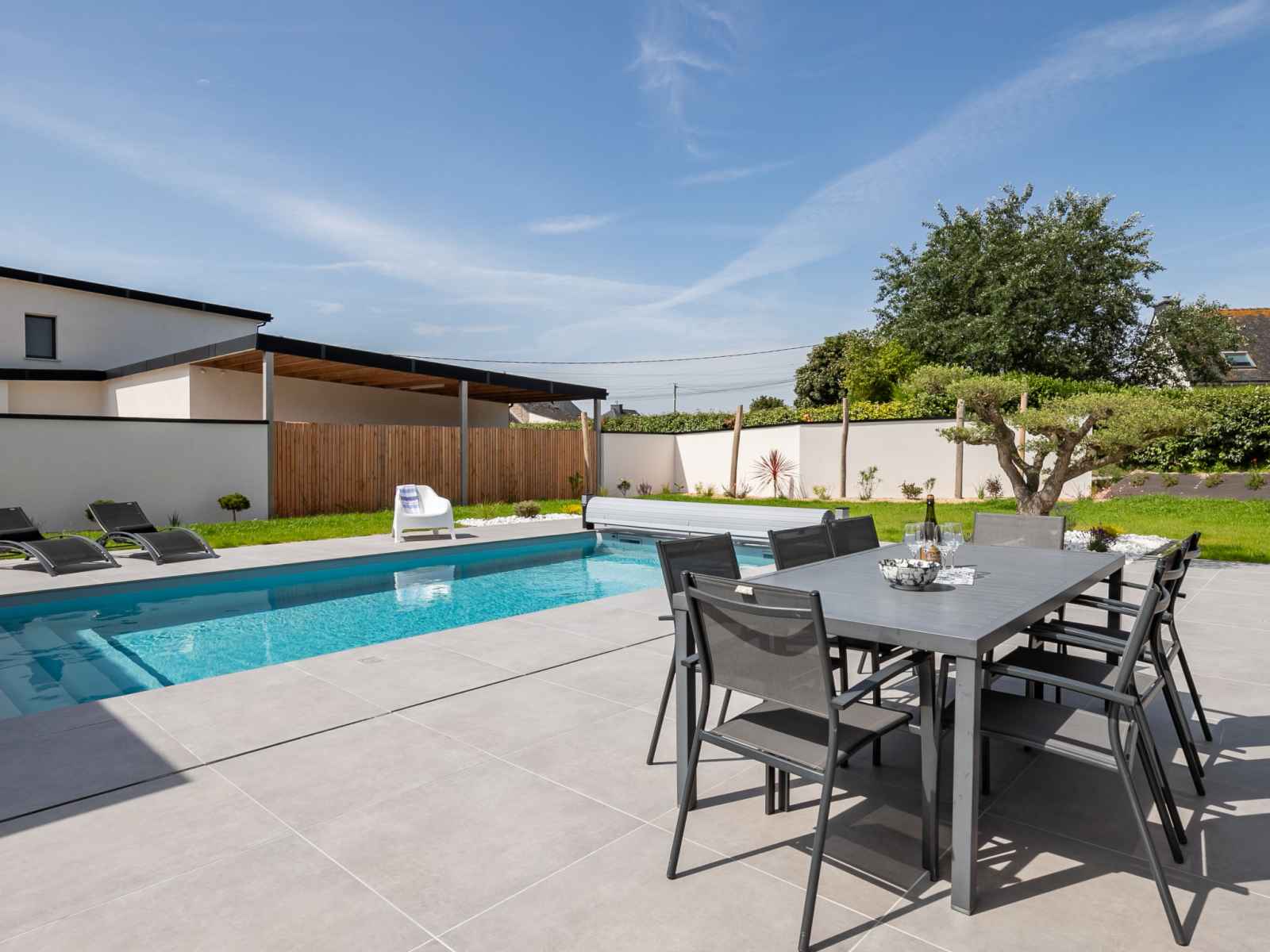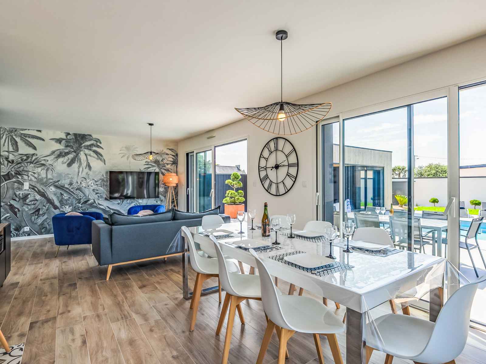 "villa ty coz", maison 5 pièces 110 m2. clair, aménagement confortable et moderne: grand séjour/salle à manger avec table pour les repas, télévision numérique et écran plat. sortie sur la terrasse, sur la piscine. 1 chambre avec 1 grand-lit (160 cm, longueur 200 cm). sortie sur la terrasse. cuisine ouverte (four, lave-vaisselle, 3 plaques