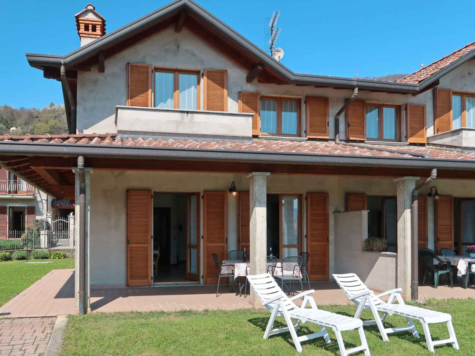 Grande maison jumelée "le villette", de 2 étages. dans le quartier de pomano, à 700 m du centre de dongo, à 48 km du centre de como, à 40 km du centre de lugano, dans un quartier résidentiel, à 450 m du lac, dans une impasse. en commun: terrain (clôturé) avec pelouse. possibilité de chauffage uniquement du 15.oct. - 15.avr.. accès en