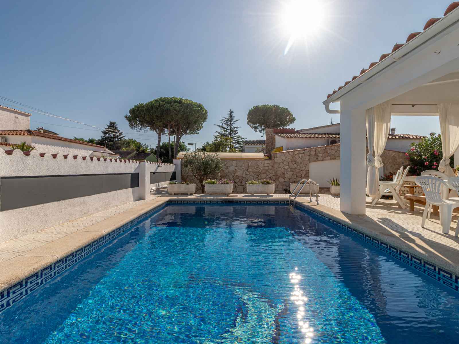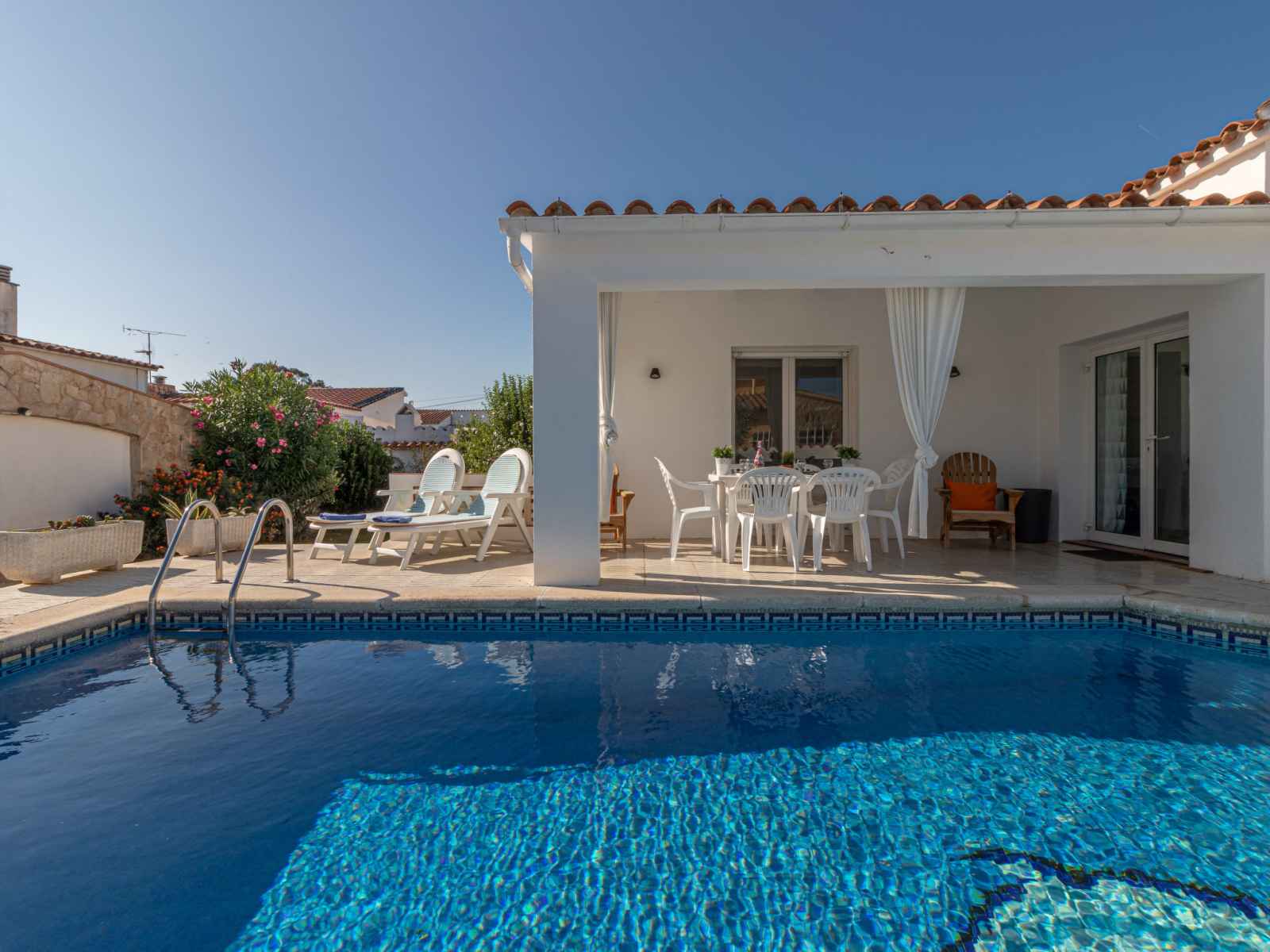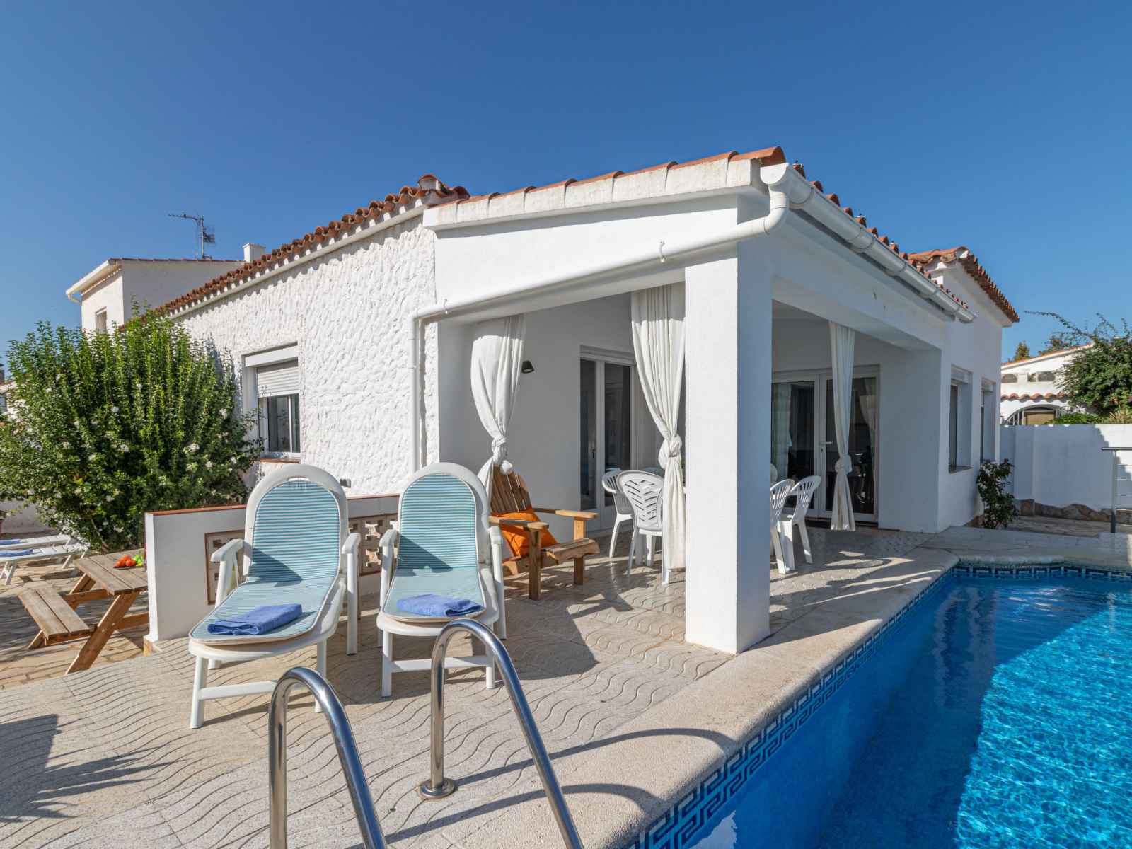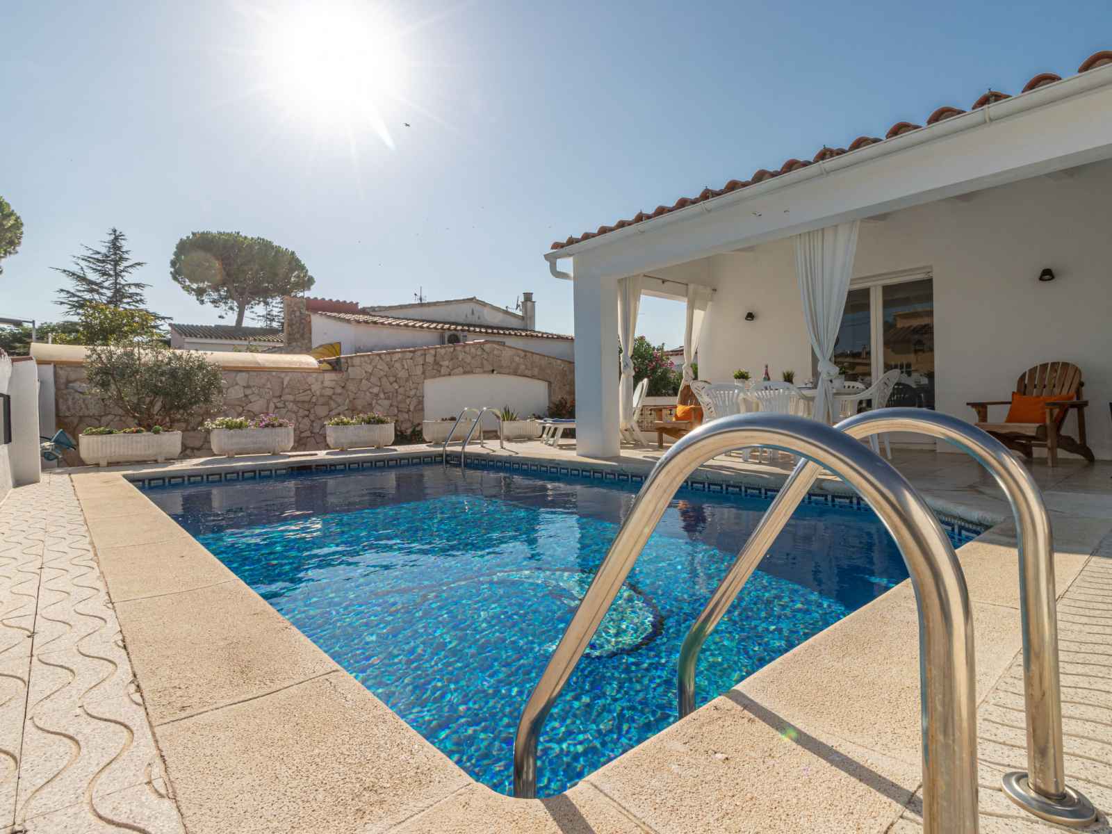 plantes, piscine rectangulaire (4 x 7 m, disponibilité saisonnière: 01.jan. - 31.dec.). douche extérieure, pergola, terrasse, meubles de jardin, barbecue. infrastructures de la maison: lave-linge. place de parking (pour 2 voitures) sur le terrain. magasins 550 m, magasin d'alimentation, supermarché 1 km, centre commercial 800 m, restaurant 350 m, bar, boulangerie 550 m, café, arrêt de bus 300 m, plage de sable "empuriabrava" 800 m. port plaisance 3 km, terrain de golf (18 trous) 5 km, tennis 2 km, golf miniature 800 m, piste cyclable 250 m. attractions à proximité: túnel del viento y skydive empuriabrava 2 km, parque acuático roses 6 km, casino y festival de peralada 12 km, museo dalí figueres 15 km, ruïnes d'empuries 21 km, monasterio de sant pere de rodes 23 km. la remise des clés a lieu à l’agence interhome d'empuriabrava.