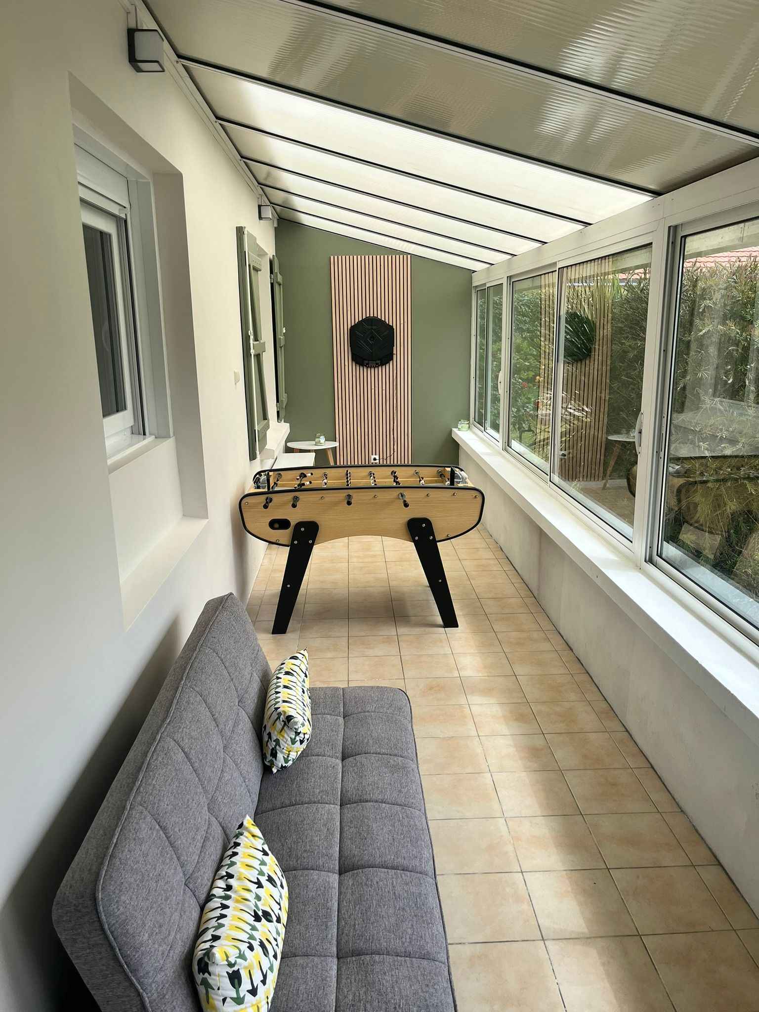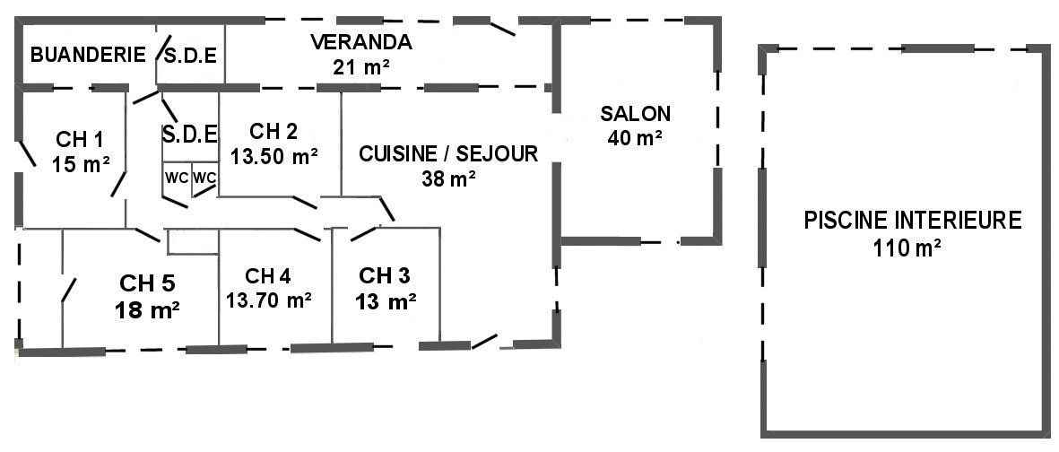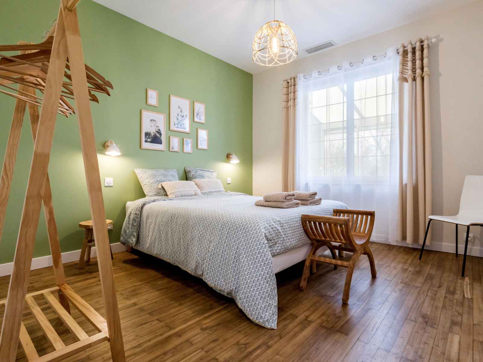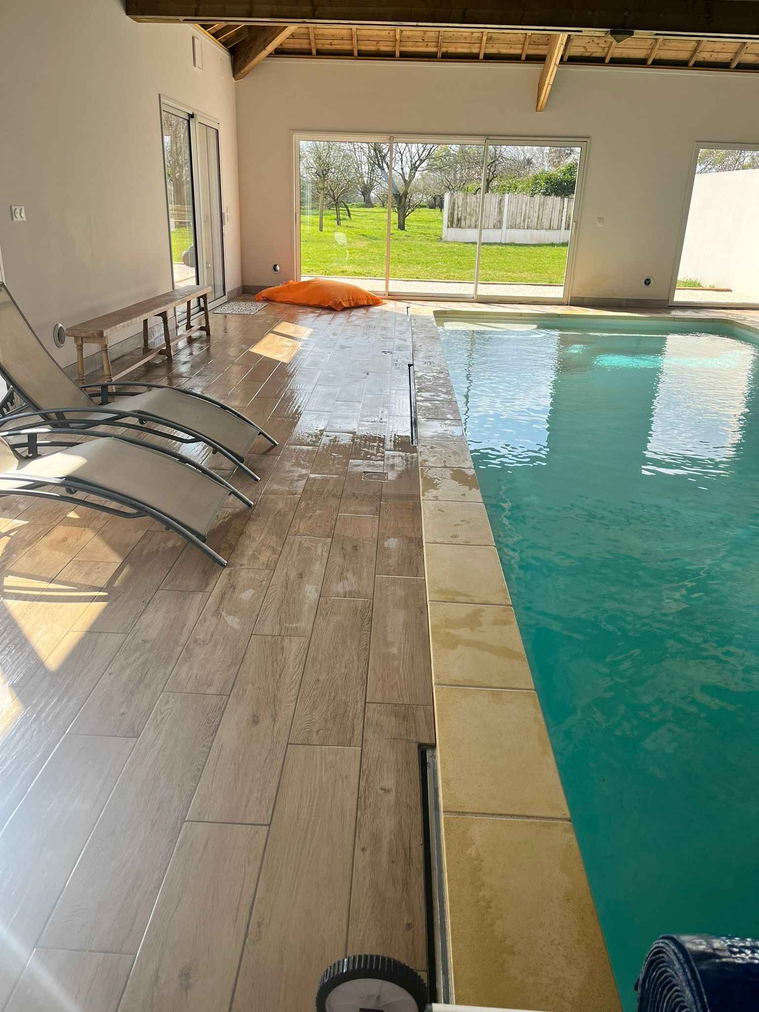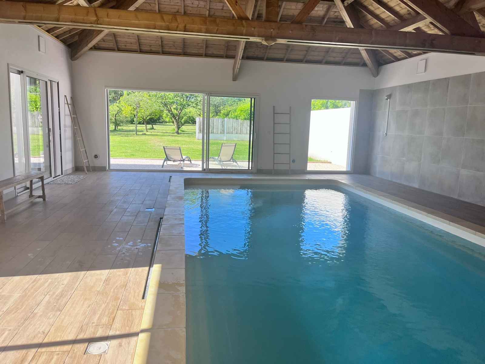 un bâtiment annexe, piscine intérieure privative chauffée, ouverte toute l'année (4x10 m). Plain pied: cuisine aménagée ouverte sur séjour, grand salon, véranda/coin détente (non chauffée), 5 chambres (1 et 2: lit 160x200, 3 : lit 140x190, 4: lit 160x200, 5: 4 lits 90x190), 2 salles d'eau, 2 WC indépendants et buanderie. Equipements inclus: wifi, sèche-linge, congélateur, lit/chaise bébé, climatisation, baby-foot & jeu de fléchettes. Tout compris: électricité, chauffage électrique, draps (lits faits à l'arrivée), linge de toilette et ménage fin de séjour. Serviettes de piscine non comprises.