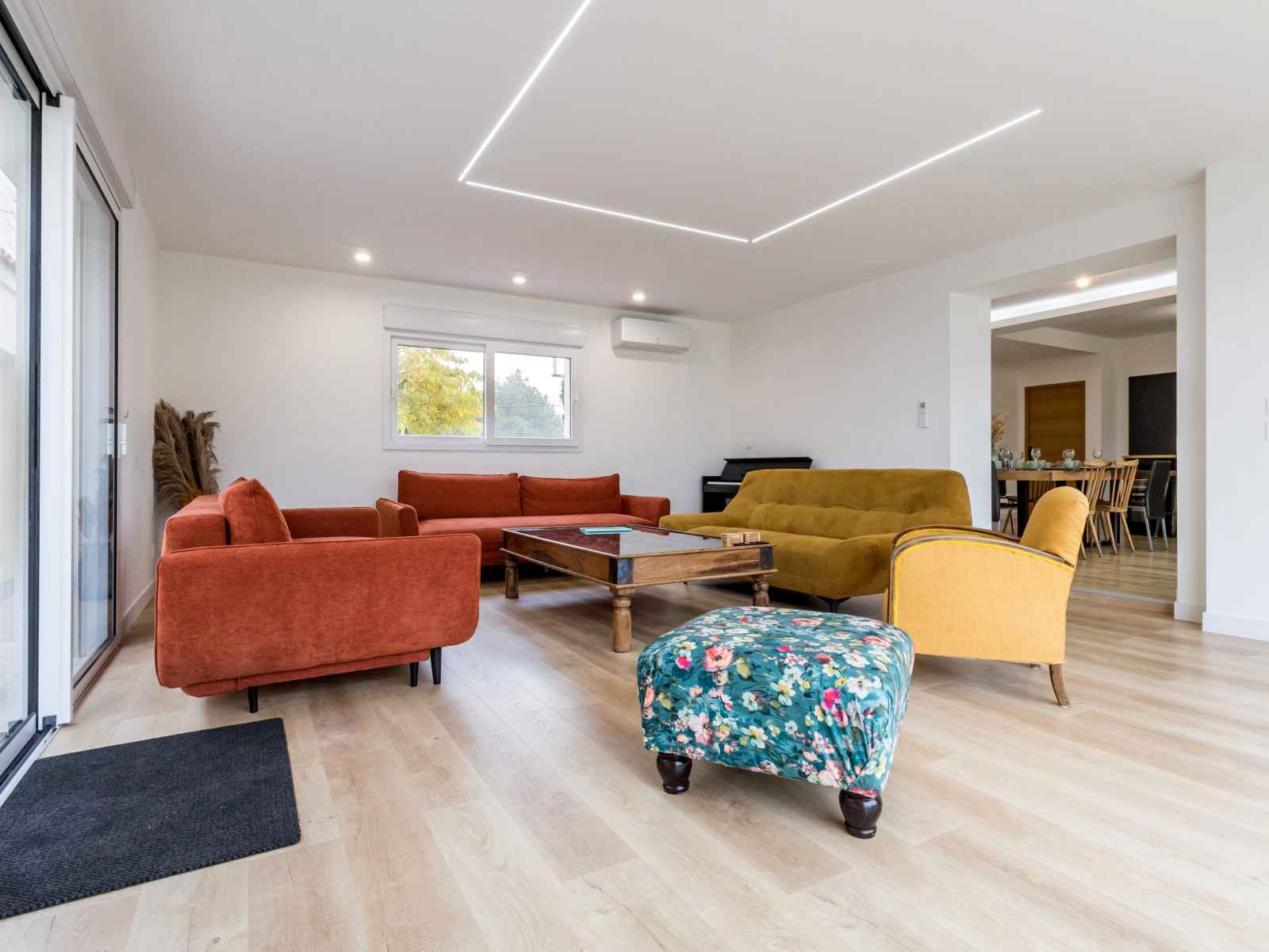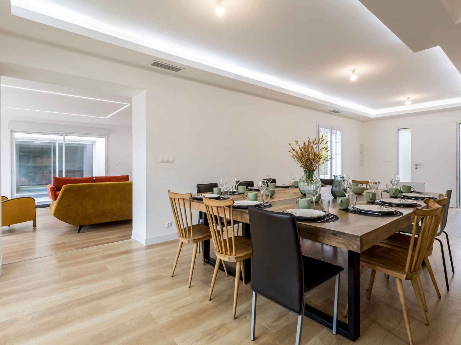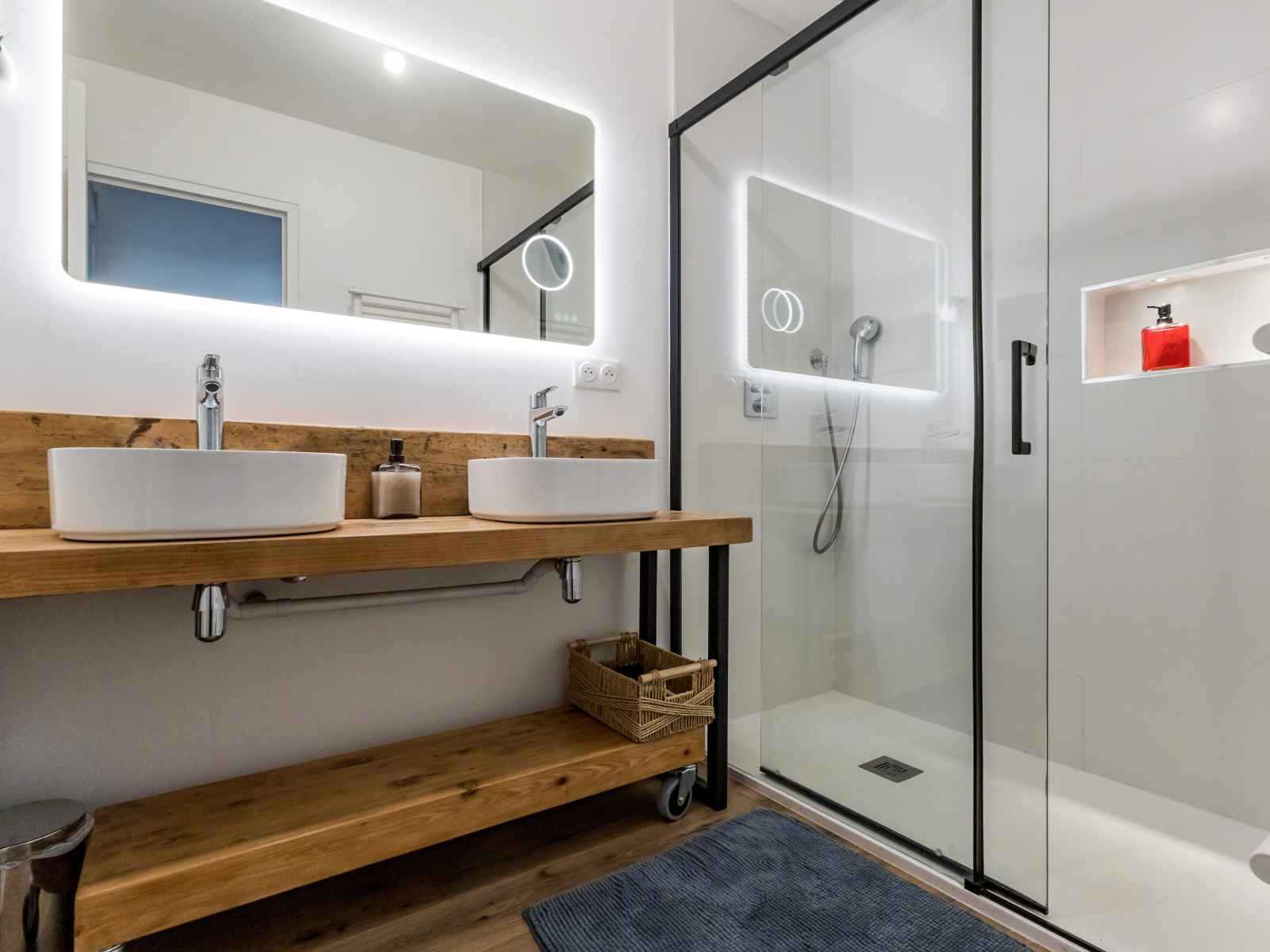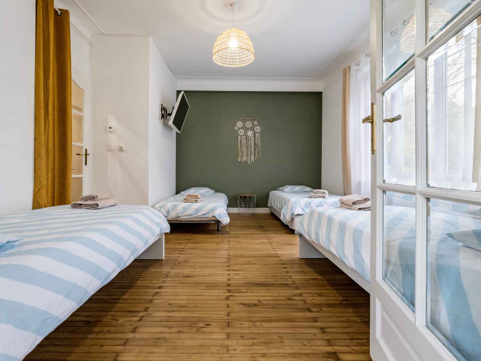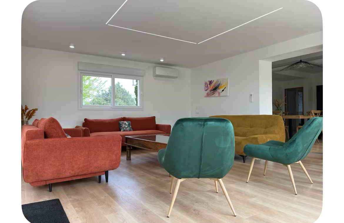 un bâtiment annexe, piscine intérieure privative chauffée, ouverte toute l'année (4x10 m). Plain pied: cuisine aménagée ouverte sur séjour, grand salon, véranda/coin détente (non chauffée), 5 chambres (1 et 2: lit 160x200, 3 : lit 140x190, 4: lit 160x200, 5: 4 lits 90x190), 2 salles d'eau, 2 WC indépendants et buanderie. Equipements inclus: wifi, sèche-linge, congélateur, lit/chaise bébé, climatisation, baby-foot & jeu de fléchettes. Tout compris: électricité, chauffage électrique, draps (lits faits à l'arrivée), linge de toilette et ménage fin de séjour. Serviettes de piscine non comprises.