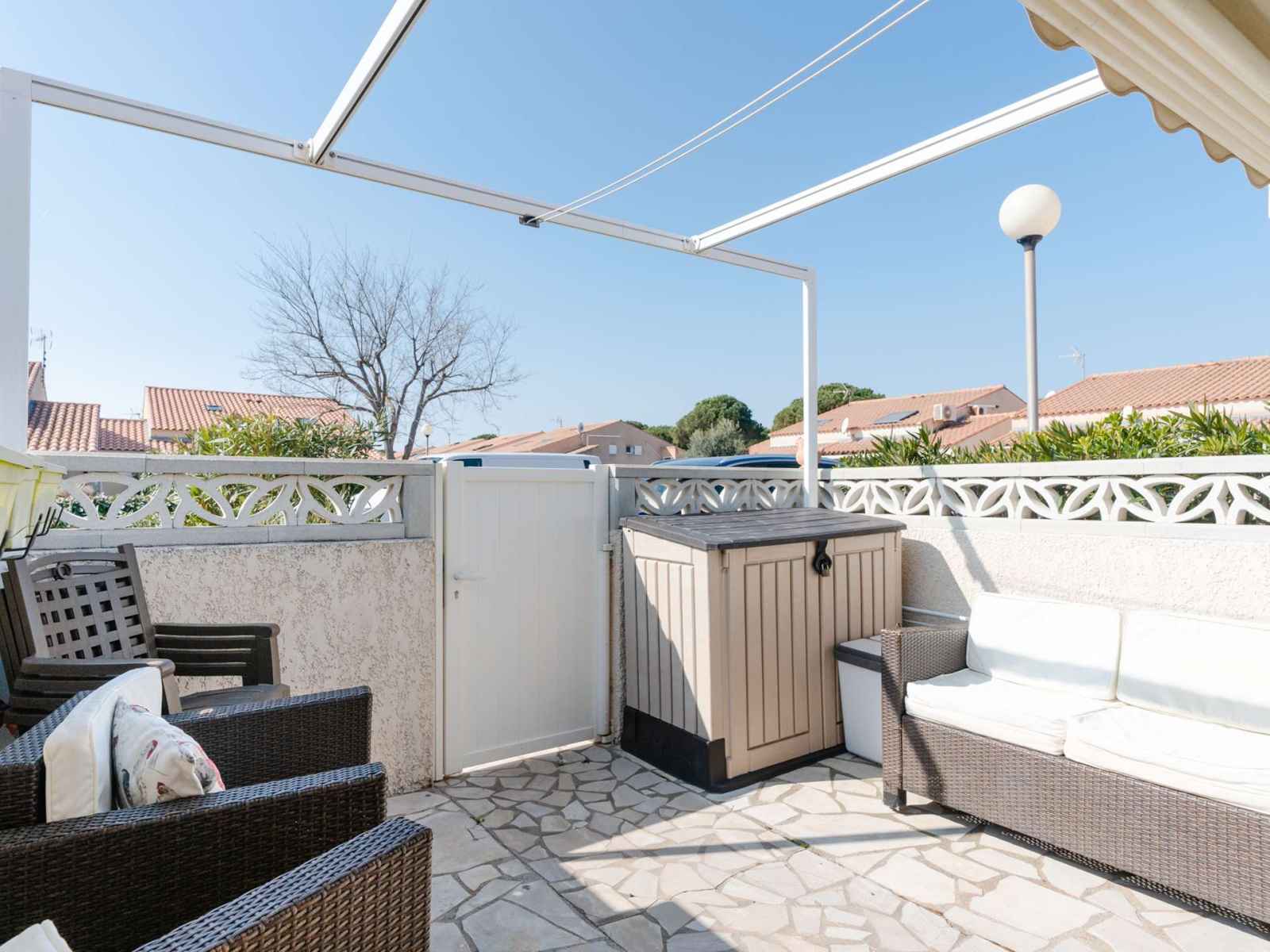 la terrasse avec store-banne dispose d'un salon de jardin;