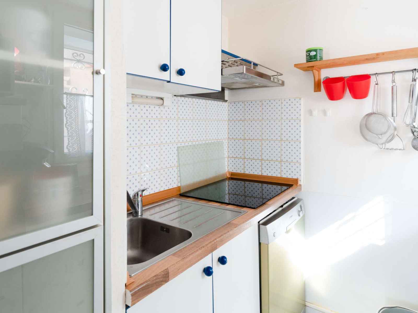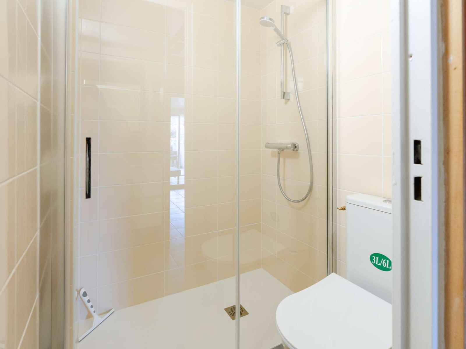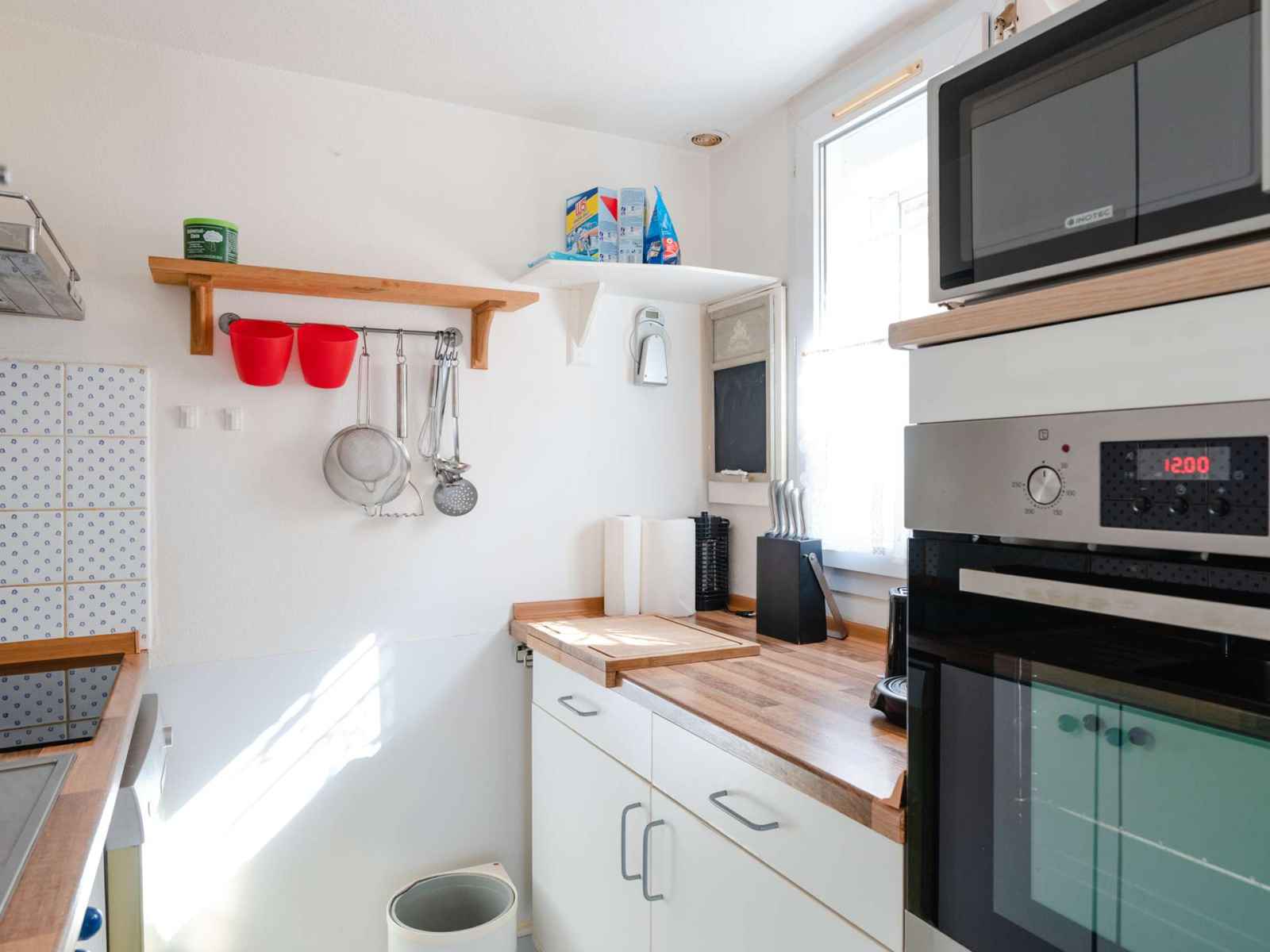 la véranda est équipée d'un canapé clic-clac (couchage 140x190), d'une TV (chaines allemandes et françaises). L'espace cuisine-repas dispose d'une table avec chaises, une commode, et une cuisine équipée (plaque de cuisson 4 feux vitro-céramique, hotte aspirante, cafetière Senseo, grille-pain, bouilloire, réfrigérateur avec compartiment congélateur, four, micro-ondes, lave-linge et lave-vaisselle). La salle d'eau avec douche et WC se situe au rez-de-chaussée.