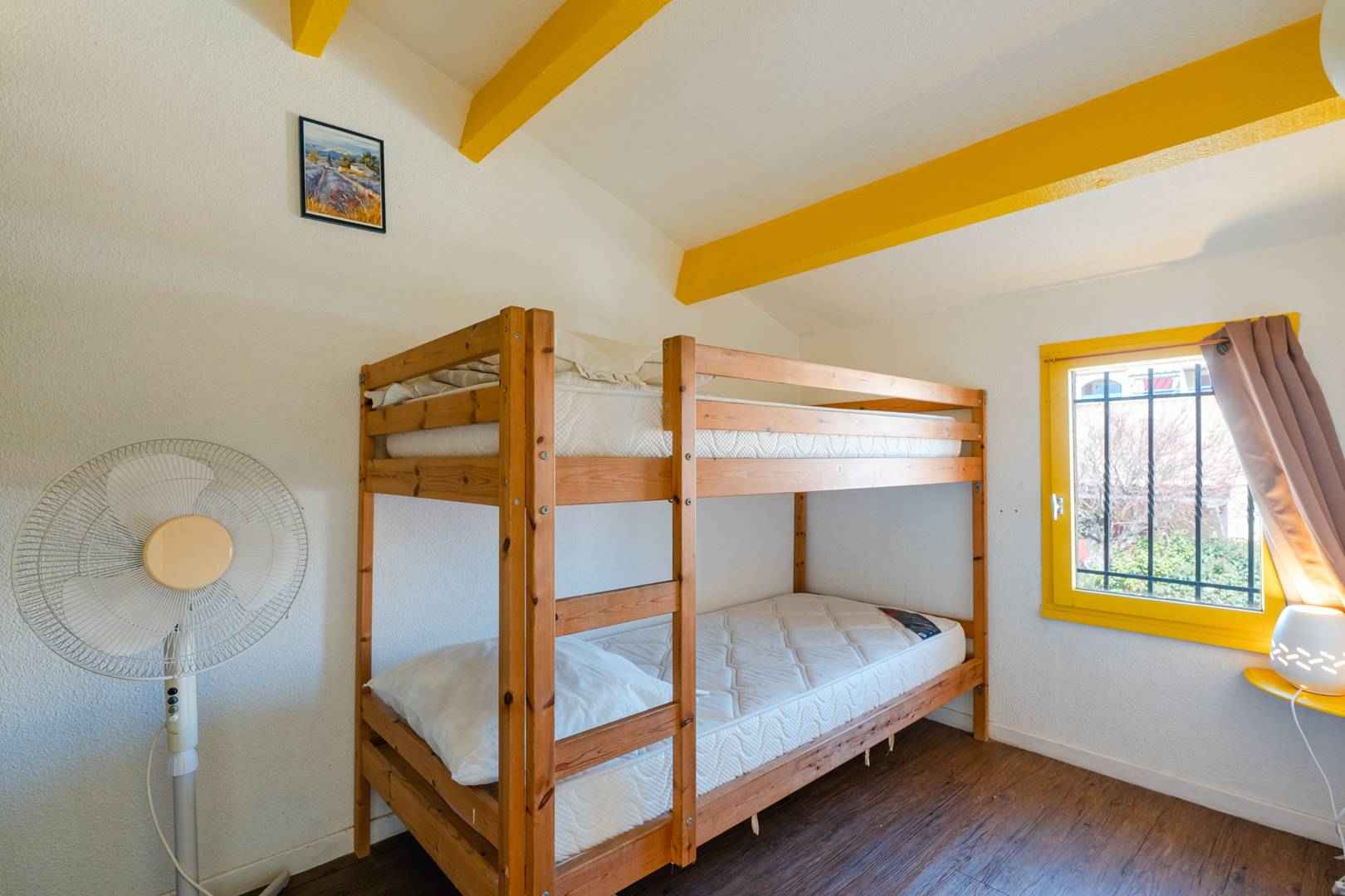 A l'étage : Deux chambres (une avec lit double en 160x200 + 1 TV,une avec deux lits superposés)et une cabine avec un lit simple communiquant avec la chambre double, une salle d'eau avec lavabo, lave linge et WC.