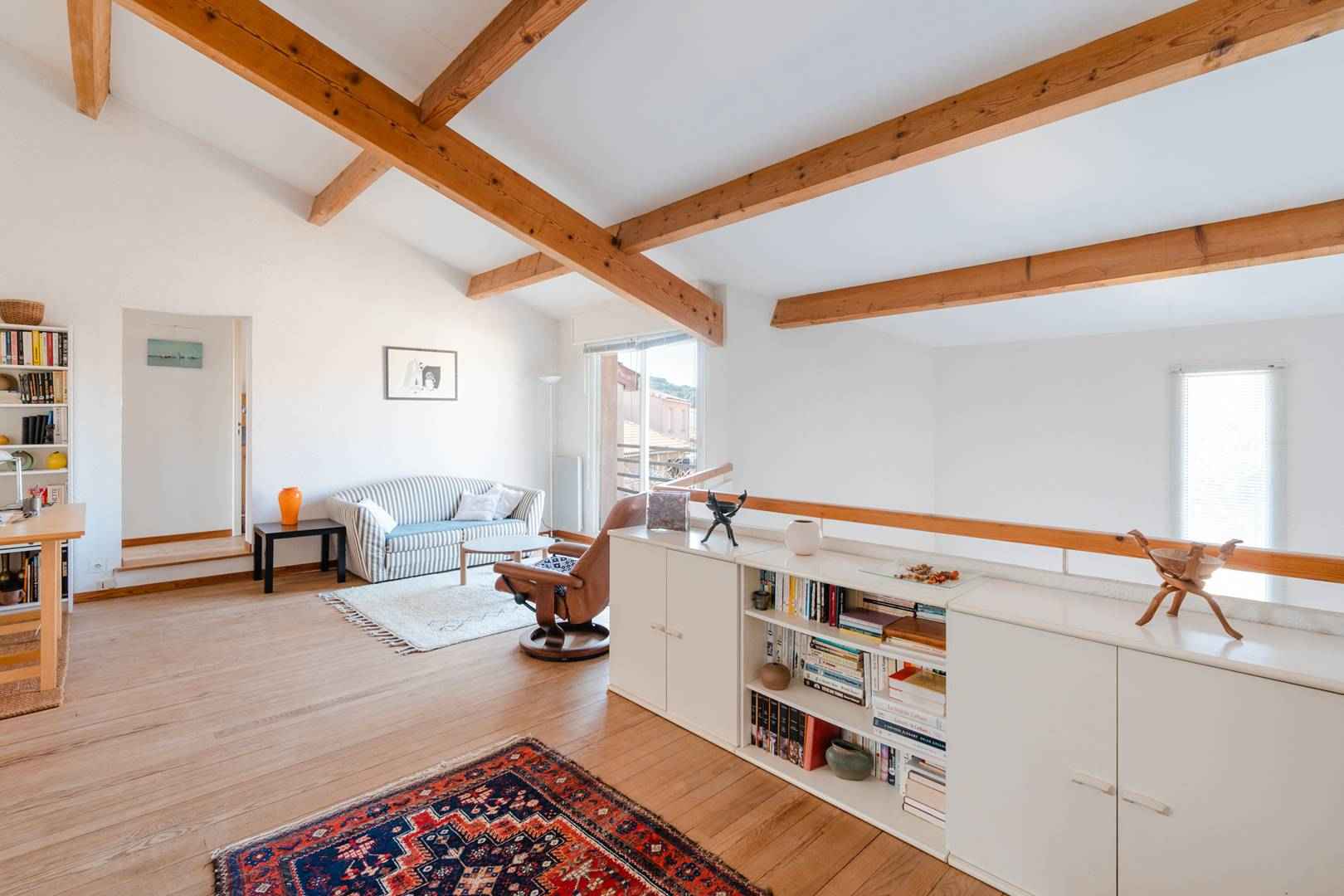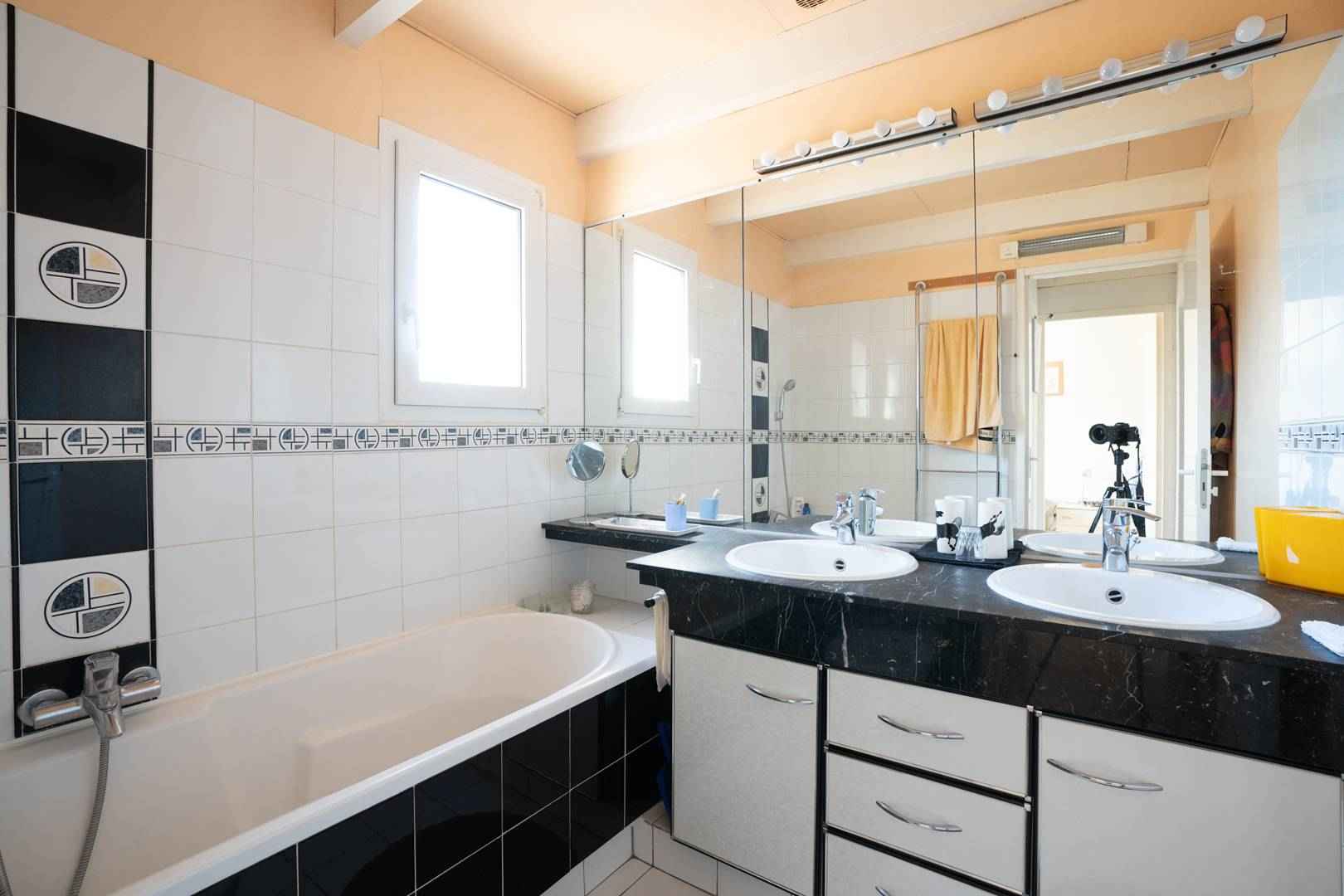 A l'étage, un salon ouvert sur le bas, une seconde chambre avec un lit double (140x190cm), une troisième chambre avec un accès à la terrasse avec deux lits simples (90x190cm), placard et une dernière chambre avec des lits superposés (90x190cm), bureau et placard. Une salle de bain (bidet, baignoire, double vasques) et des WC séparés complètent l'étage.