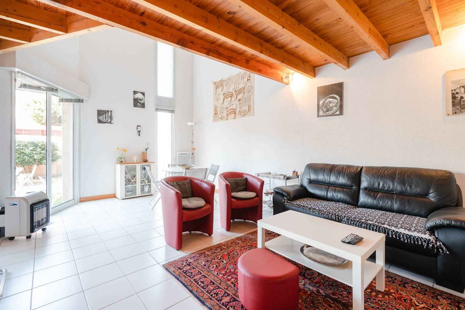 Un grand séjour avec climatisation, divan, TV (chaînes françaises), et une cuisine américaine entièrement équipée (frigo, four, micro-ondes, plaques à induction, cafetière Senseo, bouilloire, lave vaisselle et lave-linge) avec table à manger donnent accès au grand jardin (salon de jardin, transats) sans vis-à-vis.