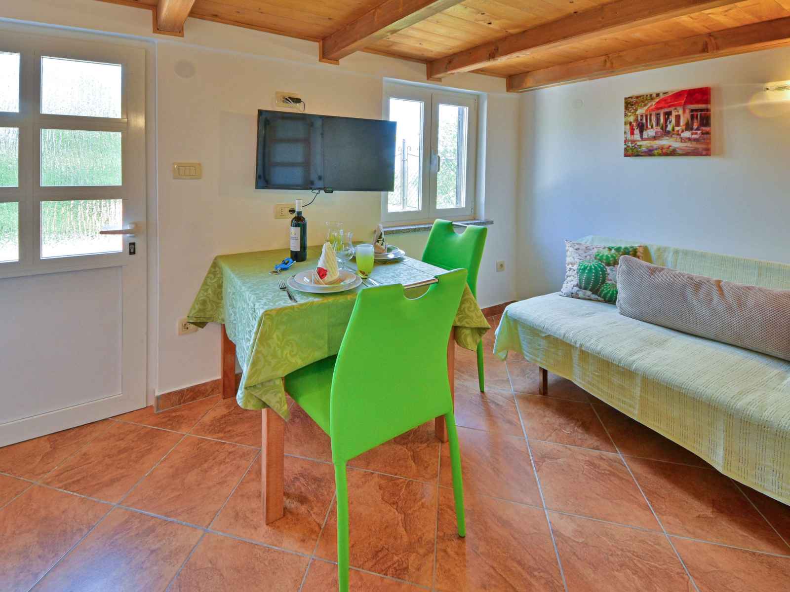 double (2 x 90 cm, longueur 200 cm), air-conditionné. Pas de chauffage. A disposition: Internet (Connexion WIFI, gratuit). Maximum 1 animal/ chien autorisé. Fenêtres basses dans la chambre mansardée.