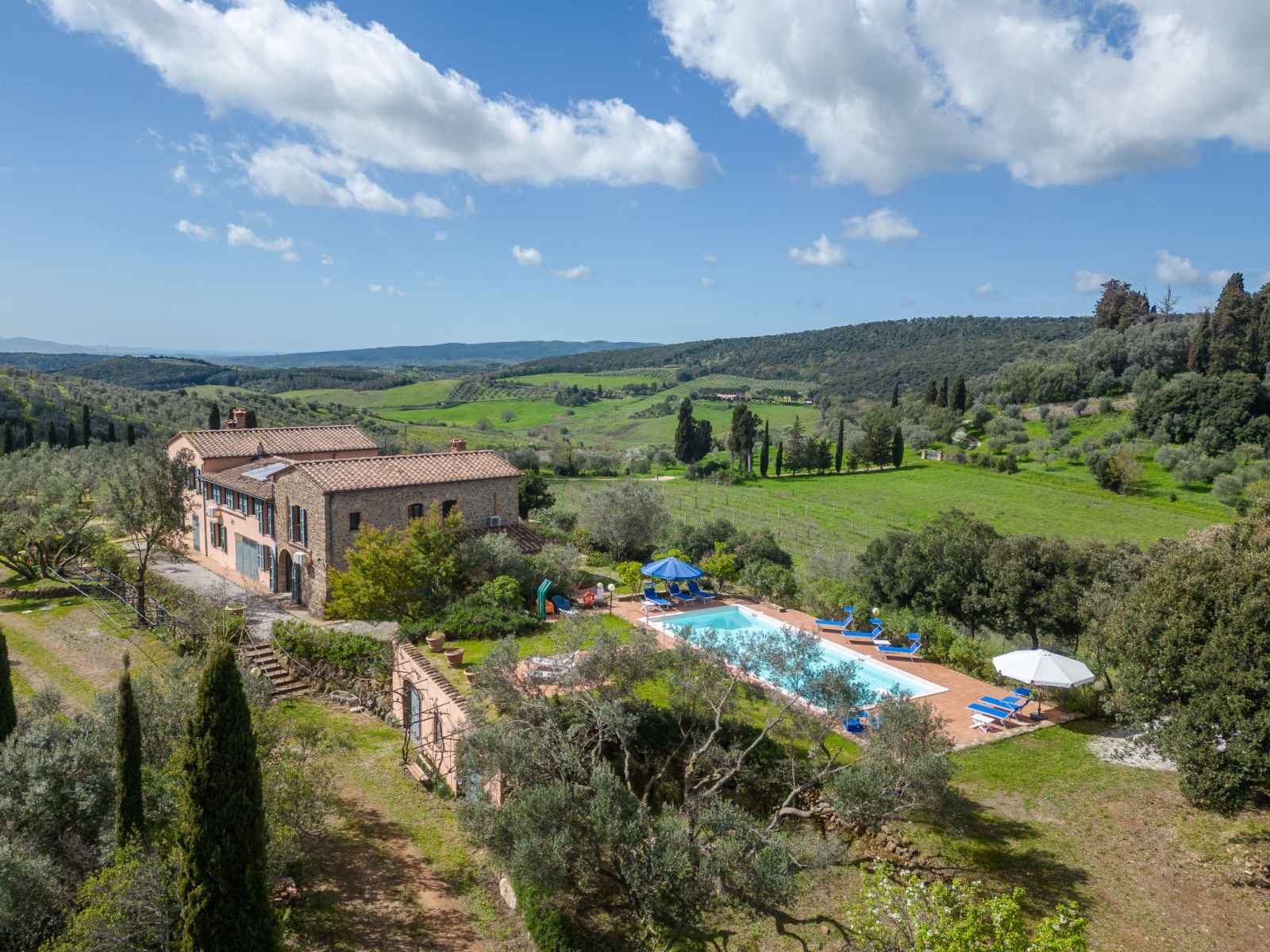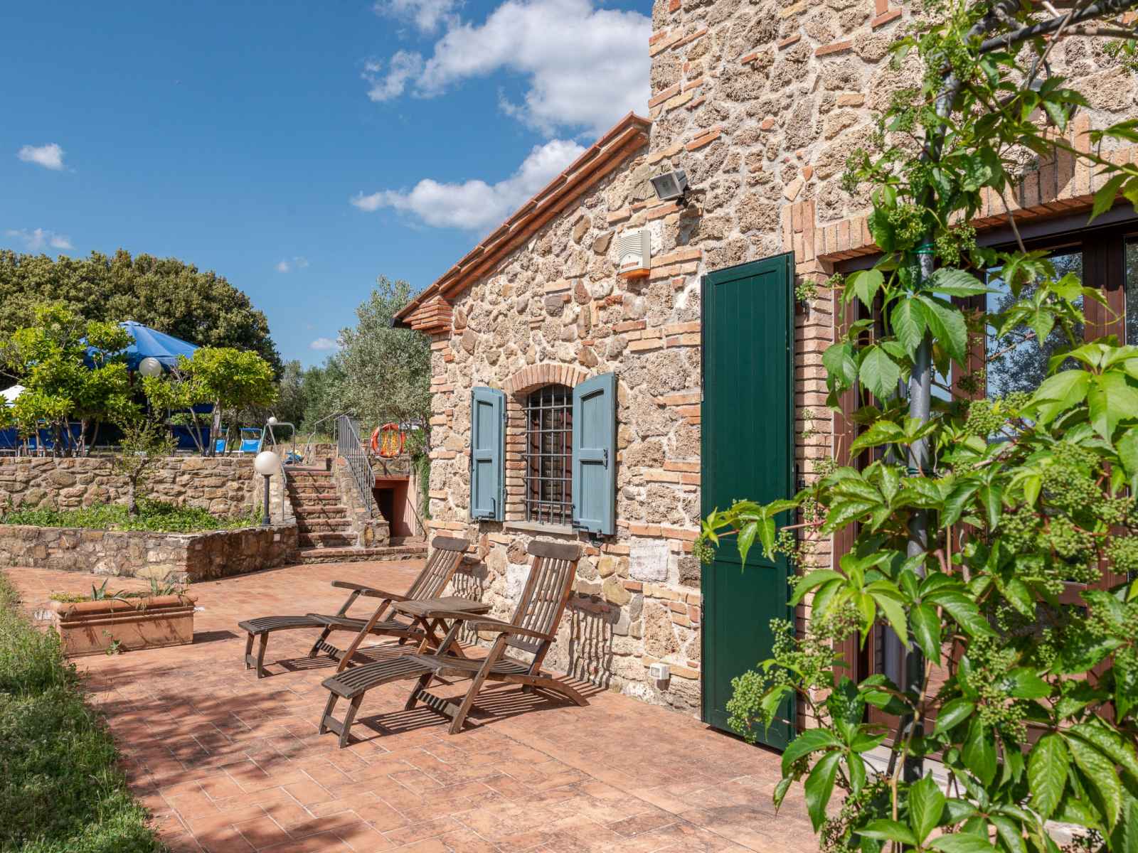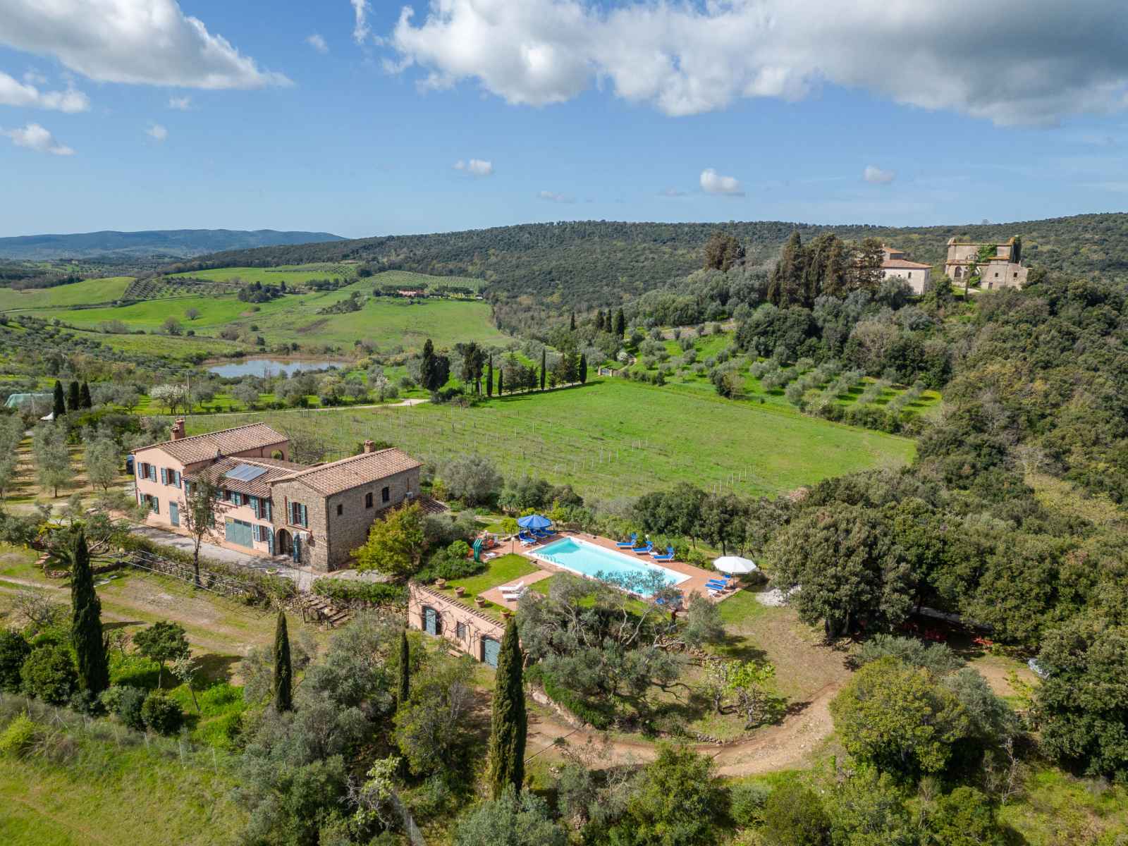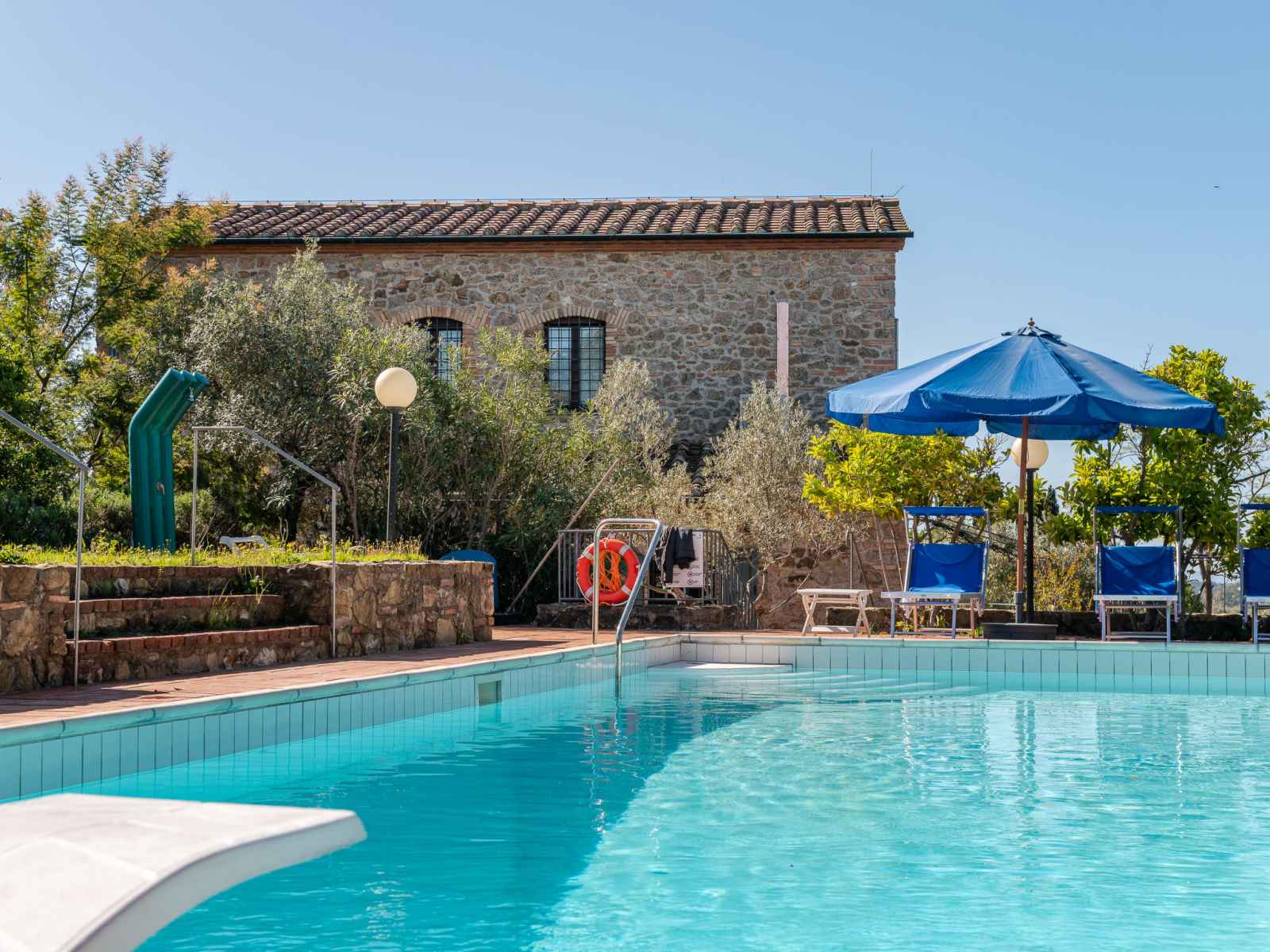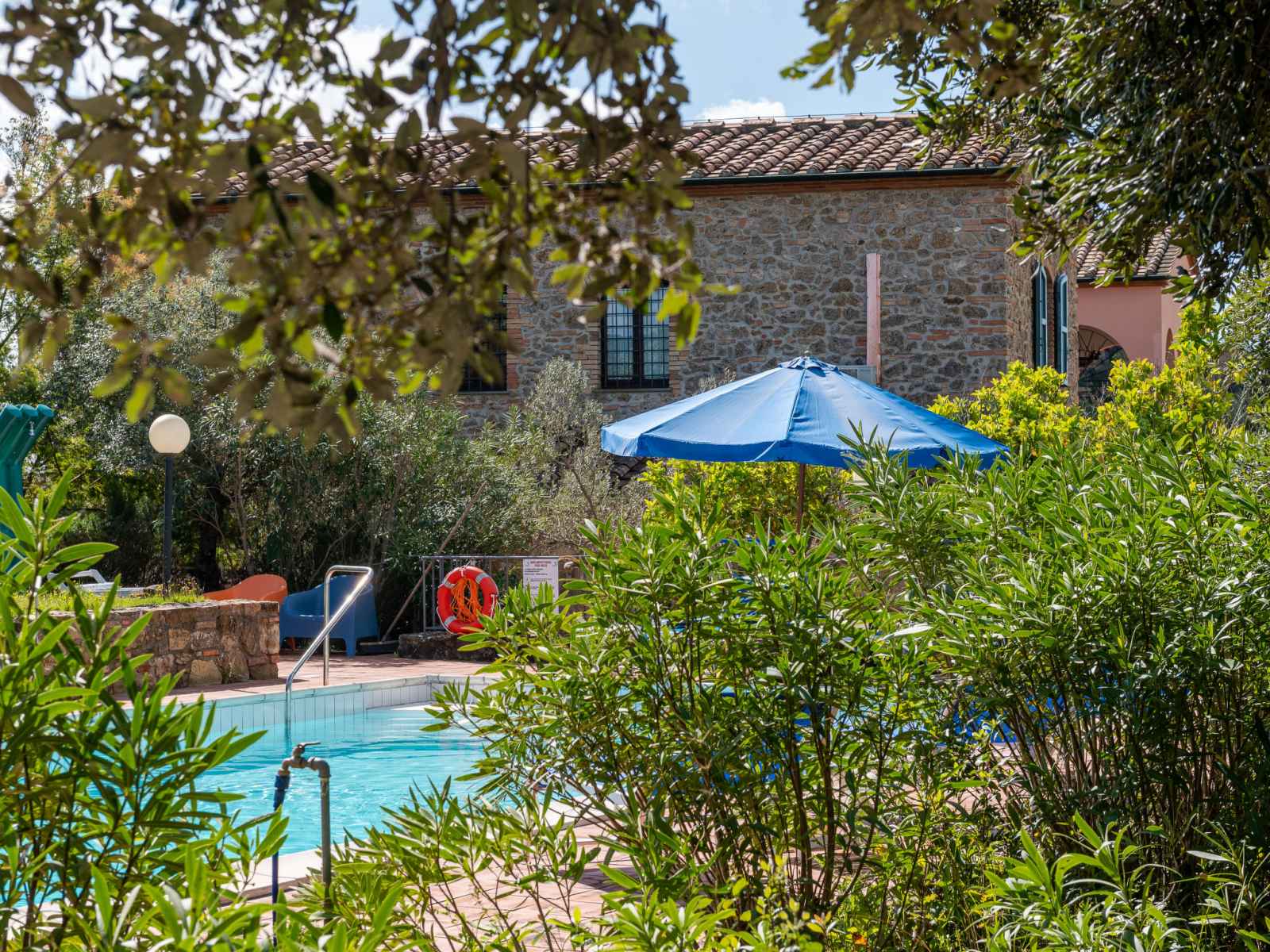 privé: jardin propice à la détente, piscine (12 x 6 m, disponibilité saisonnière: 01.mai. - 30.sep.). jardinet, pergola, terrasse, meubles de jardin, barbecue, entretien de la piscine par le propriétaire/jardinier. infrastructures de la maison: réduit pour bicyclettes. accès en voiture par un chemin difficile de 1 km de long (chemin non goudronné). place de parking (pour 5 voitures) près de la maison. magasins 6 km, magasin d'alimentation 600 km, supermarché 10 km, restaurant 6 km, location de bicyclettes 10 km, arrêt de bus "ponte elsa" 5 km, gare ferroviaire "albinia" 13 km, ferry "piombino (elba)" 40 km, plage de sable "follonica" 18 km, centre thermal "sassetta" 34 km, baignade en lac "accesa" 11 km. port plaisance 23 km, terrain de golf (18 trous) 20 km, ecole de surf 20 km, golf miniature 20 km, centre équestre 13 km, chemins de randonnées pédestres depuis la maison 10 m. attractions à proximité: scarlino 19 km, suvereto 22 km, castiglione della pescaia 40 km, baratti-populonia 43 km. région de randonnées: mountain-bike 20 m. les espaces extérieurs, avec leurs différentes terrasses et leurs coins intimes, sont idéaux pour les clients qui souhaitent socialiser et profiter d'un aperitivo. une grande table pour les repas en plein air est située sur une grande terrasse et est équipée d'un barbecue à côté. elle donne sur le domaine emblématique situé sur la colline d'en face, l'ancienne résidence d'été de l'évêque et garantit de merveilleux et pittoresques couchers de soleil. une autre longue table sous la terrasse couverte offre calme et ombre et est donc idéale pour le petit-déjeuner ou le déjeuner. la piscine rectangulaire jouit d'une intimité absolue et en même temps d'une vue magnifique sur la campagne de la maremme jusqu'au golfe de follonica. le parc naturel riserva statale marsiliana borde la propriété, garantissant ainsi la tranquillité.