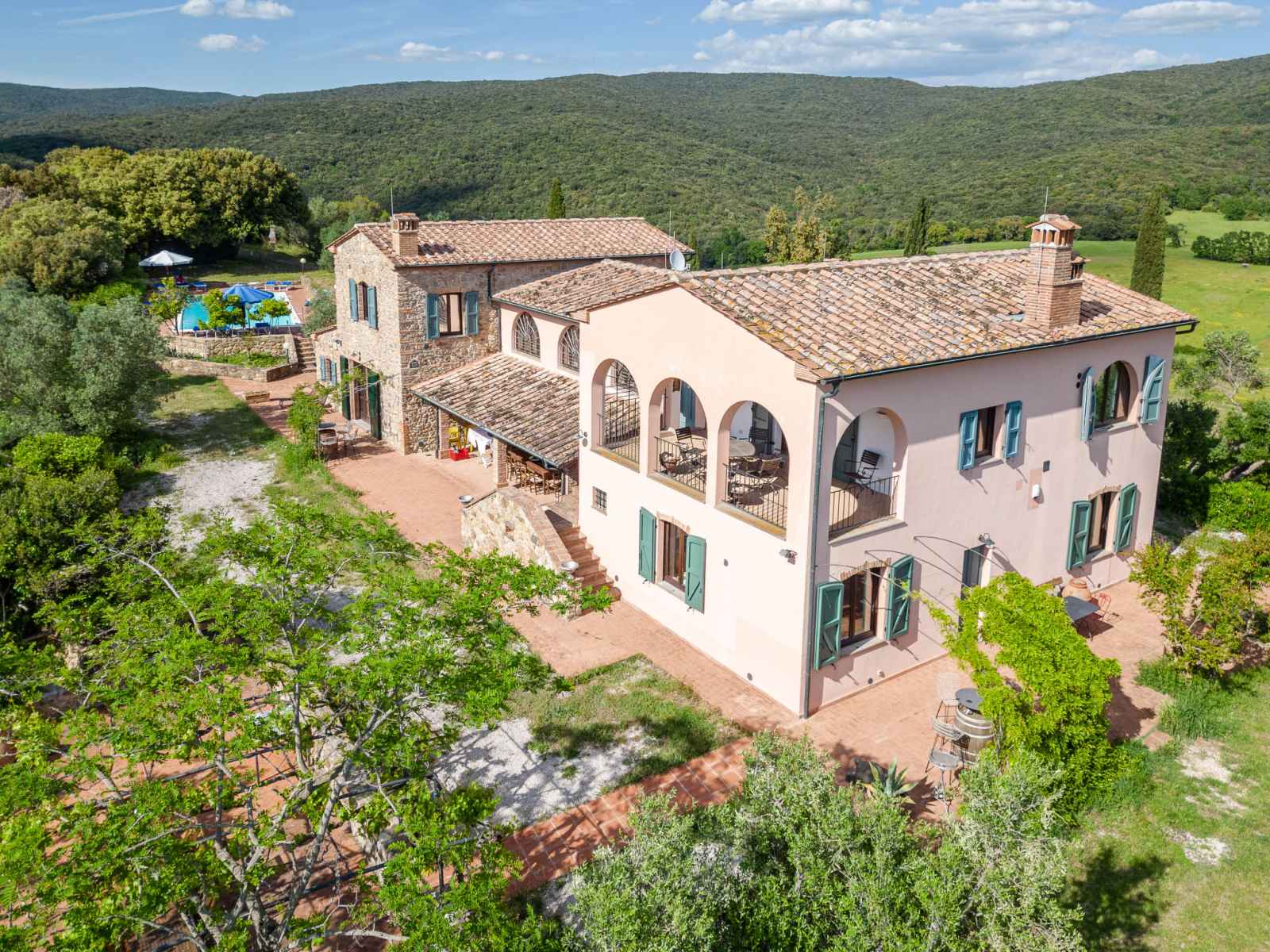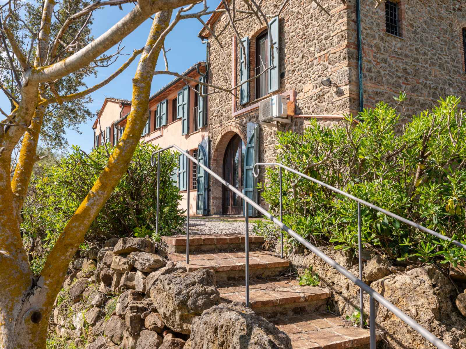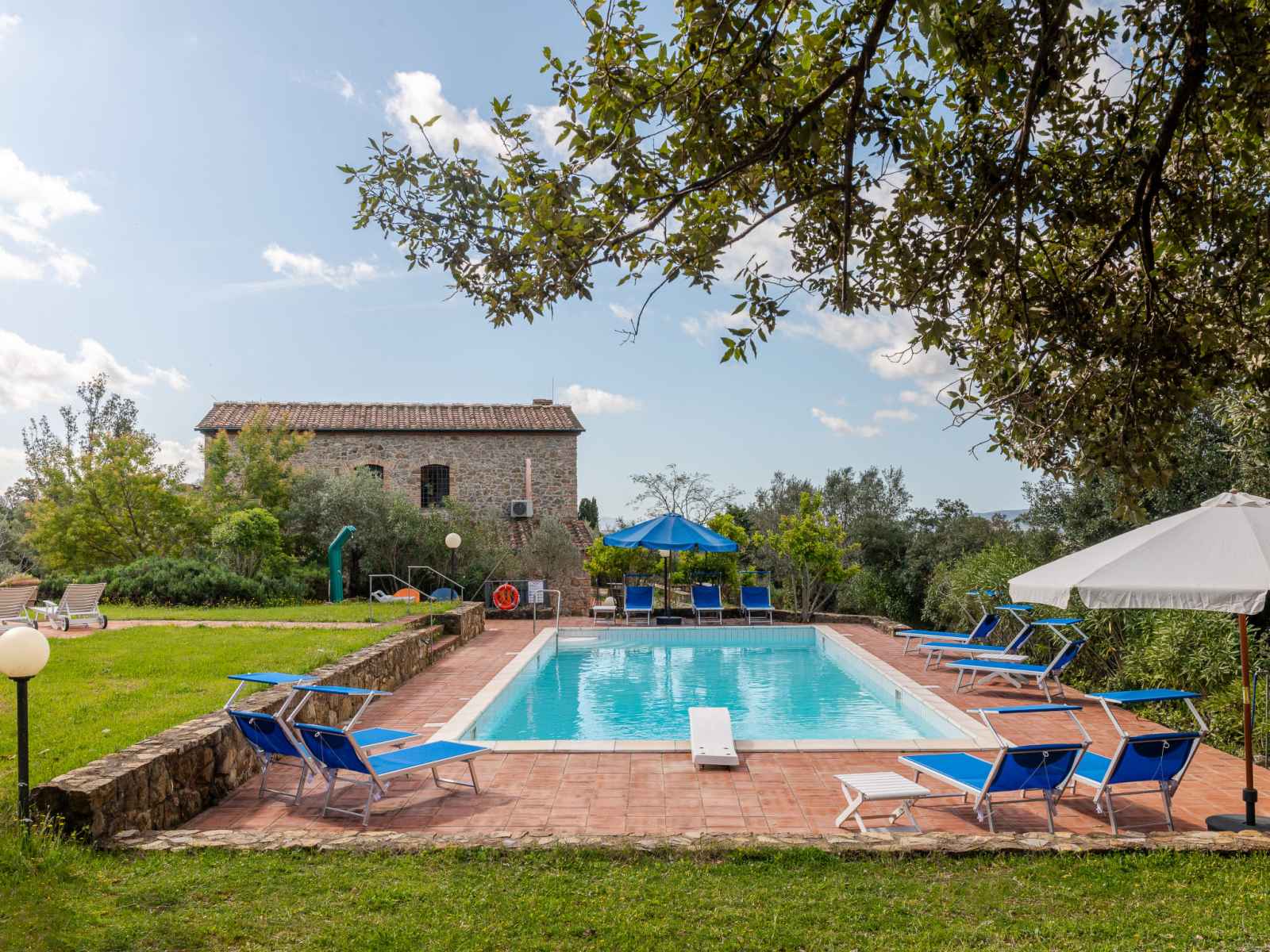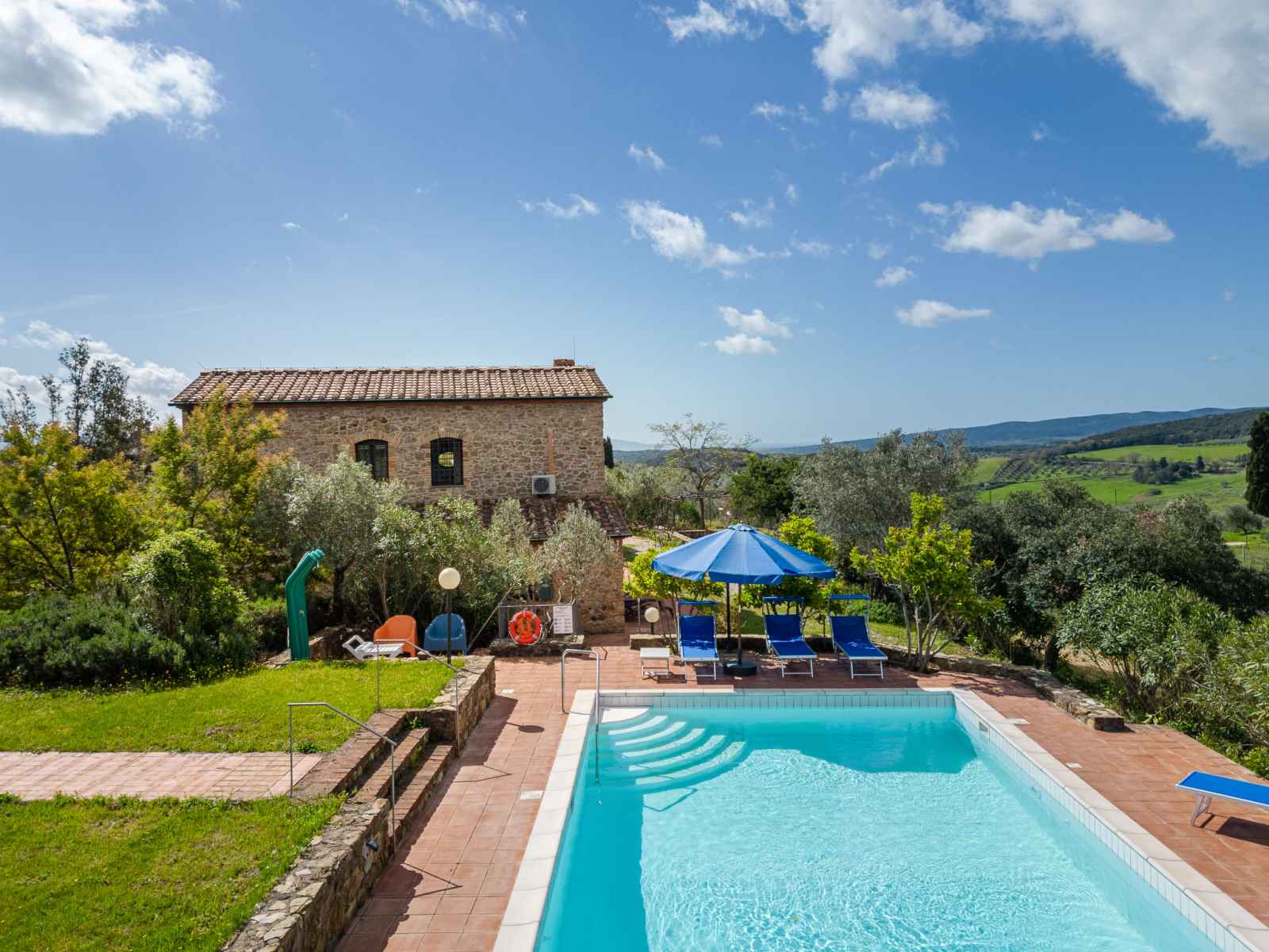 privé: jardin propice à la détente, piscine (12 x 6 m, disponibilité saisonnière: 01.mai. - 30.sep.). jardinet, pergola, terrasse, meubles de jardin, barbecue, entretien de la piscine par le propriétaire/jardinier. infrastructures de la maison: réduit pour bicyclettes. accès en voiture par un chemin difficile de 1 km de long (chemin non goudronné). place de parking (pour 5 voitures) près de la maison. magasins 6 km, magasin d'alimentation 600 km, supermarché 10 km, restaurant 6 km, location de bicyclettes 10 km, arrêt de bus "ponte elsa" 5 km, gare ferroviaire "albinia" 13 km, ferry "piombino (elba)" 40 km, plage de sable "follonica" 18 km, centre thermal "sassetta" 34 km, baignade en lac "accesa" 11 km. port plaisance 23 km, terrain de golf (18 trous) 20 km, ecole de surf 20 km, golf miniature 20 km, centre équestre 13 km, chemins de randonnées pédestres depuis la maison 10 m. attractions à proximité: scarlino 19 km, suvereto 22 km, castiglione della pescaia 40 km, baratti-populonia 43 km. région de randonnées: mountain-bike 20 m. les espaces extérieurs, avec leurs différentes terrasses et leurs coins intimes, sont idéaux pour les clients qui souhaitent socialiser et profiter d'un aperitivo. une grande table pour les repas en plein air est située sur une grande terrasse et est équipée d'un barbecue à côté. elle donne sur le domaine emblématique situé sur la colline d'en face, l'ancienne résidence d'été de l'évêque et garantit de merveilleux et pittoresques couchers de soleil. une autre longue table sous la terrasse couverte offre calme et ombre et est donc idéale pour le petit-déjeuner ou le déjeuner. la piscine rectangulaire jouit d'une intimité absolue et en même temps d'une vue magnifique sur la campagne de la maremme jusqu'au golfe de follonica. le parc naturel riserva statale marsiliana borde la propriété, garantissant ainsi la tranquillité.