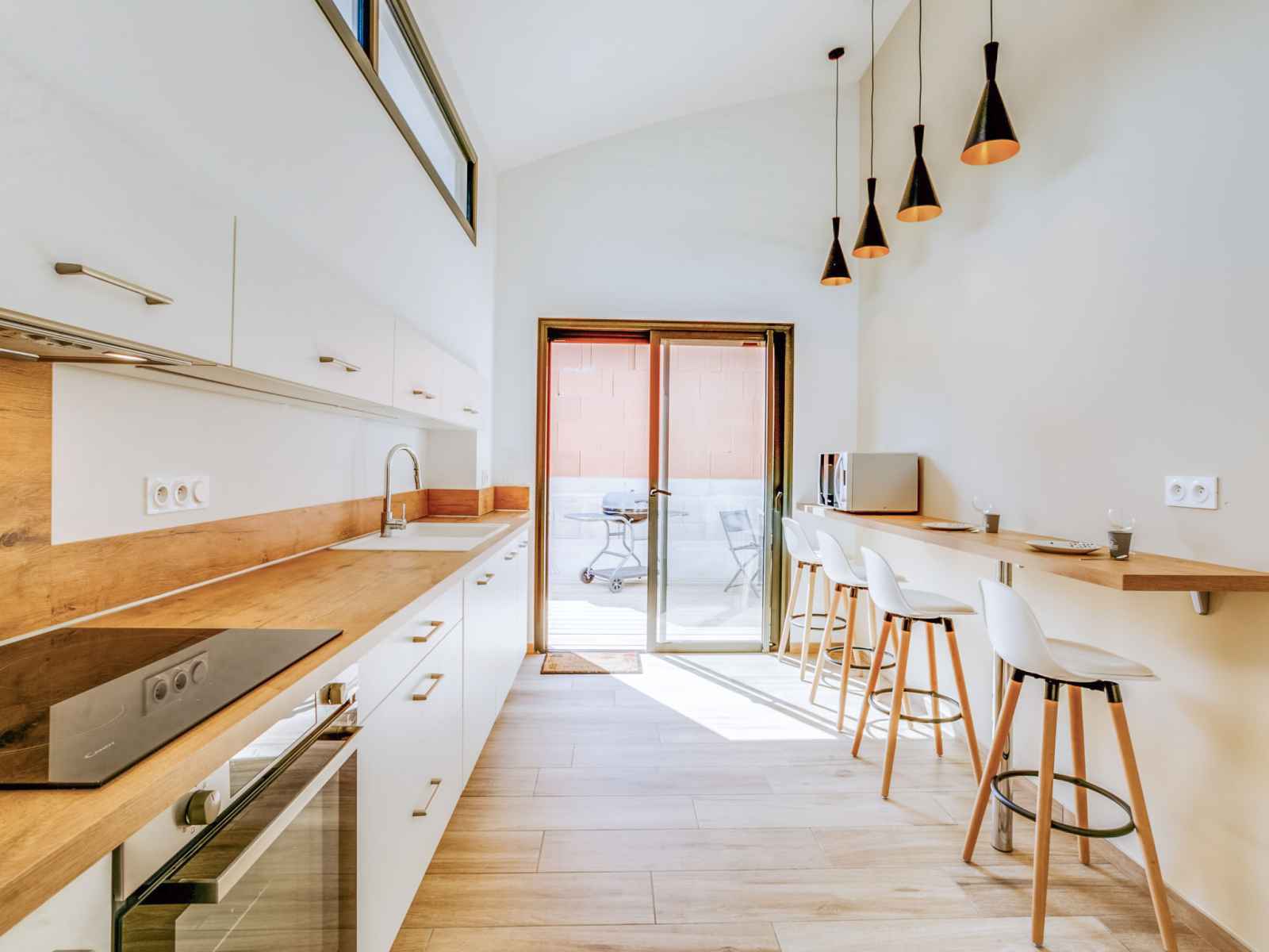 bouilloire électrique, micro-ondes, congélateur, cafetière électrique, Capsules pour machine à café (Nespresso) (NON INCLUSES)) avec air-conditionné. Sortie sur la terrasse. Douche, WC séparé. Air-conditionné, chauffage à air chaud. 2ème étage: 1 chambre avec 1 grand-lit (160 cm, longueur 200 cm), douche/WC. Sortie sur la terrasse. 1 chambre avec 1 x 2 lits superposés (90 cm, longueur 190 cm), 1 grand-lit (160 cm, longueur 200 cm). Sol en bois. 2 terrasses 40 m2. Meubles de terrasse, barbecue, chaises longues. A disposition: lave-linge, fer à repasser. Internet (Connexion WIFI, gratuit). Place de parking (2 Voitures). Veuillez noter: maison non-fumeur. Maximum 1 animal/ chien autorisé. Détecteur de fumée. Le lit superposé et le grand lit sont séparés par une porte verrière. Pour passer du salon/salle à manger à la cuisine il faut monter 6 marches. Pour passer de la cuisine aux chambres il faut monter 6 marches. FR3420.226.1