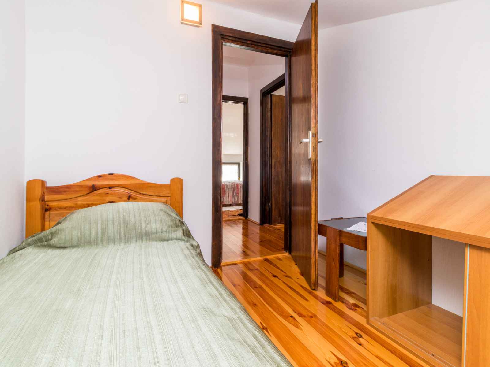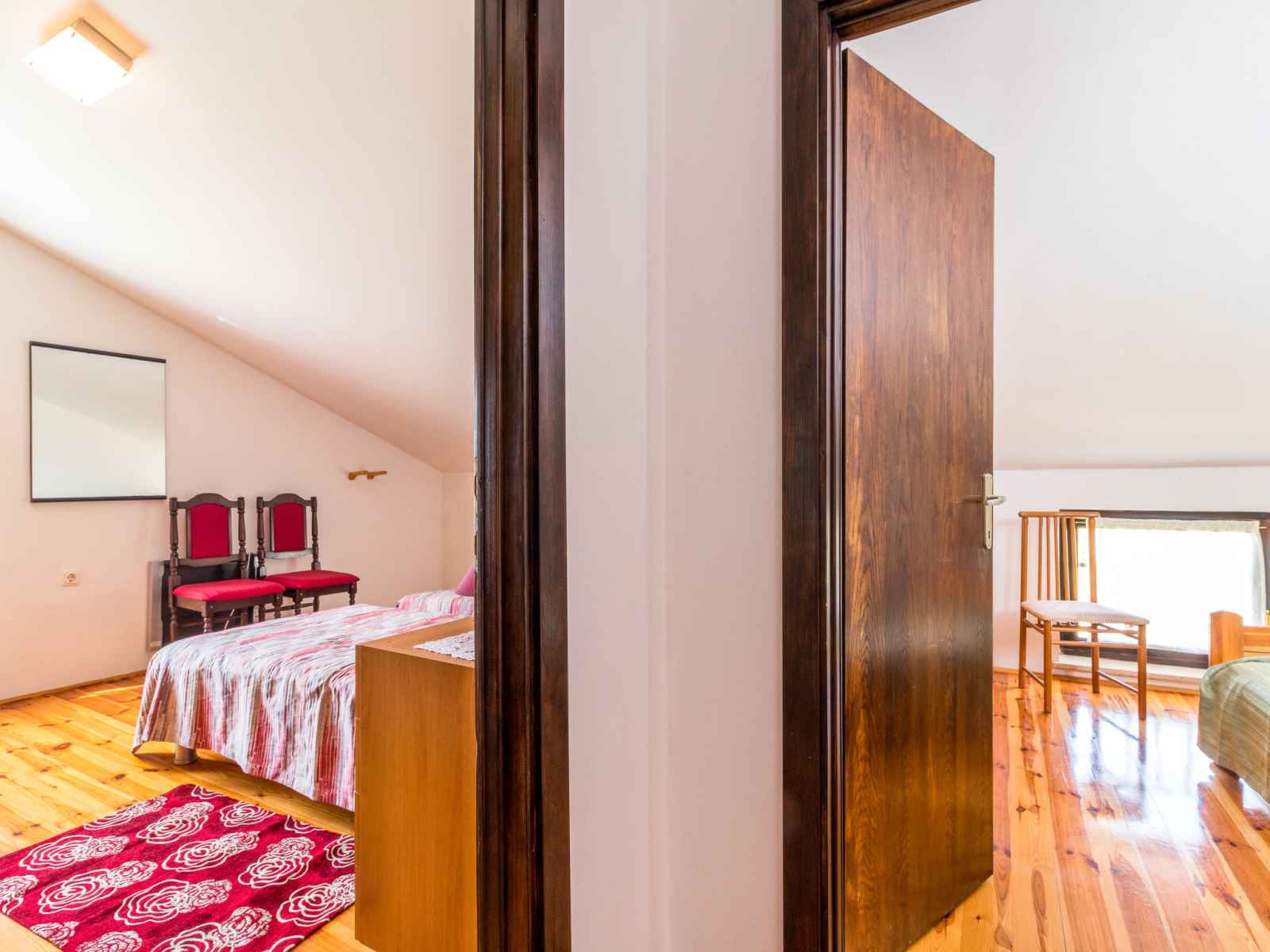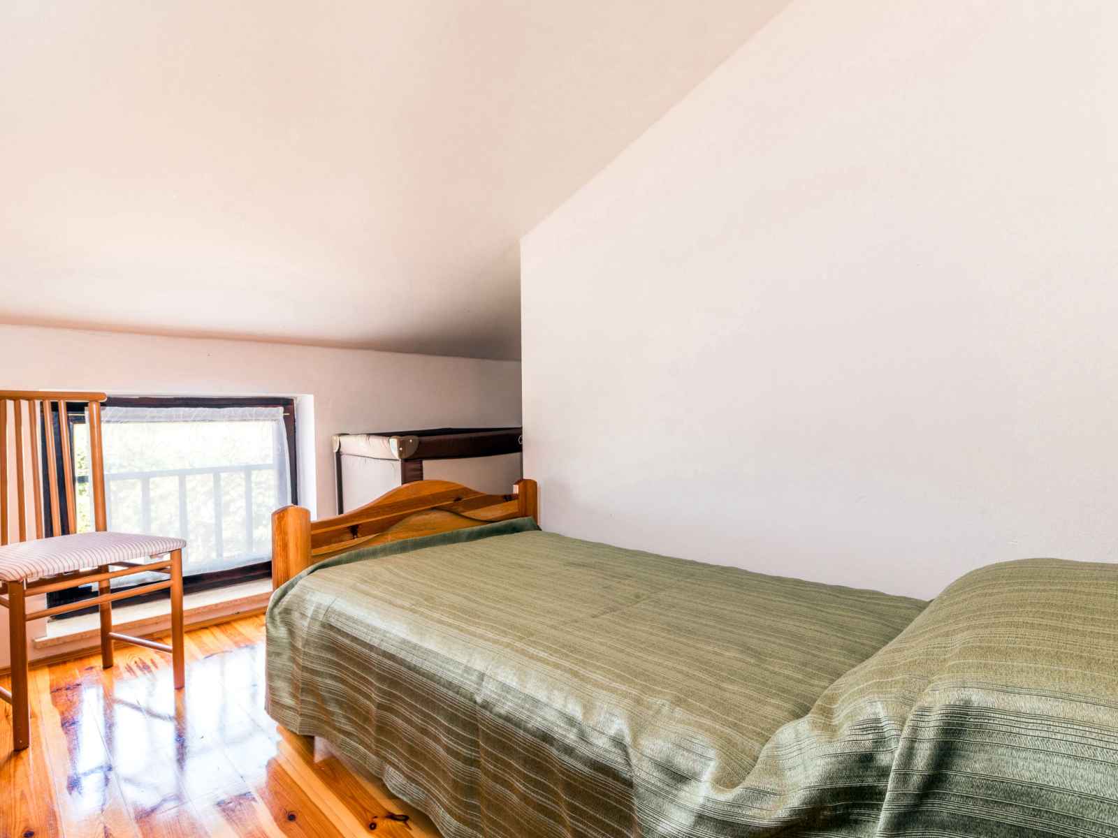 lit. 1 chambre, mansardée avec 1 grand-lit (140 cm, longueur 200 cm). Balcon, terrasse. Mobilier de balcon, barbecue (portable), chaises longues. Belle vue sur les alentours. A disposition: lit bébé. Internet (Connexion WIFI, gratuit). Veuillez noter: maison non-fumeur. Fenêtres basses dans la chambre mansardée.