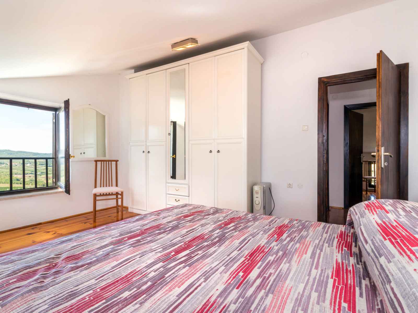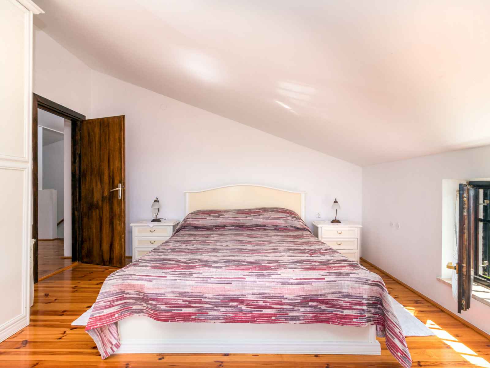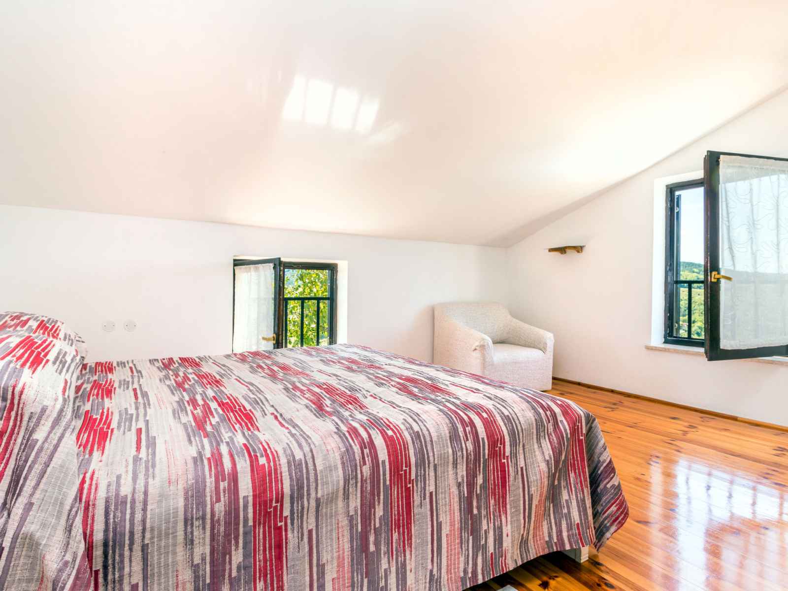 lit. 1 chambre, mansardée avec 1 grand-lit (140 cm, longueur 200 cm). Balcon, terrasse. Mobilier de balcon, barbecue (portable), chaises longues. Belle vue sur les alentours. A disposition: lit bébé. Internet (Connexion WIFI, gratuit). Veuillez noter: maison non-fumeur. Fenêtres basses dans la chambre mansardée.