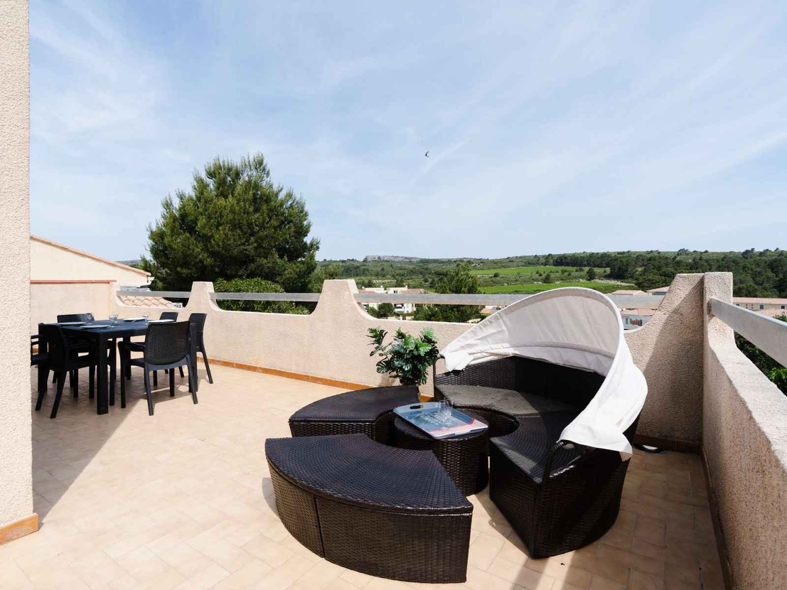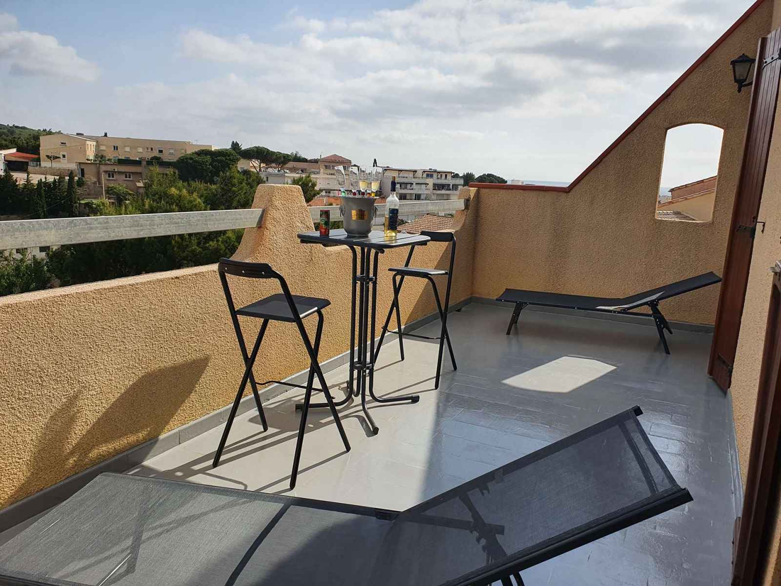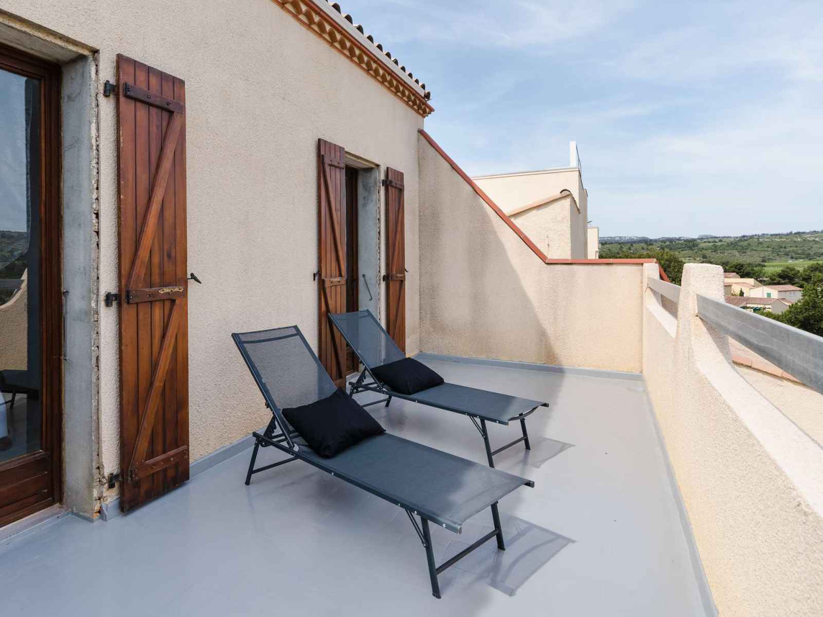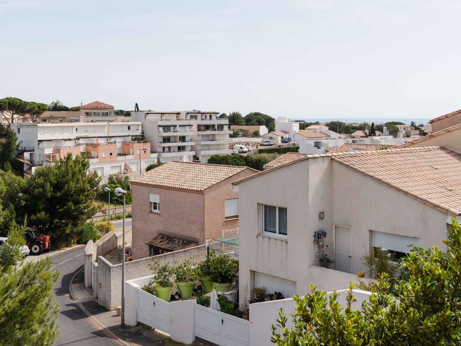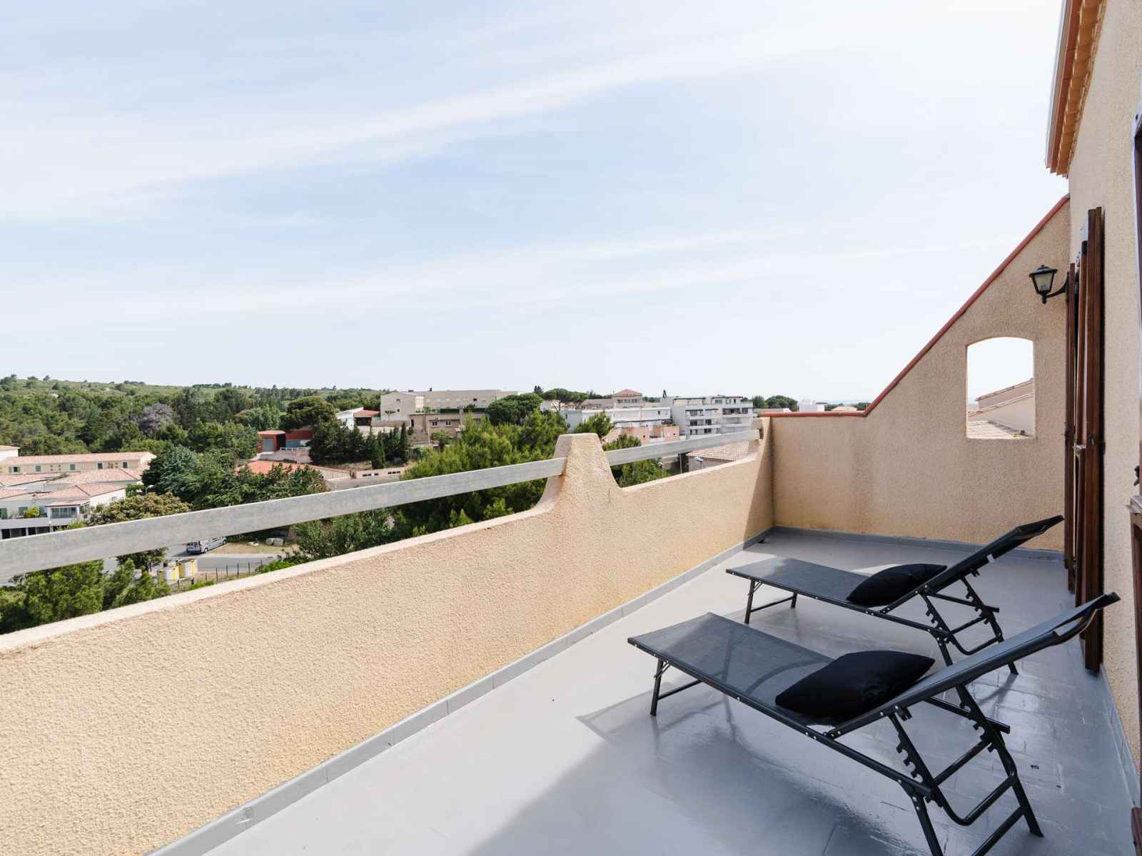 L'escalier sécurisé par 2 barrières mène au 1er étage où se trouvent un WC avec lave-mains, une seconde chambre avec lits superposés (2x90x190) et placard, et une 3ème chambre avec lit double (140x200) et rangements. Les 2 chambres ont accès à un solarium avec vue sur le Massif de la Clape et la mer. Wifi inclus.