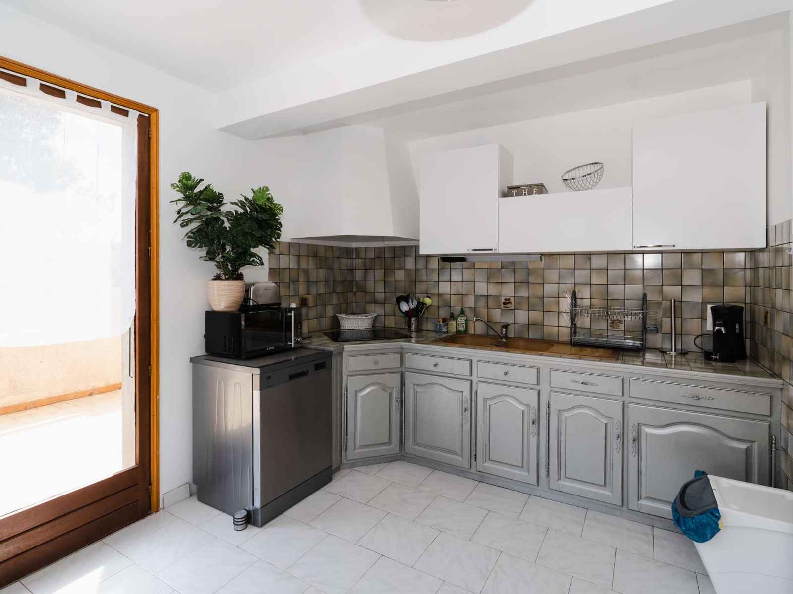 La pièce de vie au rez-de-chaussée comporte une cuisine ouverte entièrement équipée (plaque de cuisson vitro-céramique 3 feux, cafetière Senseo, grille-pain, bouilloire, réfrigérateur avec compartiment congélateur, lave-vaisselle, combi four-micro-ondes...) avec une table pour 6 et un coin salon (canapé, TV chaines françaises) donnant accès à une première terrasse. Au-rez-de-chaussée se trouve également une première chambre (avec lit double 140x200 et rangements) ainsi que la salle de bains (baignoire, sèche-serviettes, WC, meuble vasque) et un placard.