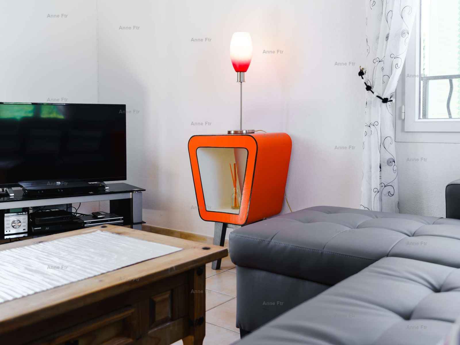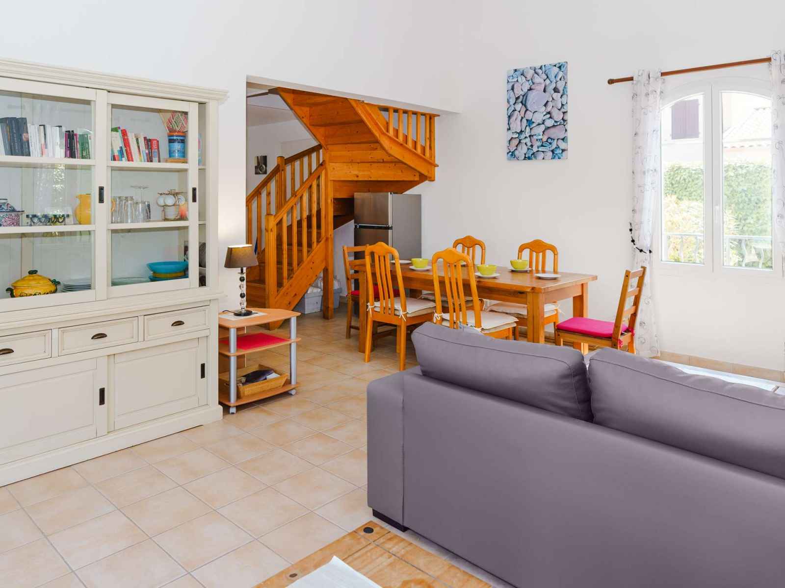 (chaînes françaises et étrangères+DVD). Une chambre (1 lit 140x190 cm) avec salle d'eau attenante. Cuisine équipée (4 plaques vitro, hotte aspirante, four, four micro-ondes, réfrigérateur-congélateur, cafetière classique et Nespresso). Séjour lumineux avec coin salon (canapé, fauteuils, mini chaîne Hifi) et coin repas donnant sur le jardin (meubles de jardin). Garage (lave-vaisselle, lave-linge & évier) pour vélos, motos. WC.