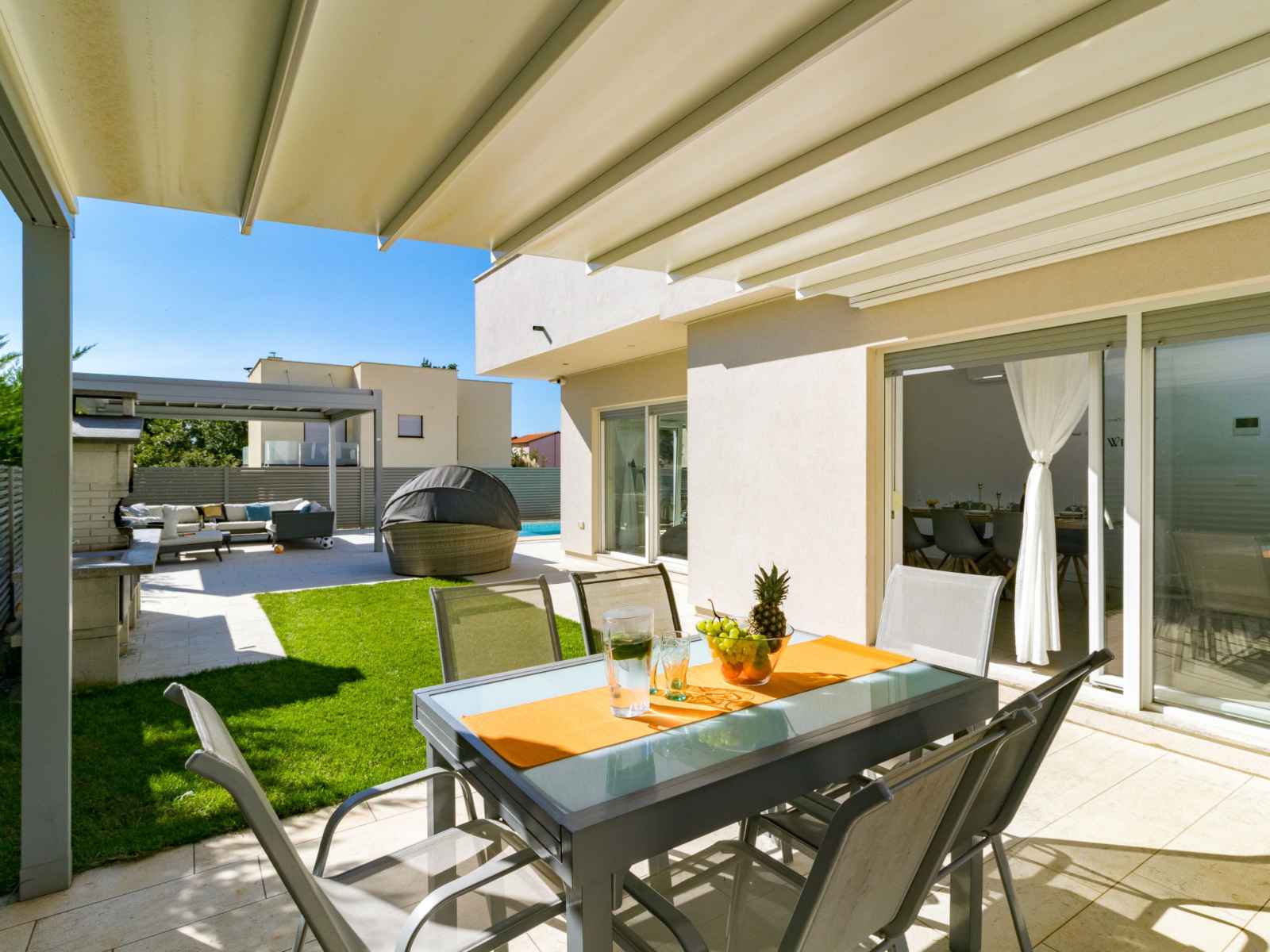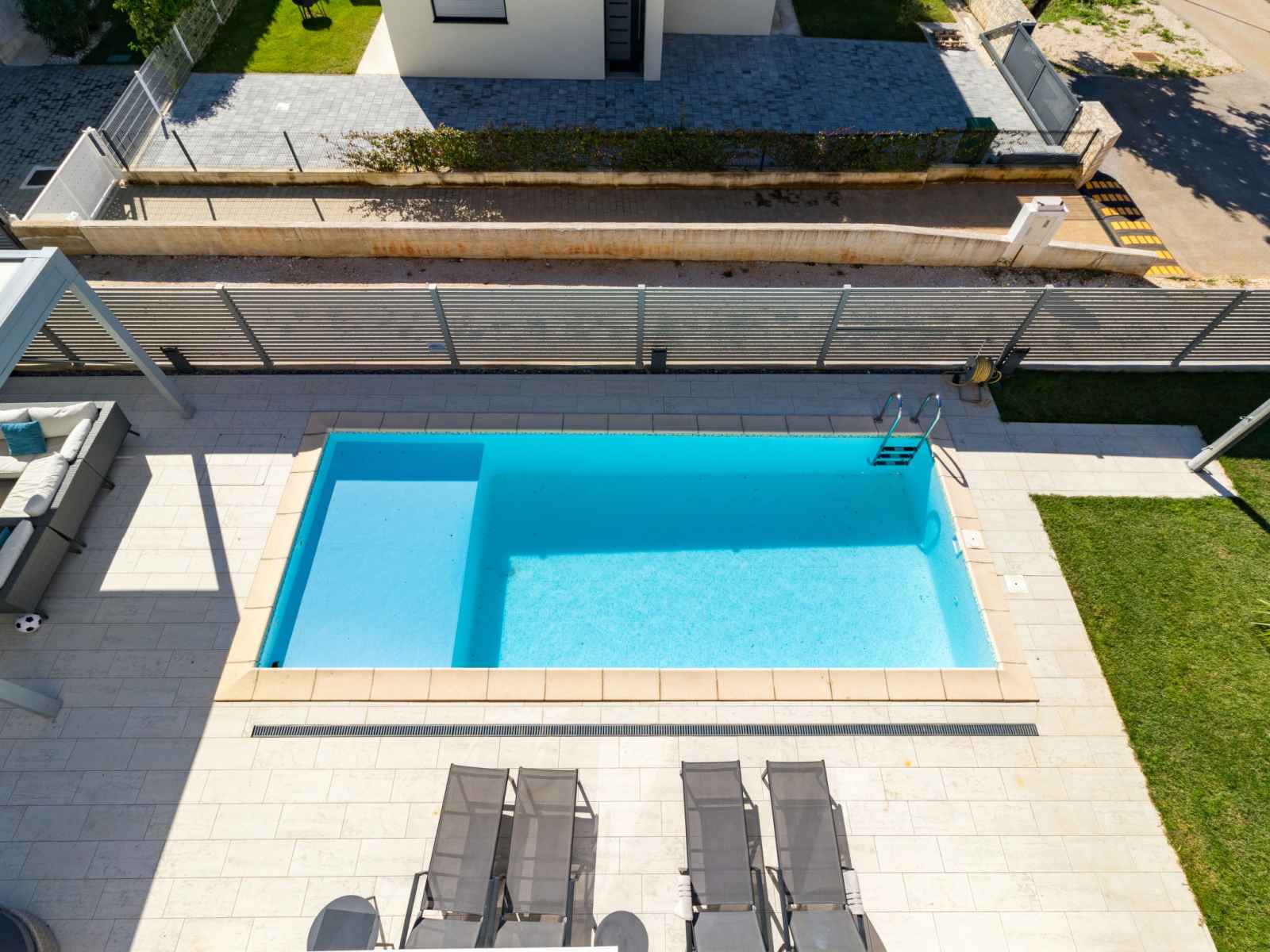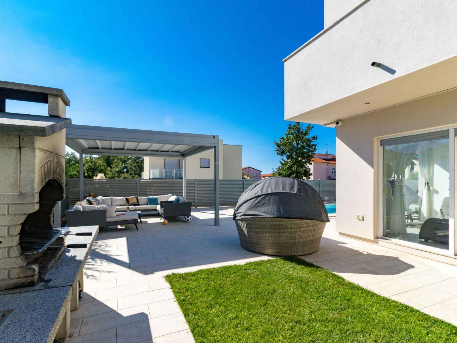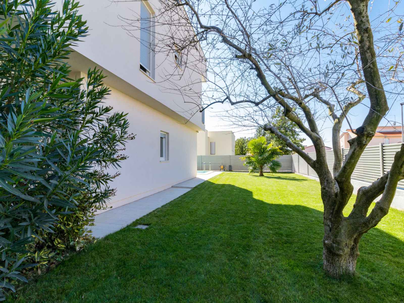 Maison individuelle moderne "villa virtus", de 2 étages, année de construction 2016. À 4 km du centre de novigrad, à 8 km du centre d'umag, à 24 km du centre de poreč, dans un quartier résidentiel, à, de la mer, à 200 m de la plage. a usage privé: terrain 500 m2 (clôturé), piscine rectangulaire, chauffée (8 x 4 m, profondeur 145 cm,