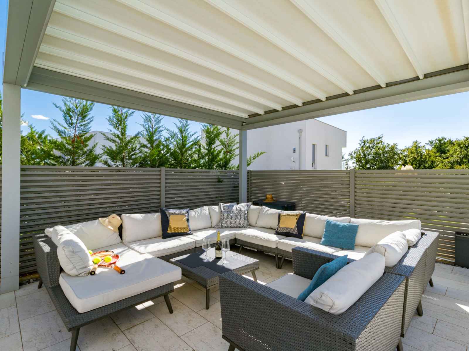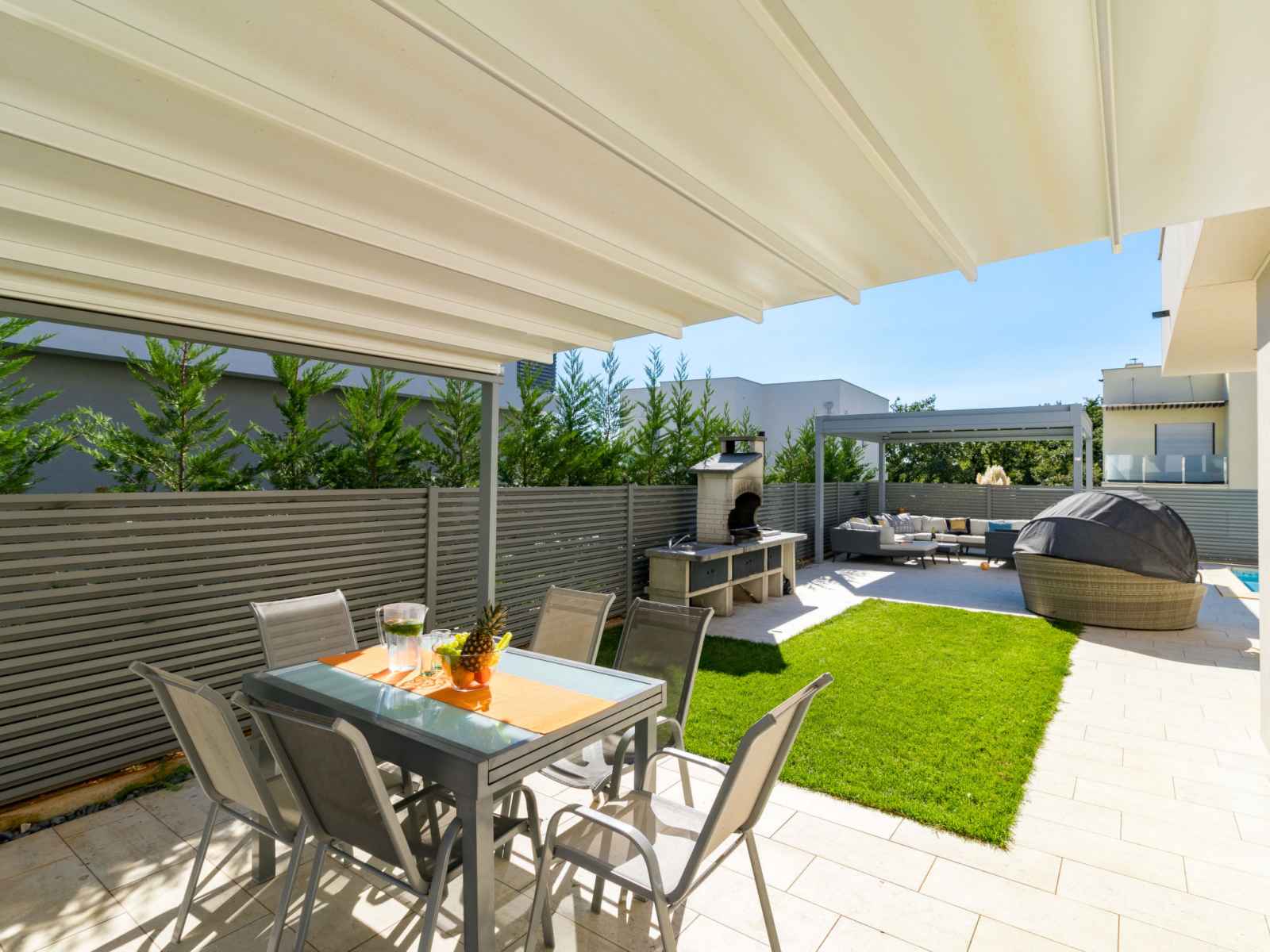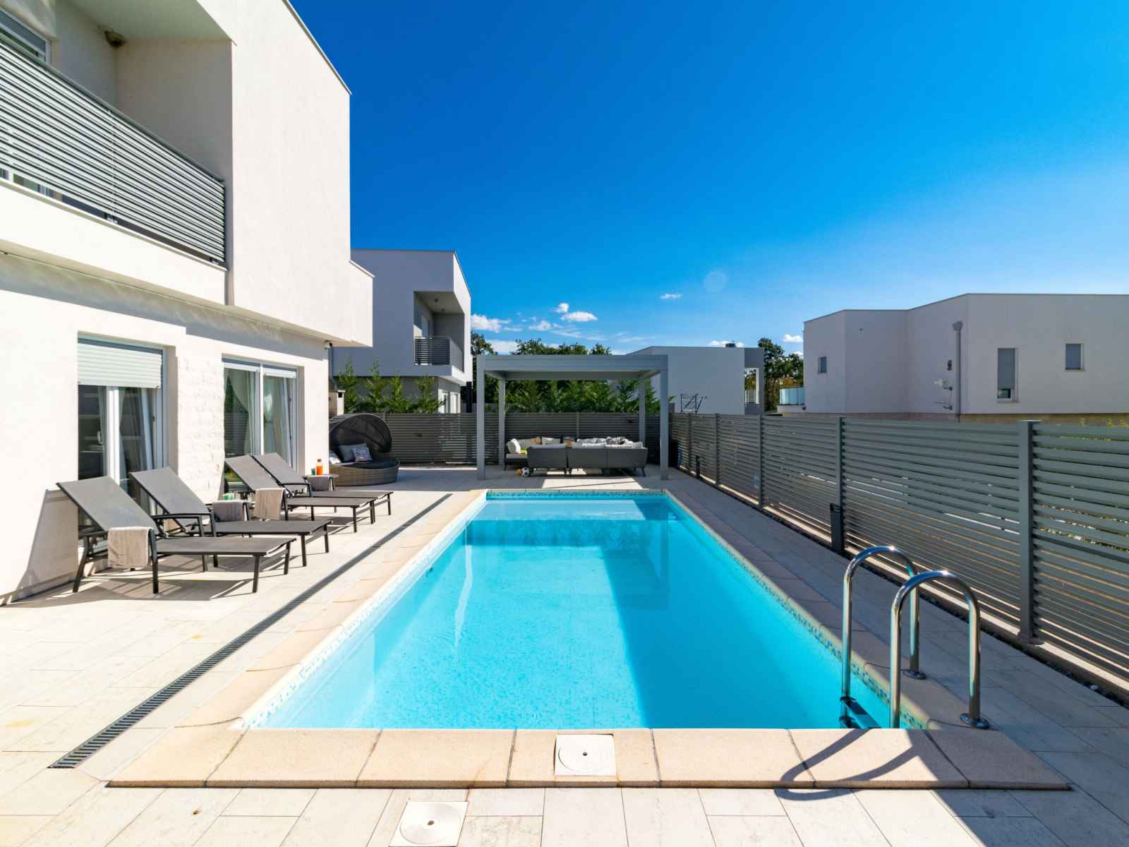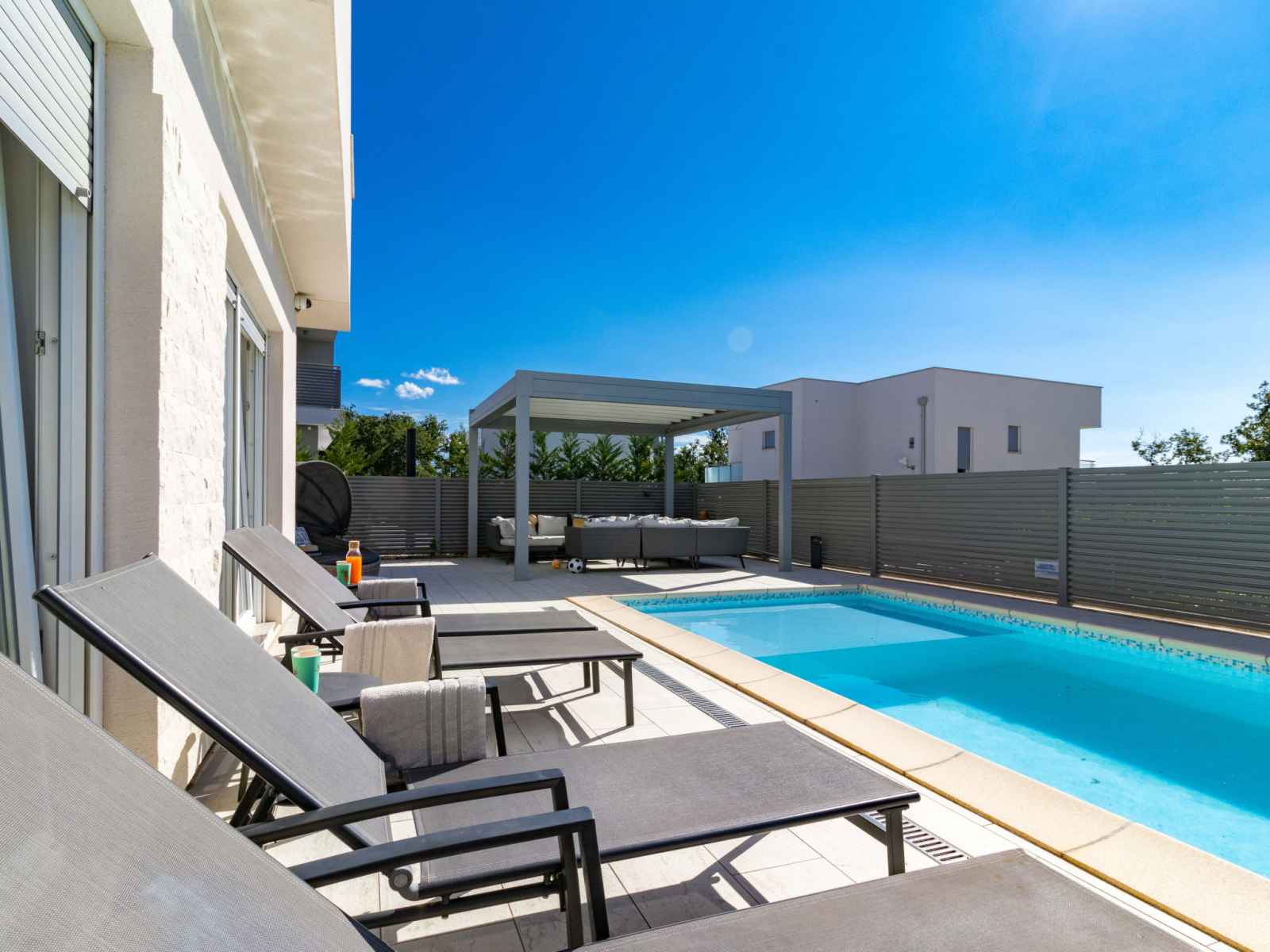 Maison individuelle moderne "villa virtus", de 2 étages, année de construction 2016. À 4 km du centre de novigrad, à 8 km du centre d'umag, à 24 km du centre de poreč, dans un quartier résidentiel, à, de la mer, à 200 m de la plage. a usage privé: terrain 500 m2 (clôturé), piscine rectangulaire, chauffée (8 x 4 m, profondeur 145 cm,