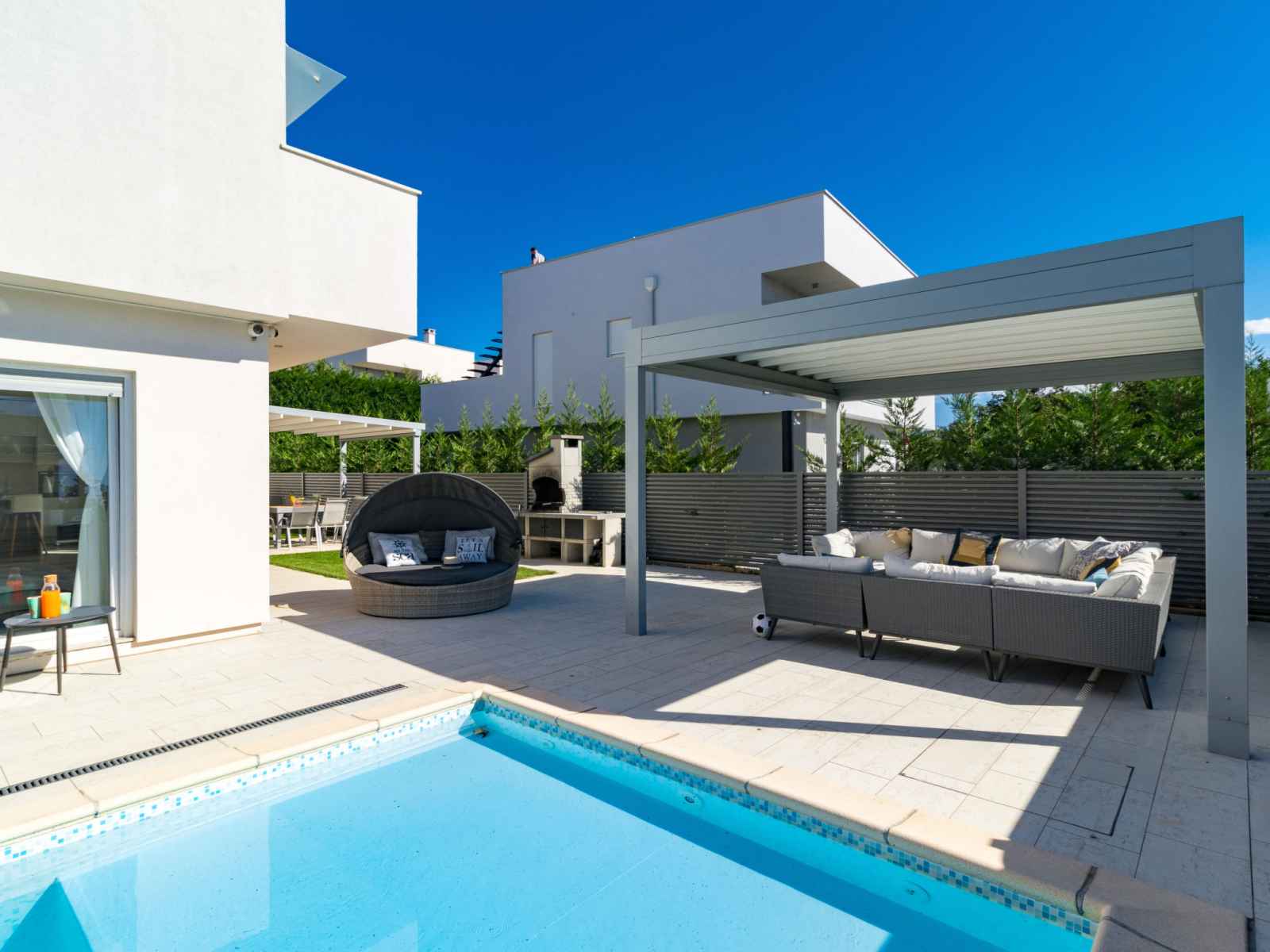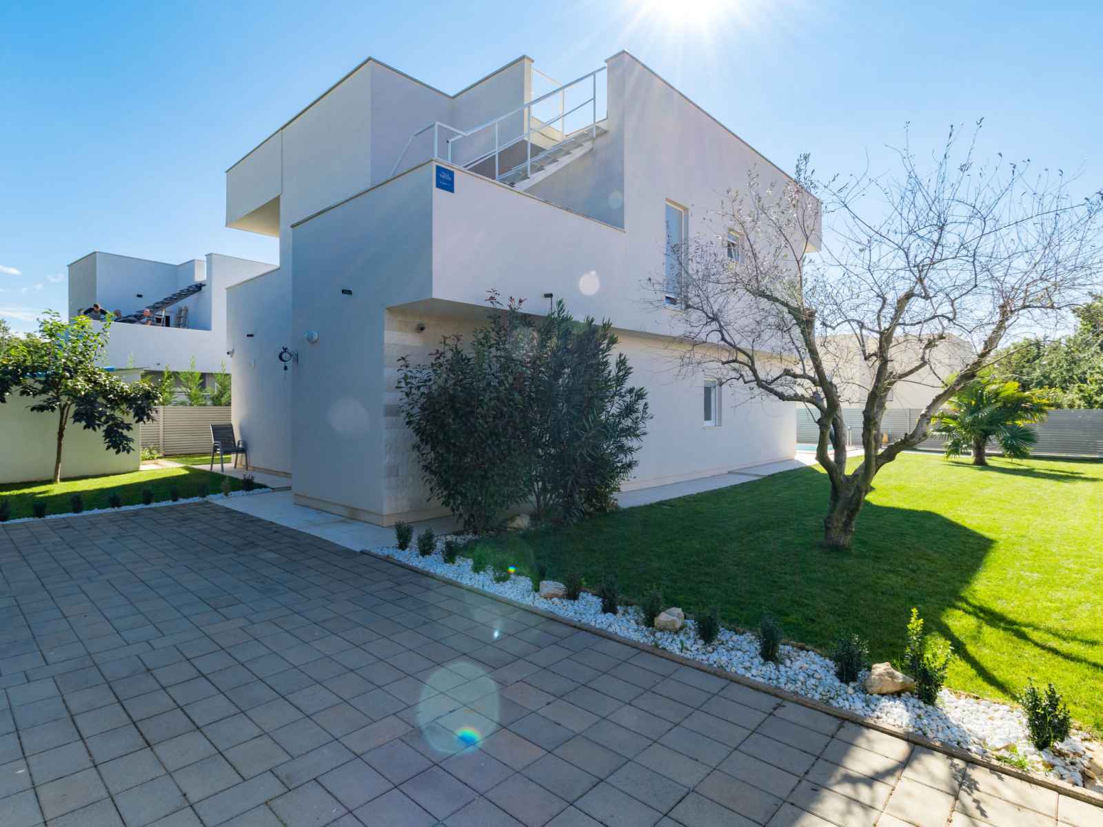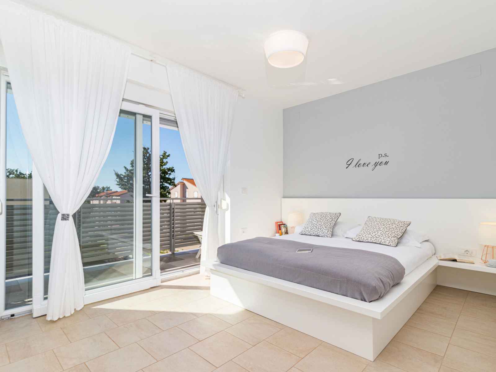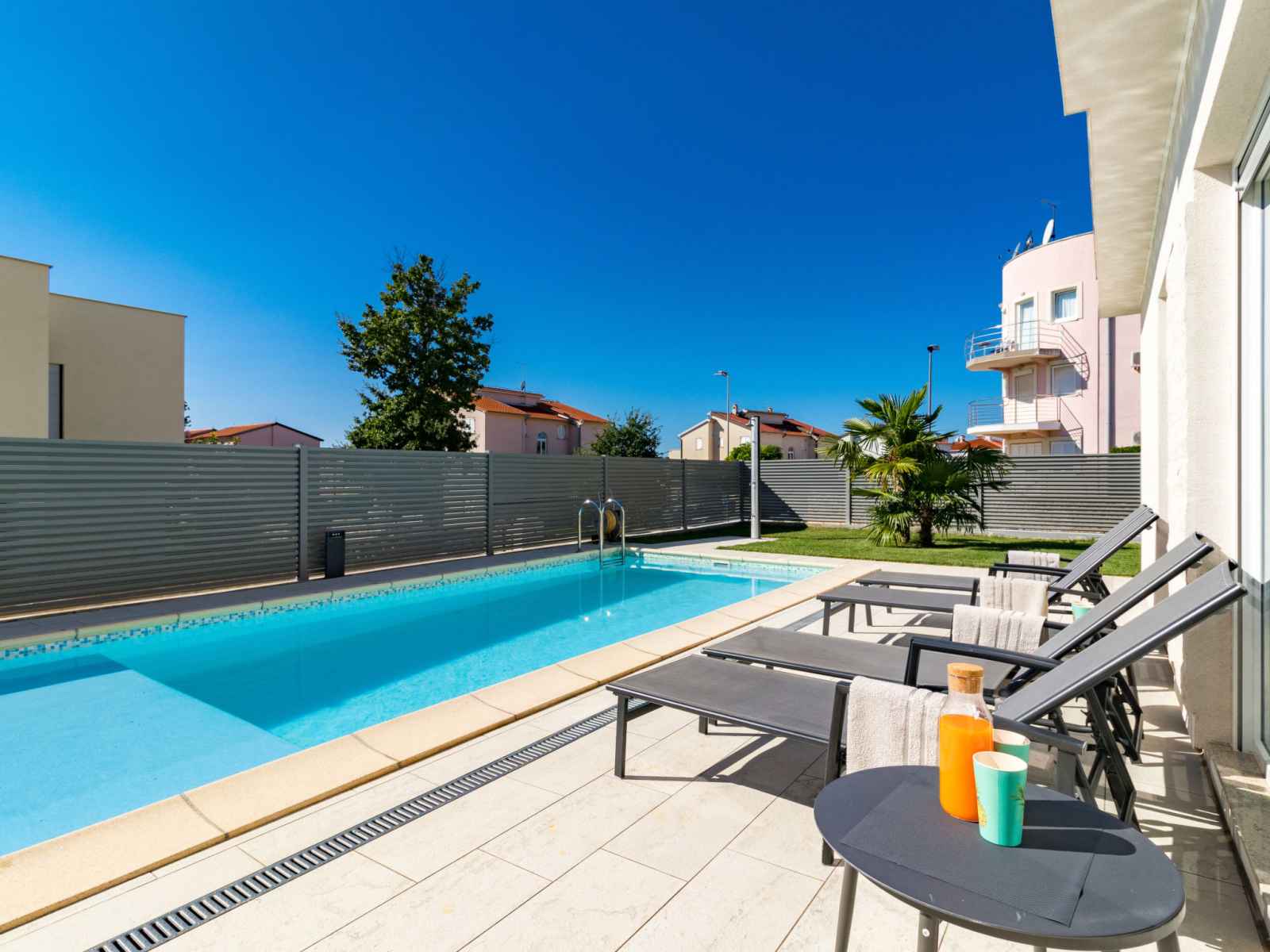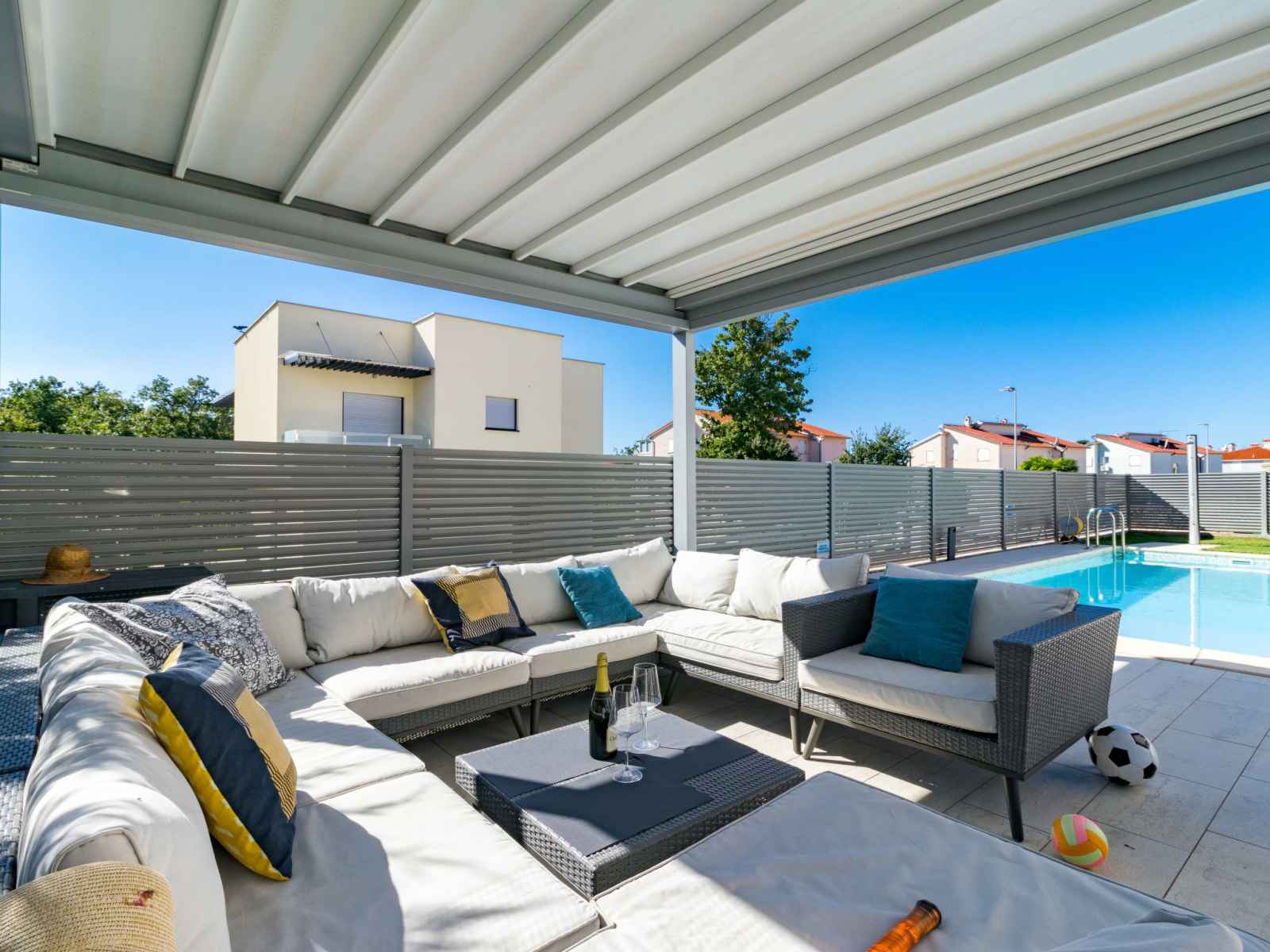 Maison individuelle moderne "villa virtus", de 2 étages, année de construction 2016. À 4 km du centre de novigrad, à 8 km du centre d'umag, à 24 km du centre de poreč, dans un quartier résidentiel, à, de la mer, à 200 m de la plage. a usage privé: terrain 500 m2 (clôturé), piscine rectangulaire, chauffée (8 x 4 m, profondeur 145 cm,