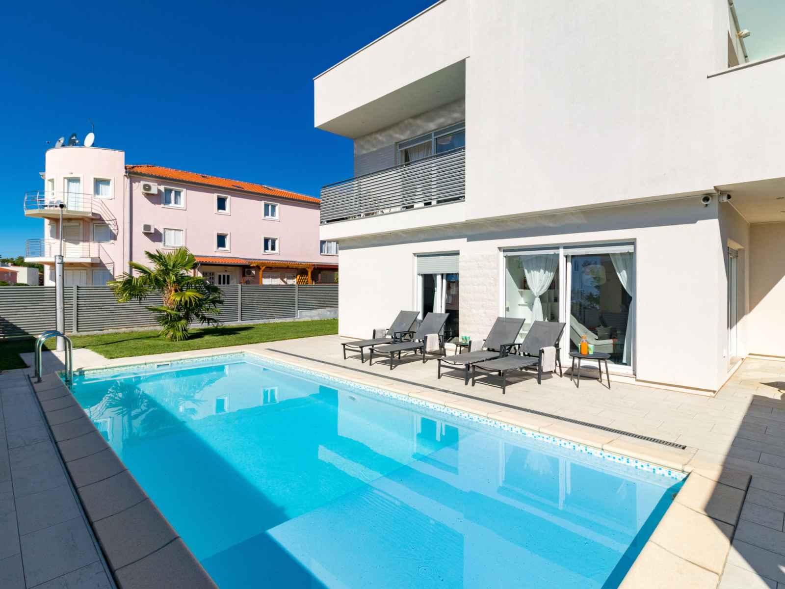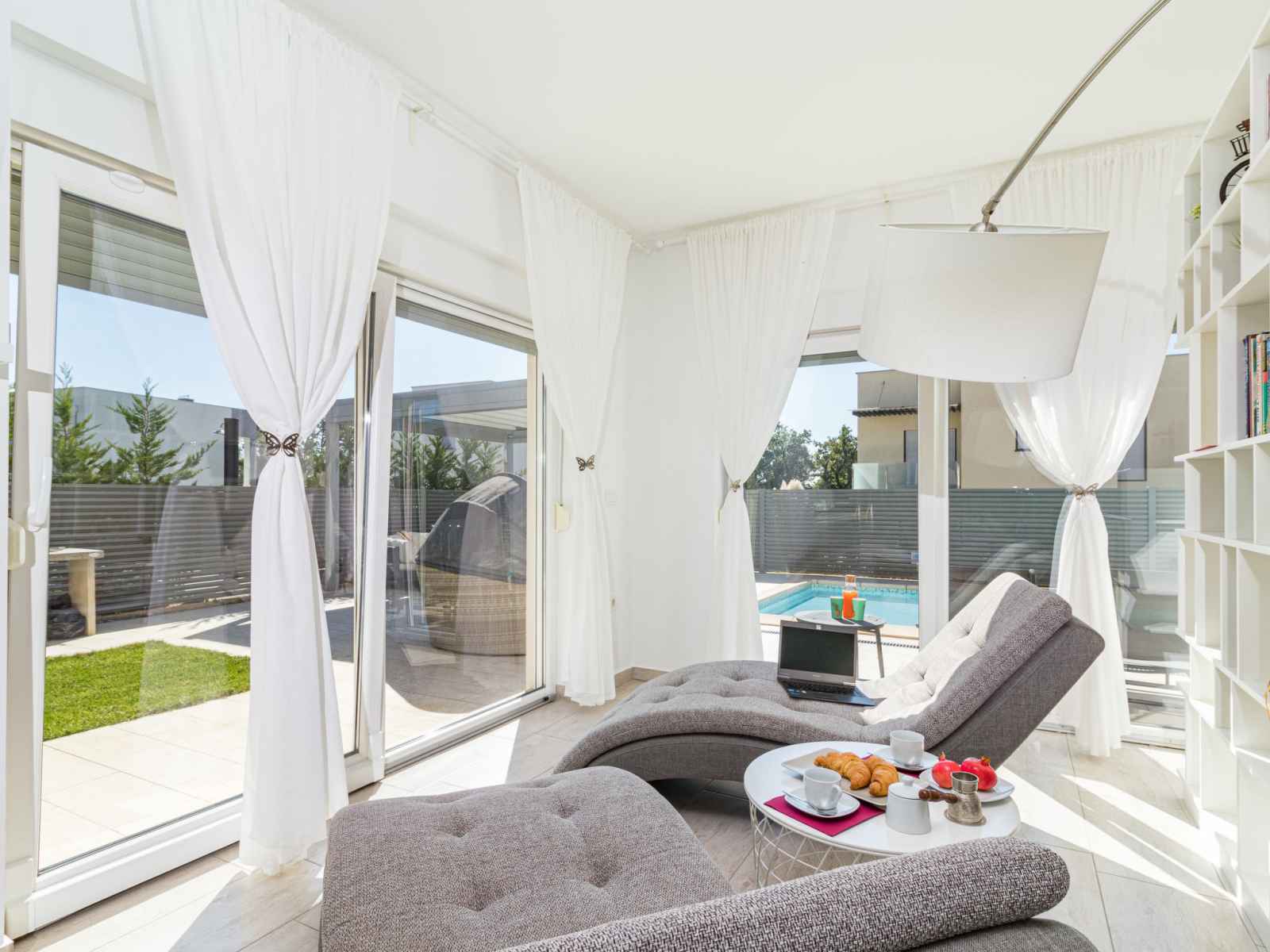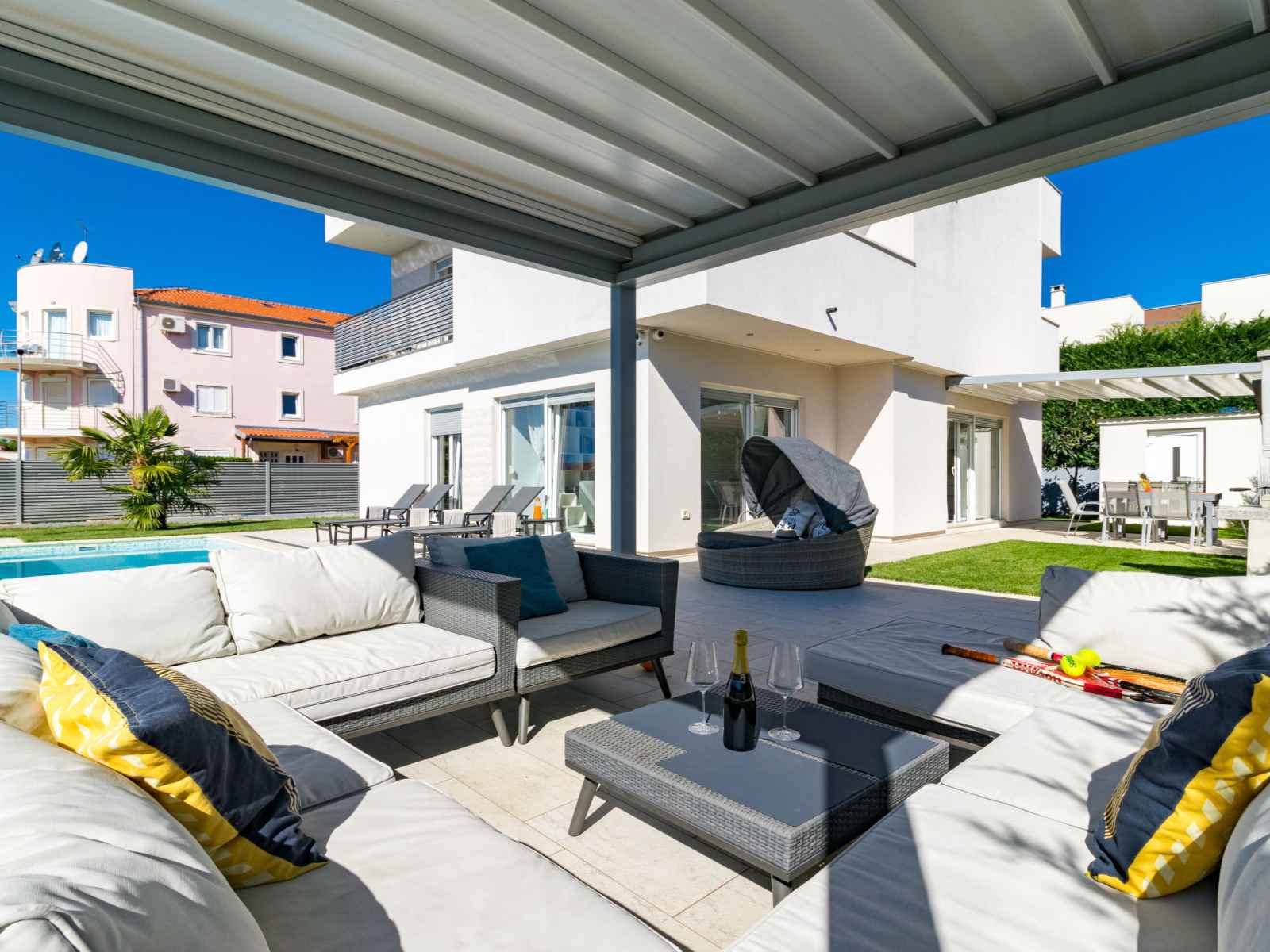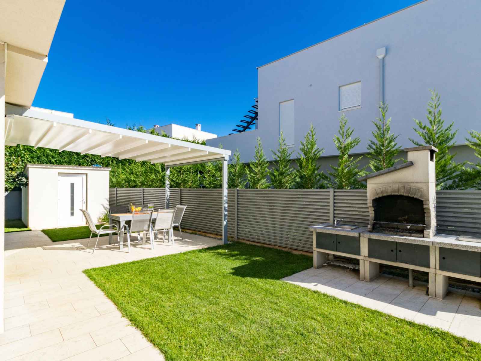 Maison individuelle moderne "villa virtus", de 2 étages, année de construction 2016. À 4 km du centre de novigrad, à 8 km du centre d'umag, à 24 km du centre de poreč, dans un quartier résidentiel, à, de la mer, à 200 m de la plage. a usage privé: terrain 500 m2 (clôturé), piscine rectangulaire, chauffée (8 x 4 m, profondeur 145 cm,