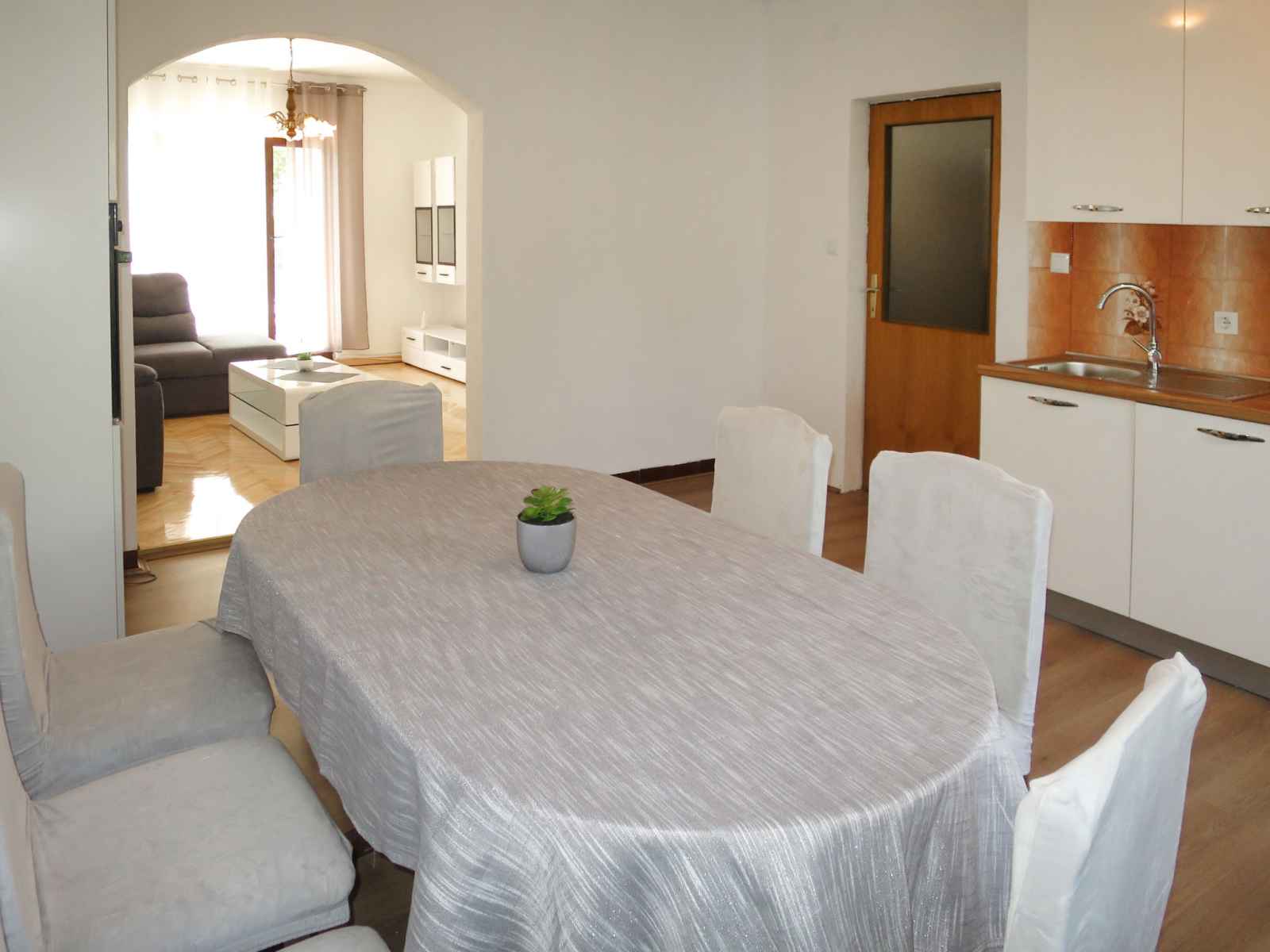 Maison 5 pièces 150 m2 sur 2 niveaux. séjour/salle à manger avec tv (écran plat), air-conditionné. sortie sur la terrasse. 2 chambres, chaque chambre avec: 1 grand-lit (180 cm, longueur 200 cm). cuisine ouverte (four, lave-vaisselle, 4 feux, bouilloire électrique, cafetière électrique). douche/wc, wc séparé. À l'étage supérieur: