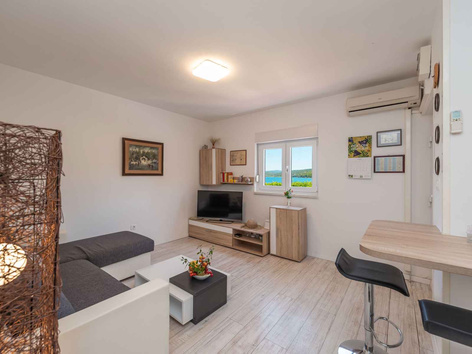 1 grand-lit (160 cm, longueur 190 cm). 1 chambre avec 2 lits (90 cm, longueur 190 cm). Cuisine ouverte (4 plaques de cuisson, four, lave-vaisselle, cafetière électrique). Douche/WC. Terrasse 12 m2 partiellement couverte. Meubles de terrasse. Vue sur la mer. A disposition: Internet (Connexion WIFI). Maximum 2 animaux/ chiens autorisés.
