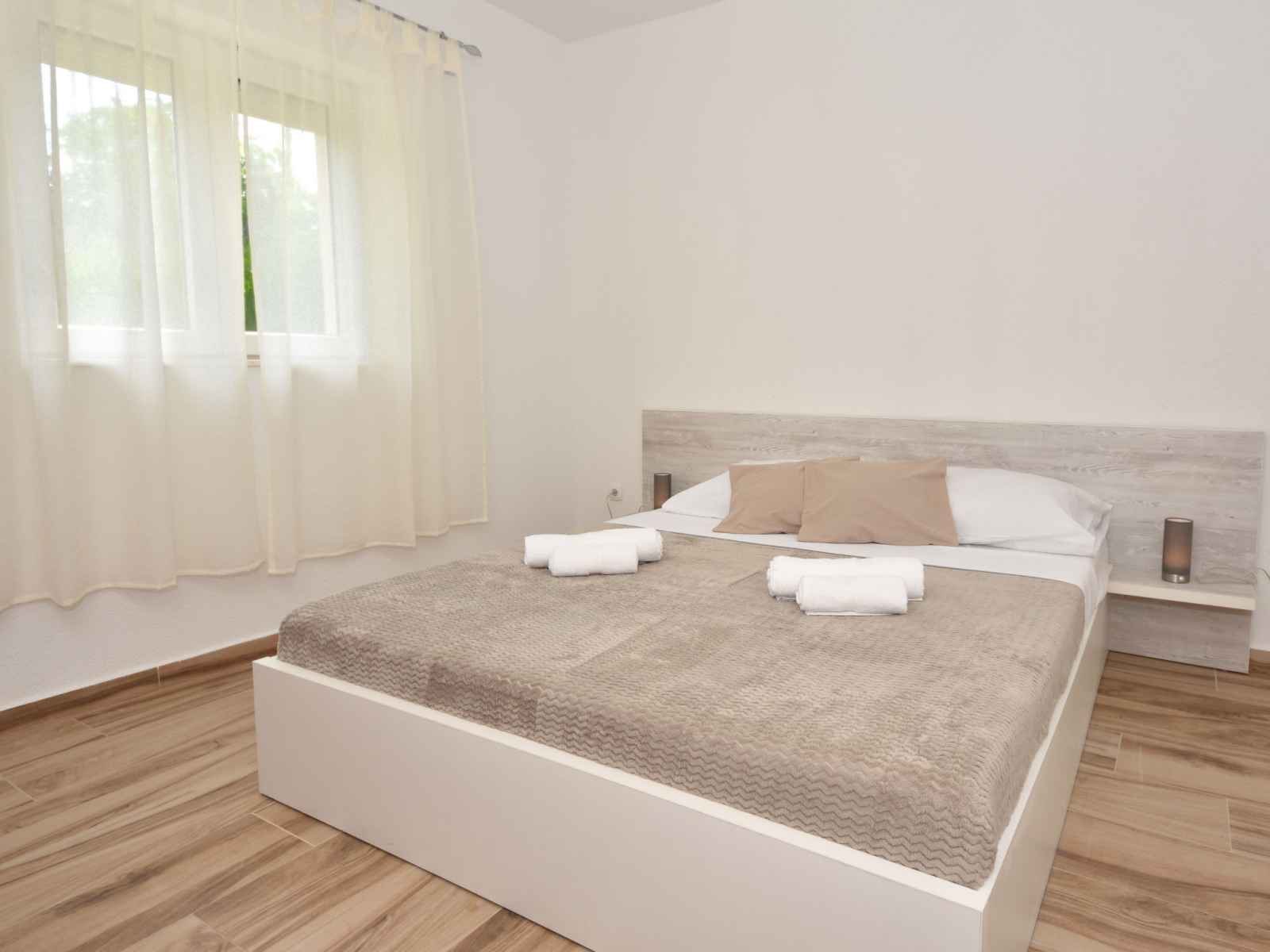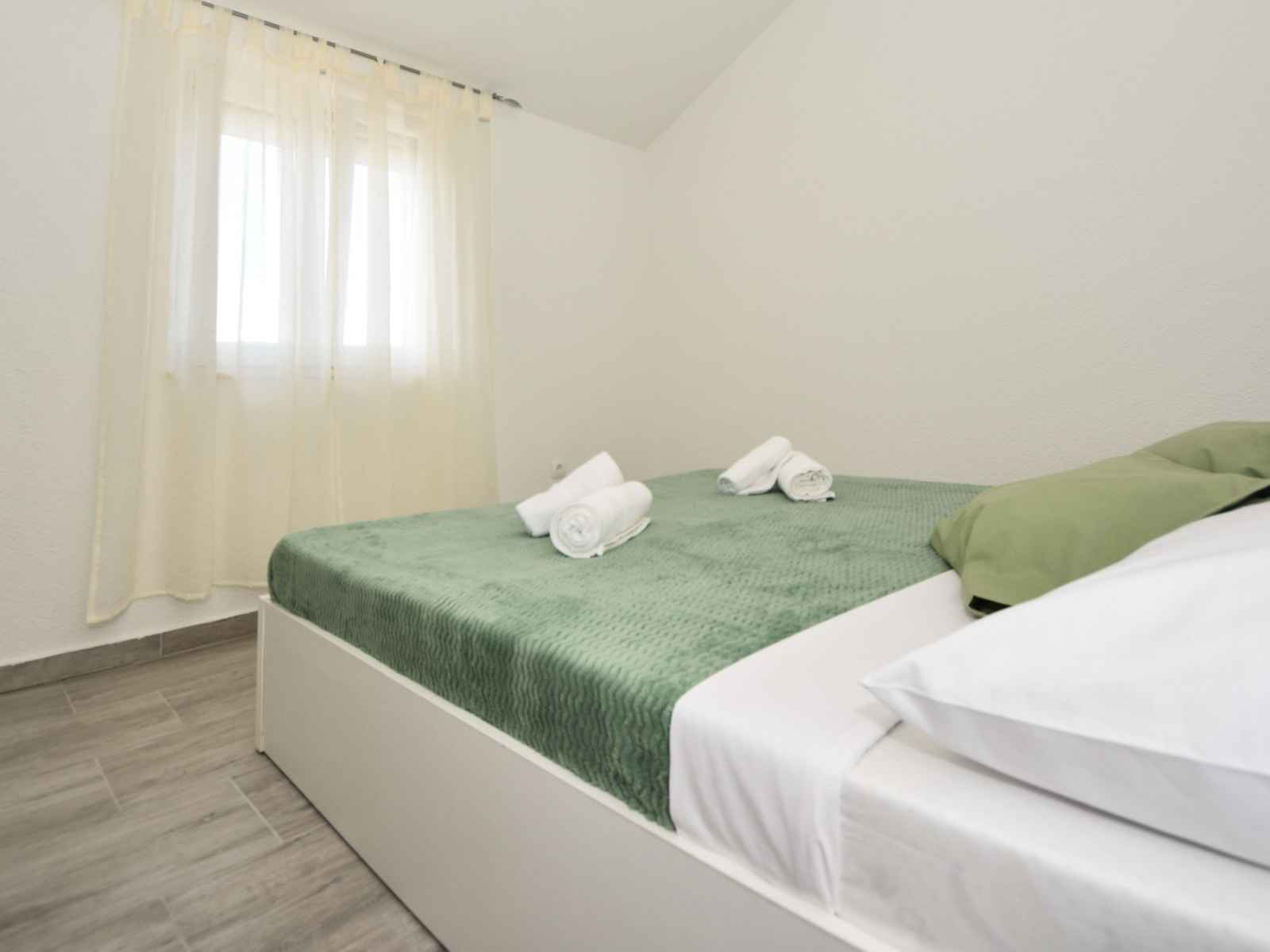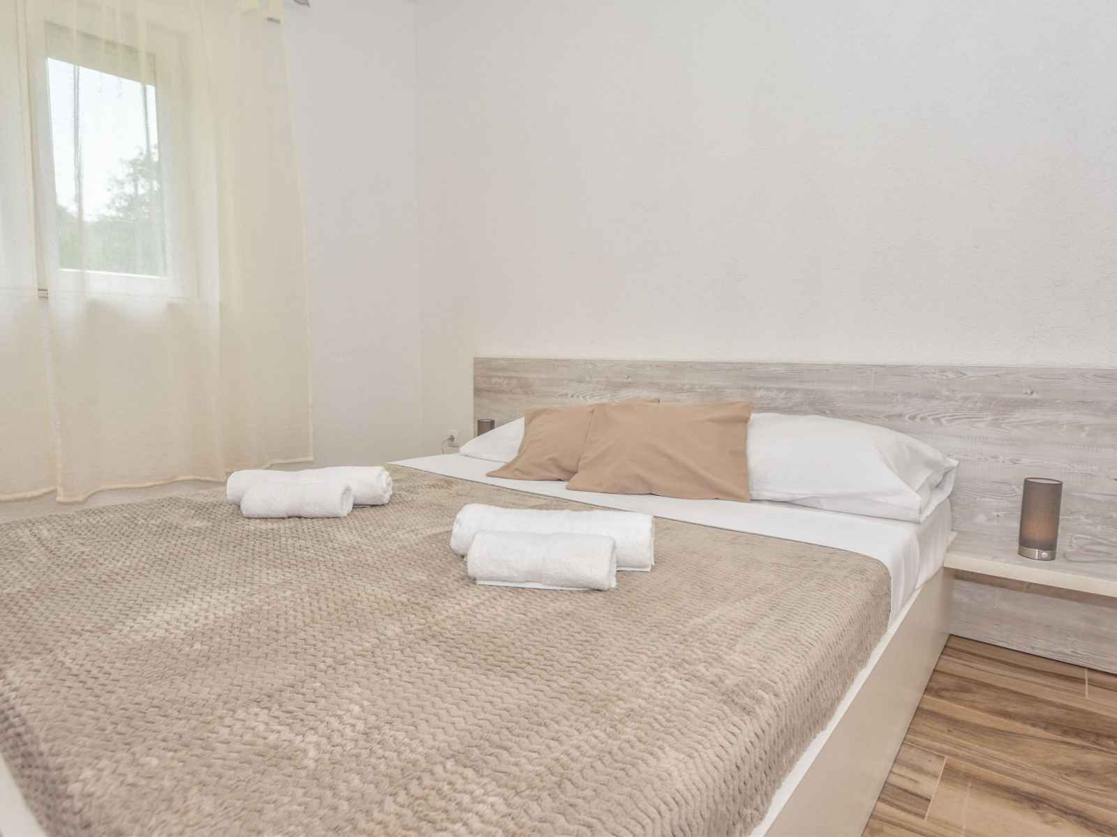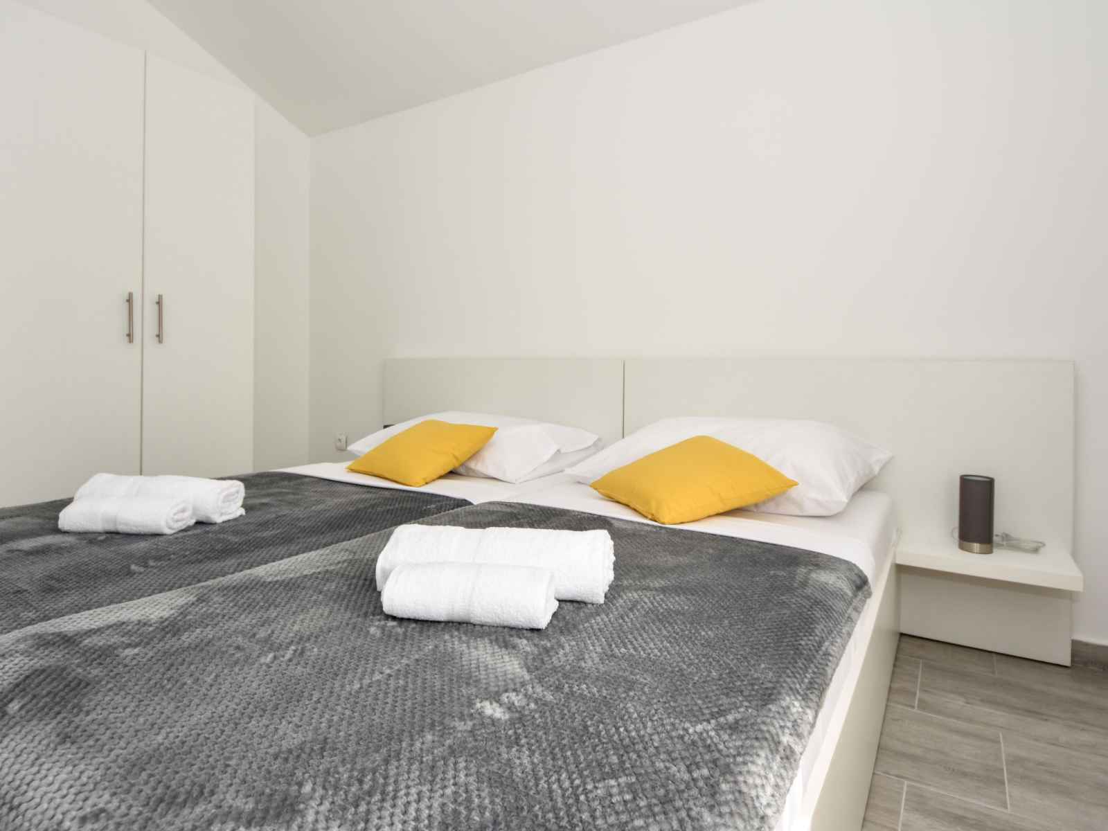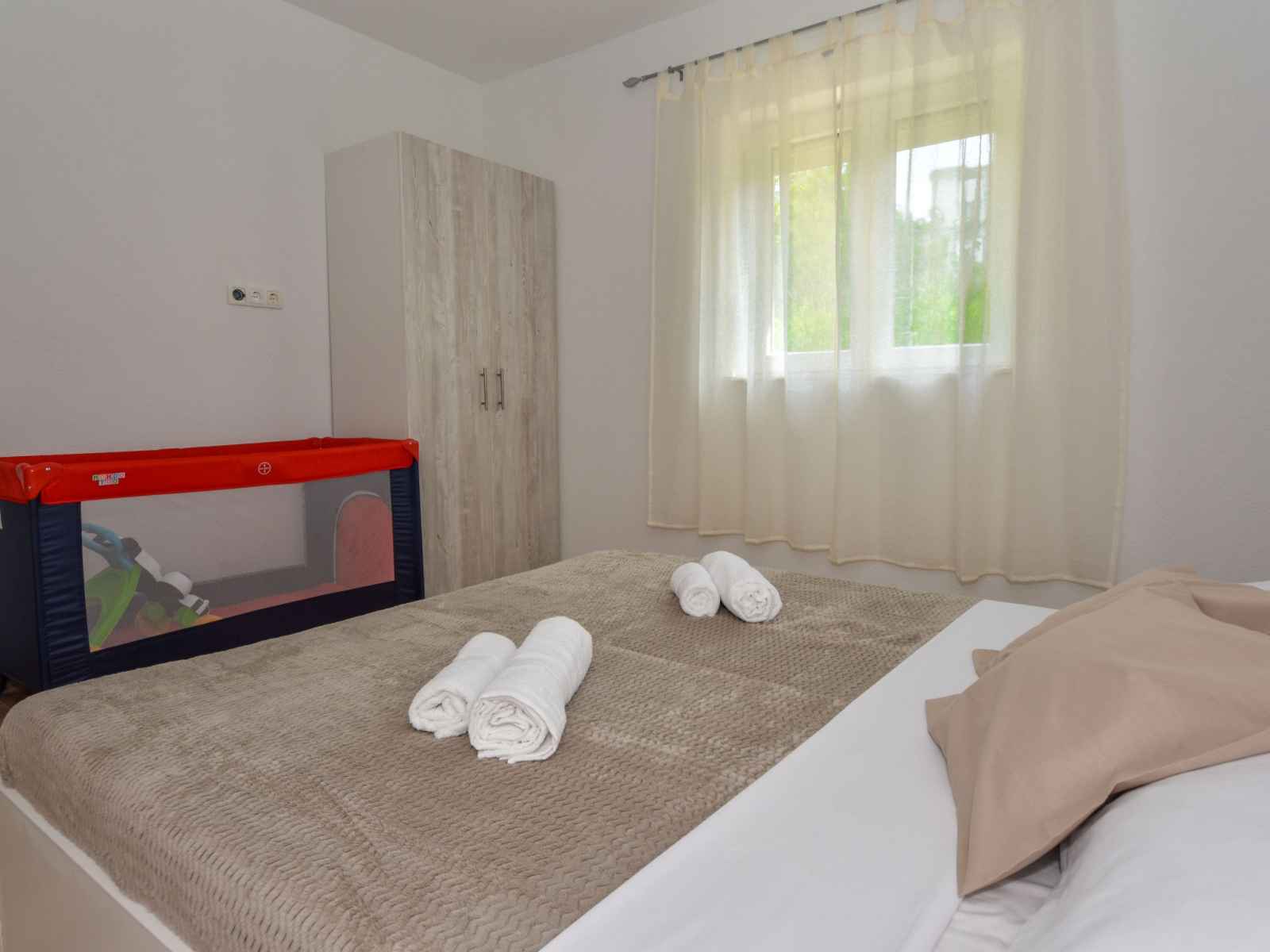 sur la piscine. Douche/WC. À l'étage supérieur: (escalier extérieur) entrée avec air-conditionné. 2 chambres, mansardées hauteur plafond 110 - 230 cm, chaque chambre avec: 1 grand-lit (180 cm, longueur 200 cm), ventilateur. 1 chambre, mansardée hauteur plafond 110 - 220 cm avec 2 lits (90 cm, longueur 200 cm), ventilateur. 1 chambre, mansardée hauteur plafond 110 - 202 cm avec 1 grand-lit (180 cm, longueur 200 cm), ventilateur. Douche/WC. Terrasse 30 m2. Meubles de terrasse, chaises longues. Vue sur la piscine. A disposition: coffre-fort, fer à repasser, sèche-cheveux. Internet (Connexion WIFI, gratuit).