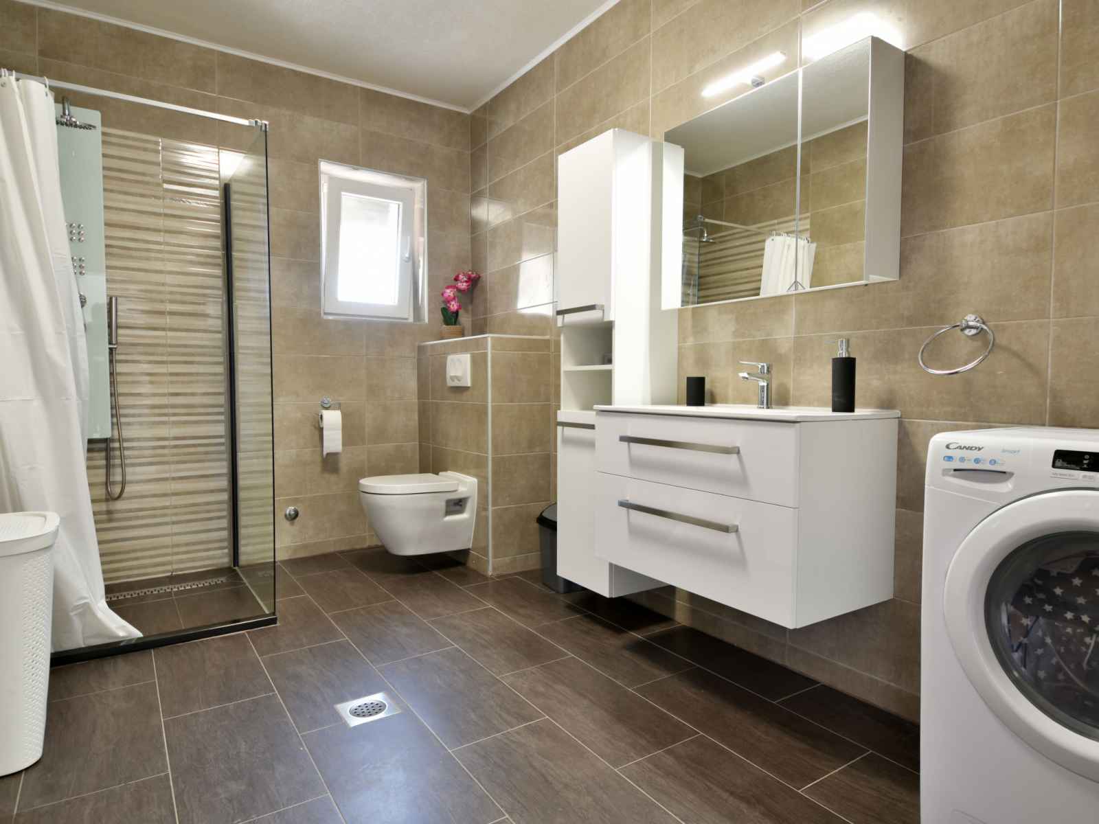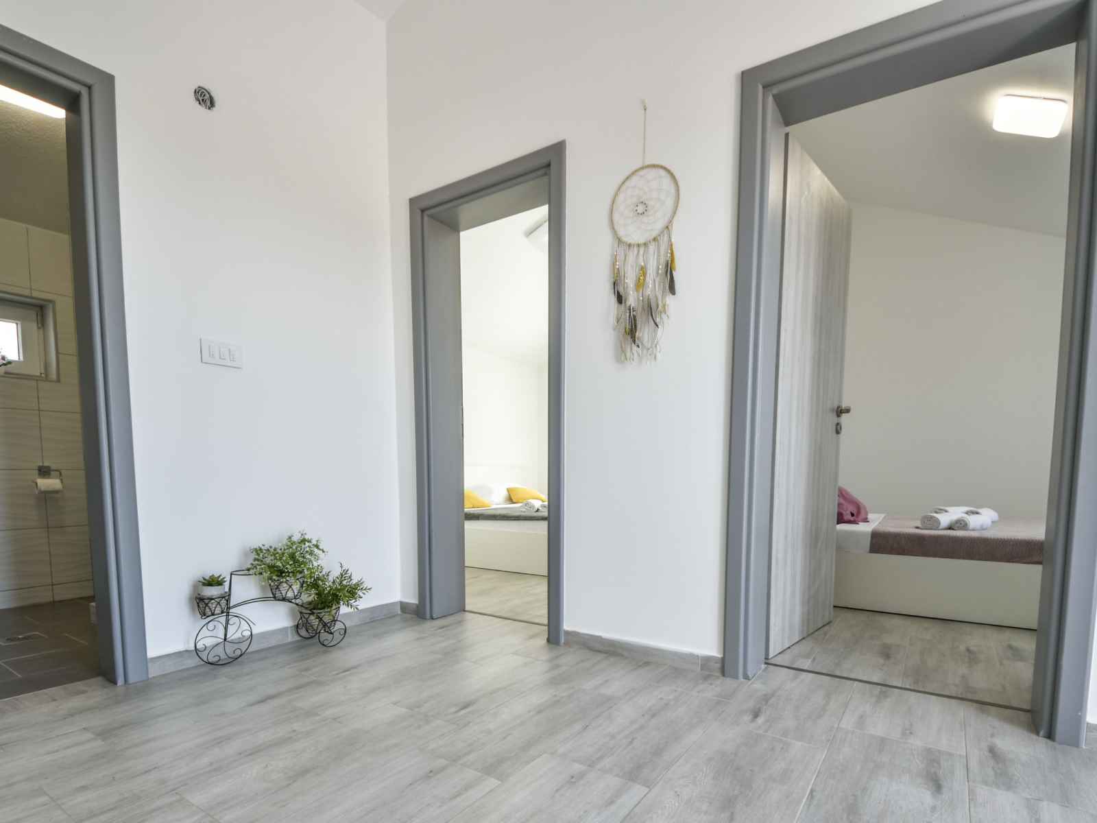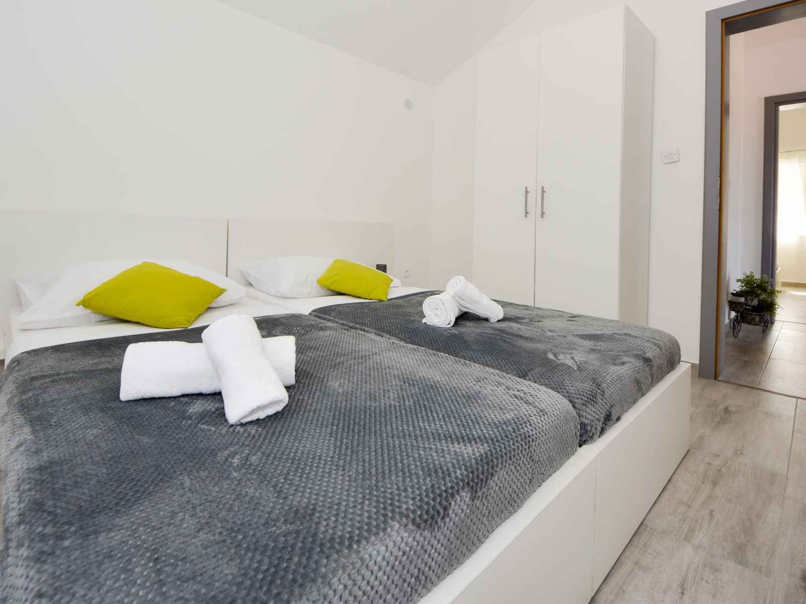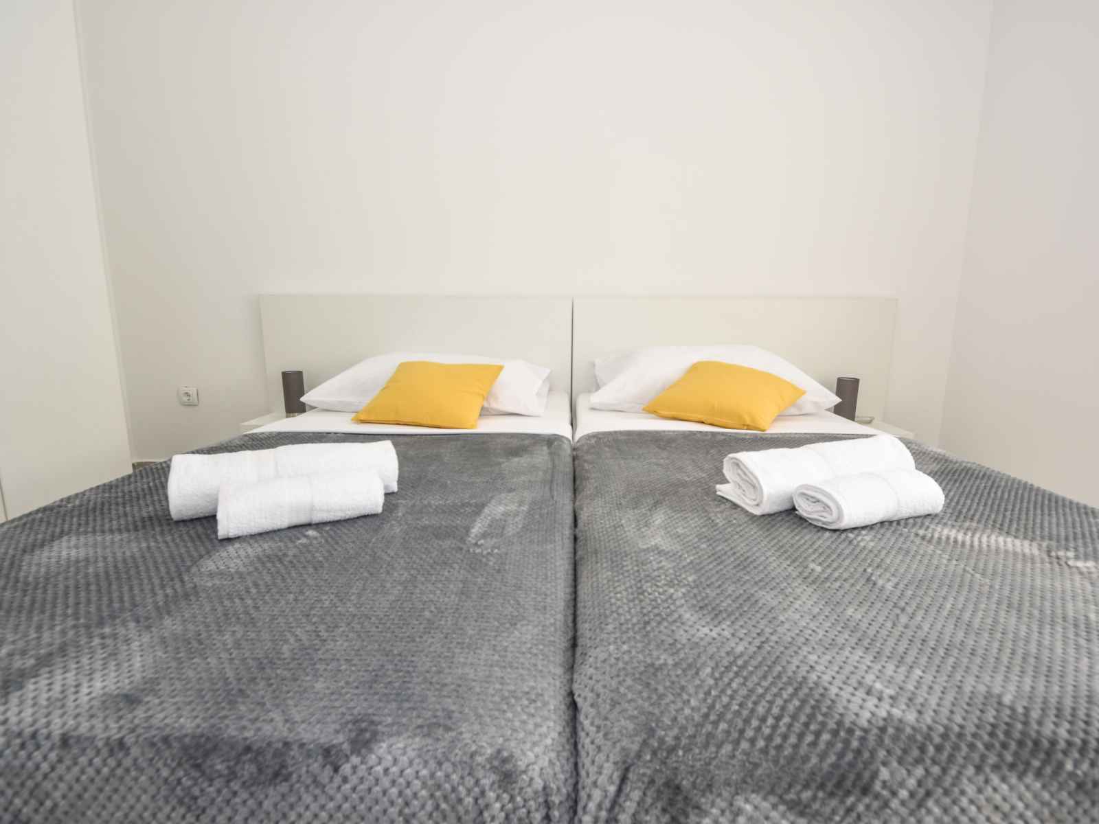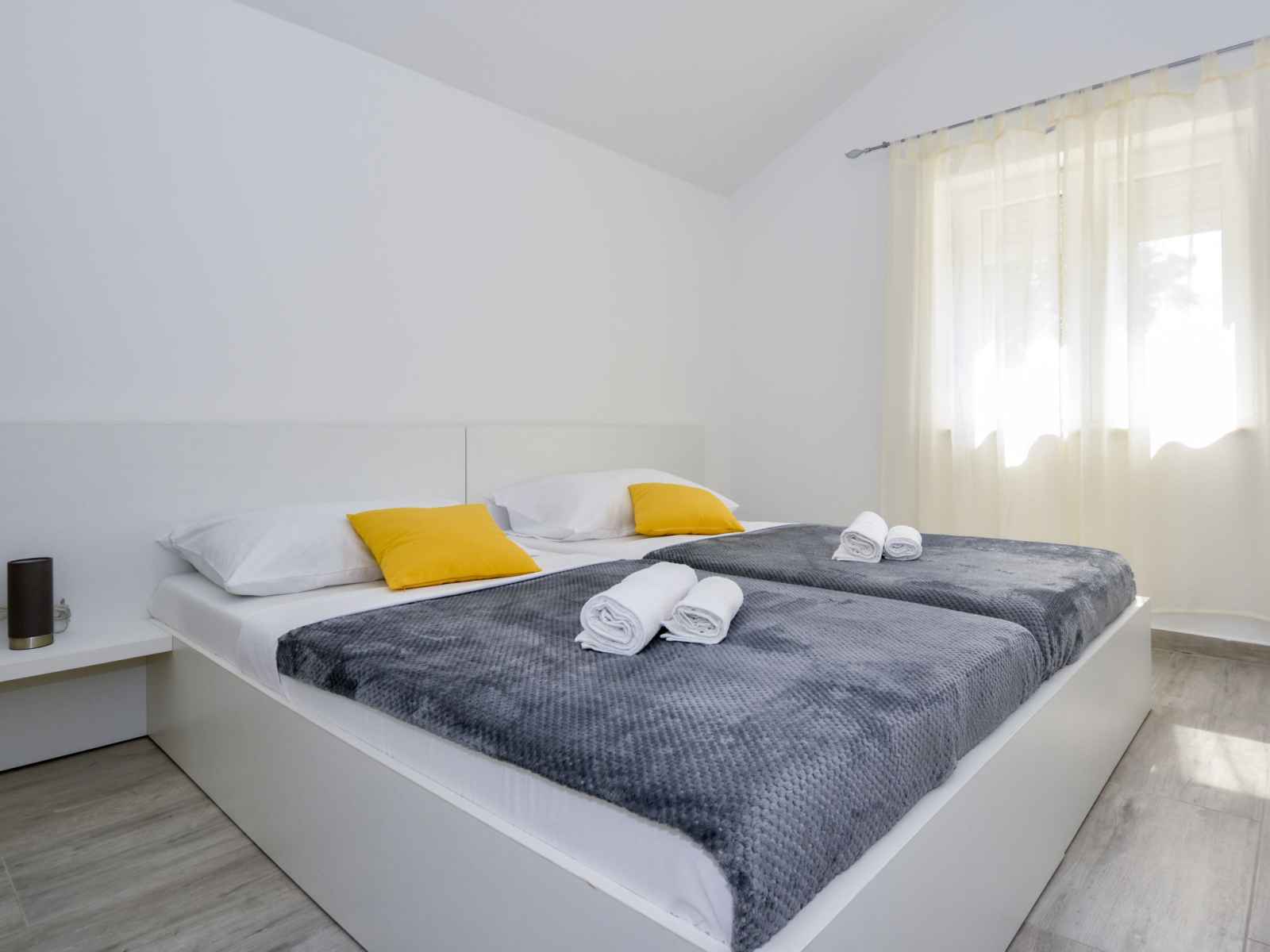 sur la piscine. Douche/WC. À l'étage supérieur: (escalier extérieur) entrée avec air-conditionné. 2 chambres, mansardées hauteur plafond 110 - 230 cm, chaque chambre avec: 1 grand-lit (180 cm, longueur 200 cm), ventilateur. 1 chambre, mansardée hauteur plafond 110 - 220 cm avec 2 lits (90 cm, longueur 200 cm), ventilateur. 1 chambre, mansardée hauteur plafond 110 - 202 cm avec 1 grand-lit (180 cm, longueur 200 cm), ventilateur. Douche/WC. Terrasse 30 m2. Meubles de terrasse, chaises longues. Vue sur la piscine. A disposition: coffre-fort, fer à repasser, sèche-cheveux. Internet (Connexion WIFI, gratuit).