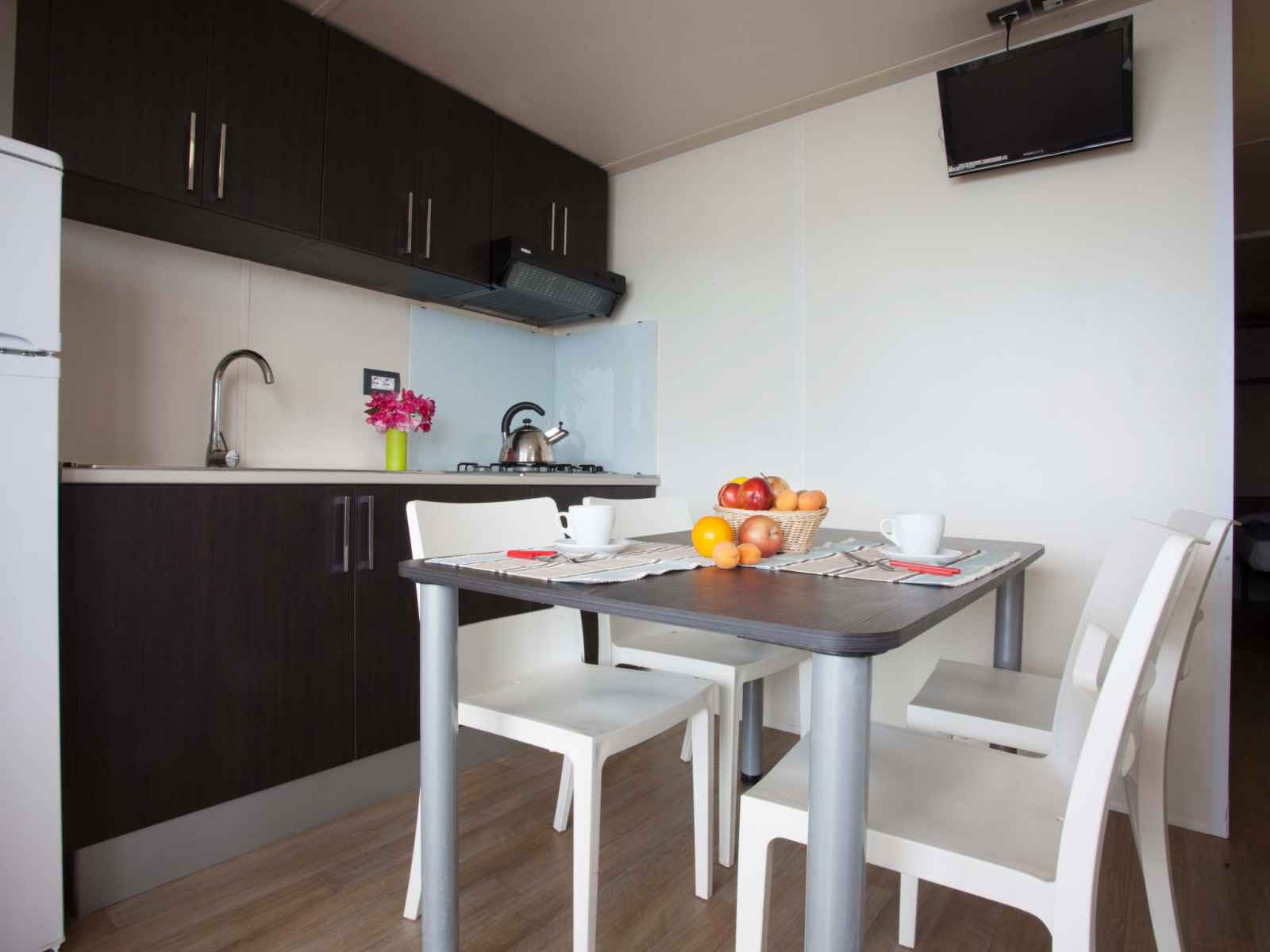 "baia relax new plus", 3 pièces mobil home 25 m2. aménagement moderne: séjour/salle à manger avec table pour les repas et tv (satellite). 1 chambre avec 1 grand-lit (140 cm). 1 chambre avec 2 lits (70 cm), 1 x 1 lits superposés (65 cm, longueur 180 cm). coin cuisine (4 feux, congélateur). douche/wc. air-conditionné, chauffage à air chaud