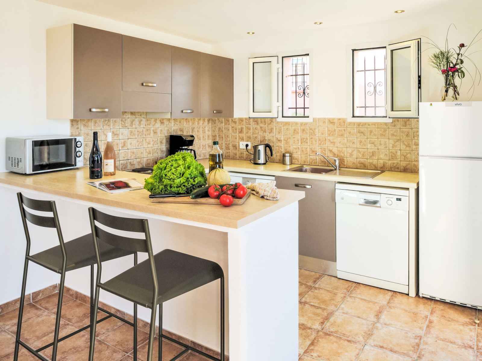 "babo", villa 3 pièces 80 m2 sur 2 niveaux. aménagement confortable et plaisant: séjour/salle à manger avec table pour les repas et tv (écran plat). sortie sur la terrasse. cuisine ouverte (4 plaques de cuisson, four, lave-vaisselle, grille-pain, bouilloire électrique, micro-ondes, cafetière électrique). chauffage électrique,