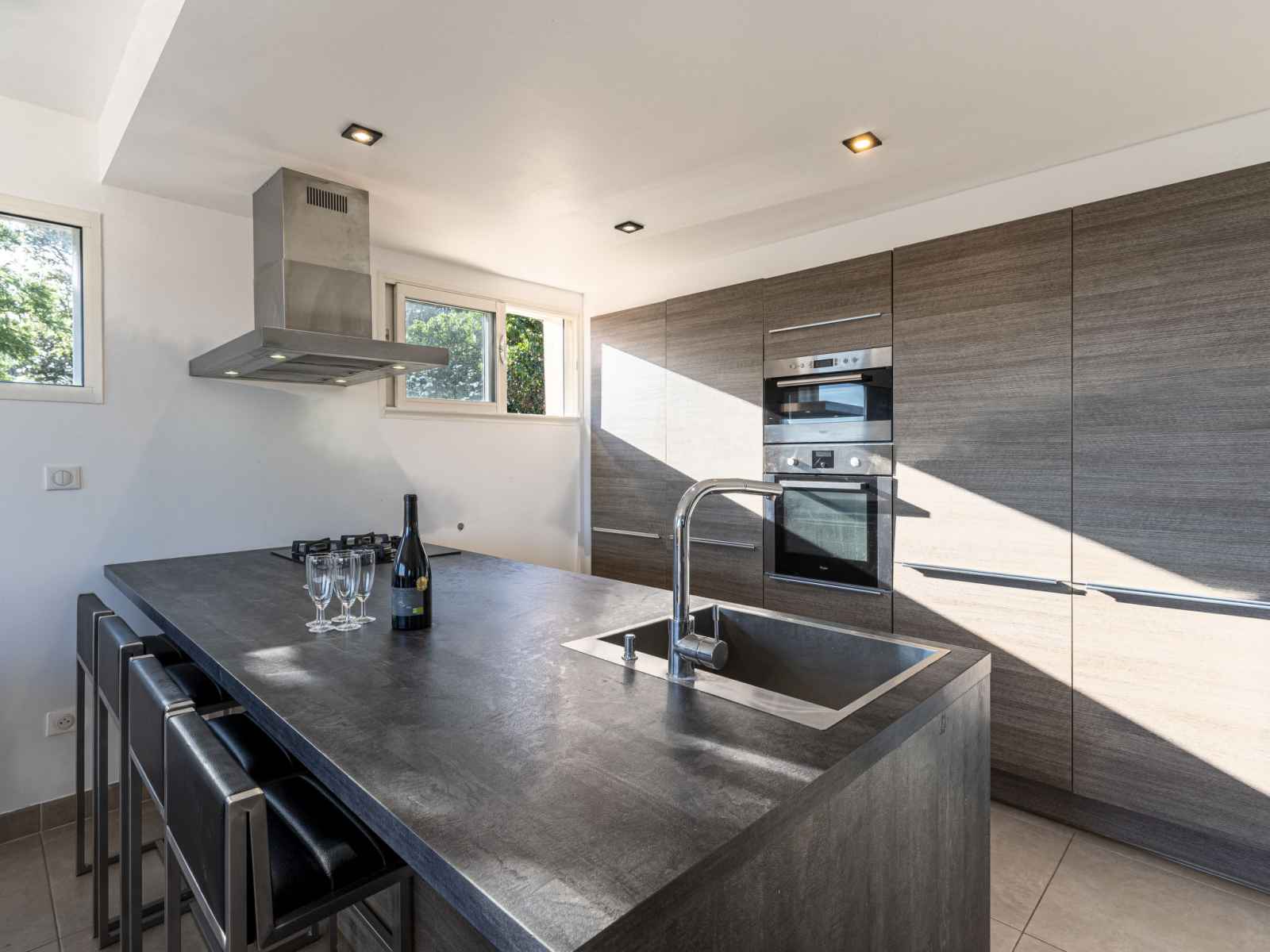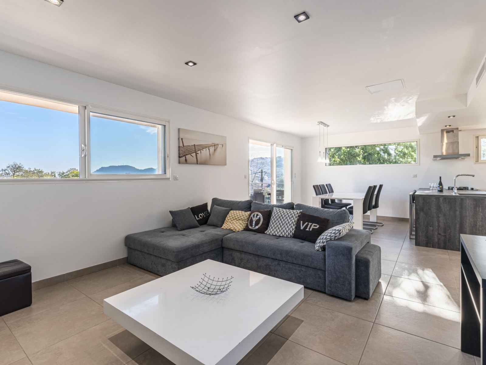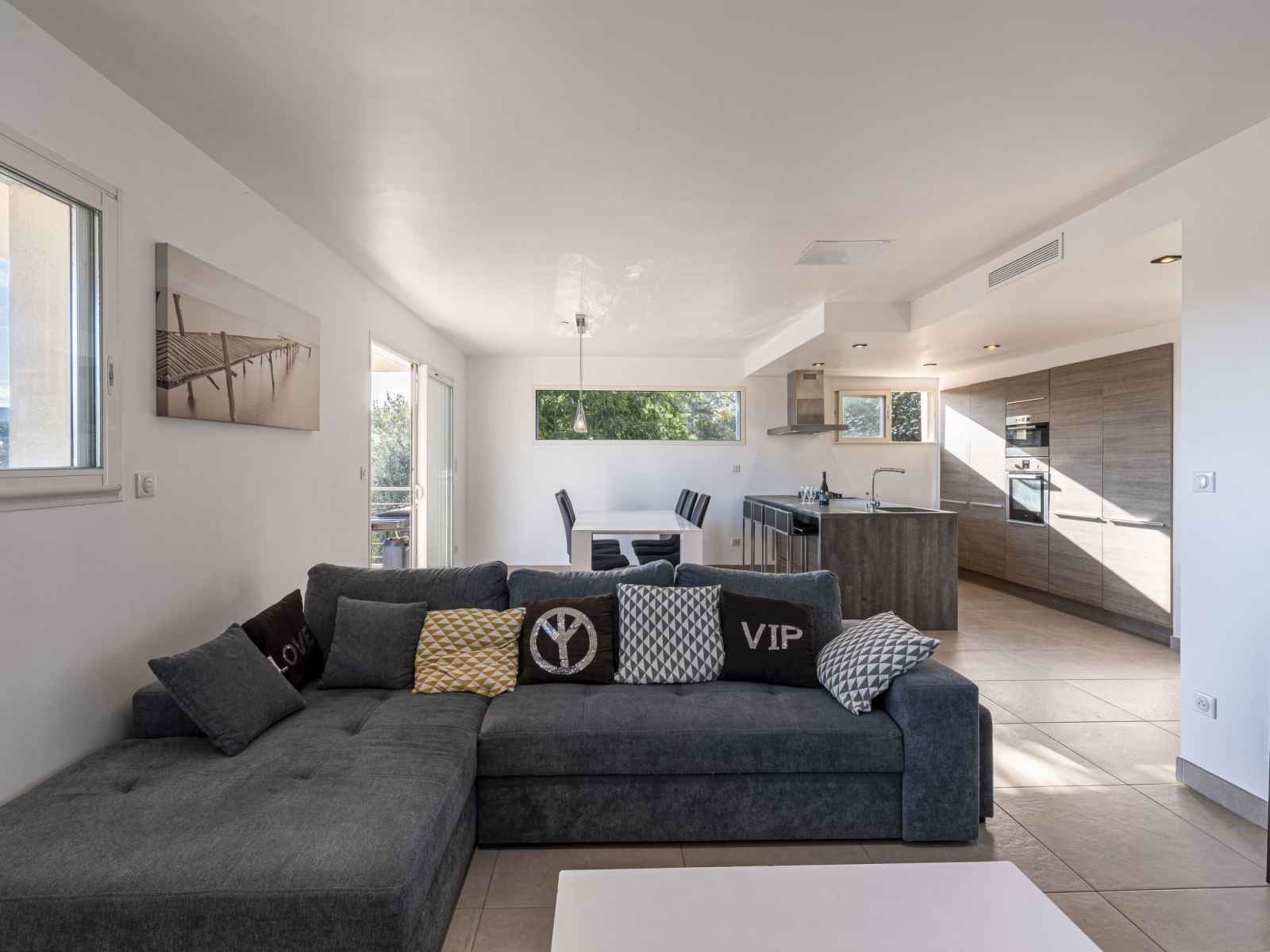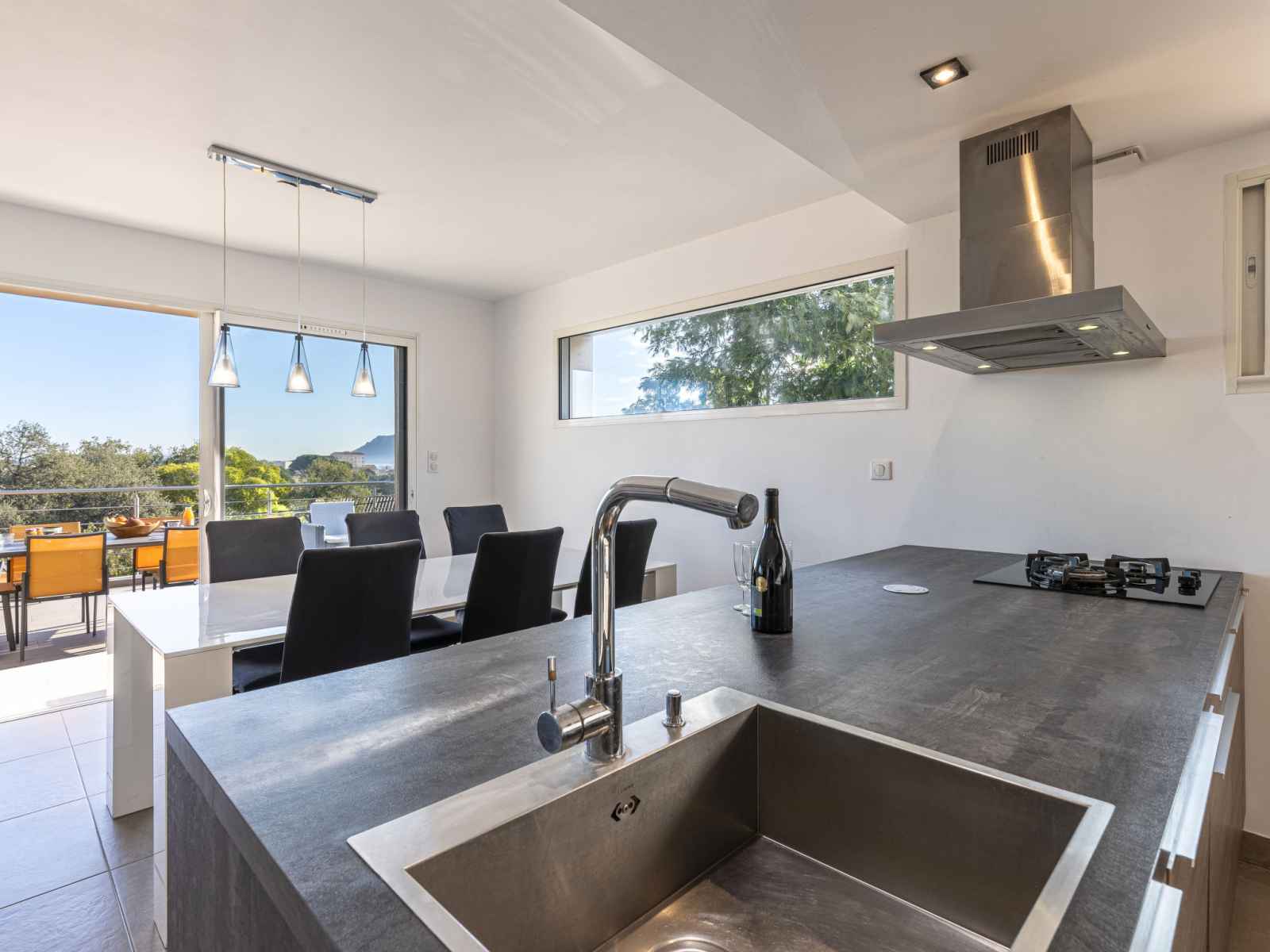 "casa caminu", maison jumelée 4 pièces 90 m2 sur 2 niveaux. aménagement moderne: séjour/salle à manger avec baie vitrée avec table pour les repas, wc séparés et tv (écran plat), volet roulant électrique. sortie sur la terrasse. cuisine ouverte (3 plaques de cuisson, four, lave-vaisselle, grille-pain, bouilloire électrique, micro-ondes,
