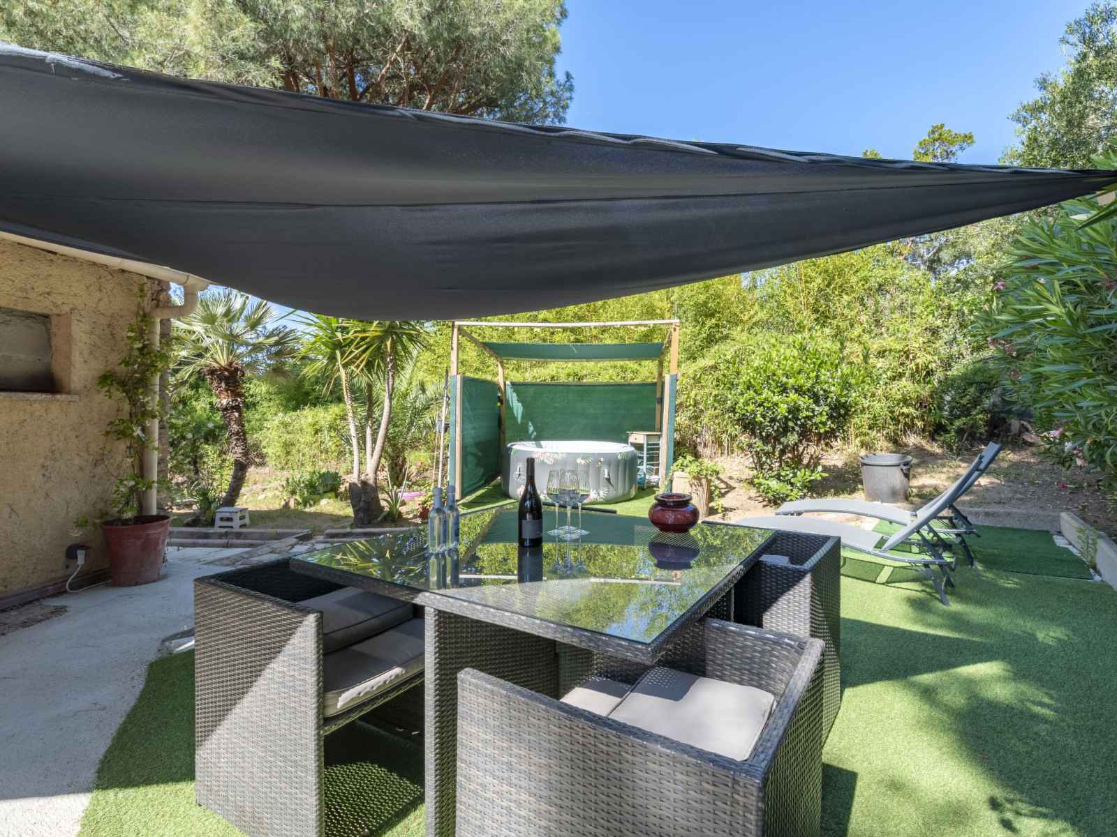 Petite résidence "casa germaine", rénovée en 2024. au centre de porto-vecchio, situation centrale, tranquille, à 1.7 km de la mer, à 4.3 km de la plage. a usage privé: petit jardin entretenu (clôturé). terrasse (17 m2), meubles de jardin, barbecue, place de parking sur le terrain. magasins, magasin d'alimentation, restaurant 550 m, arrêt