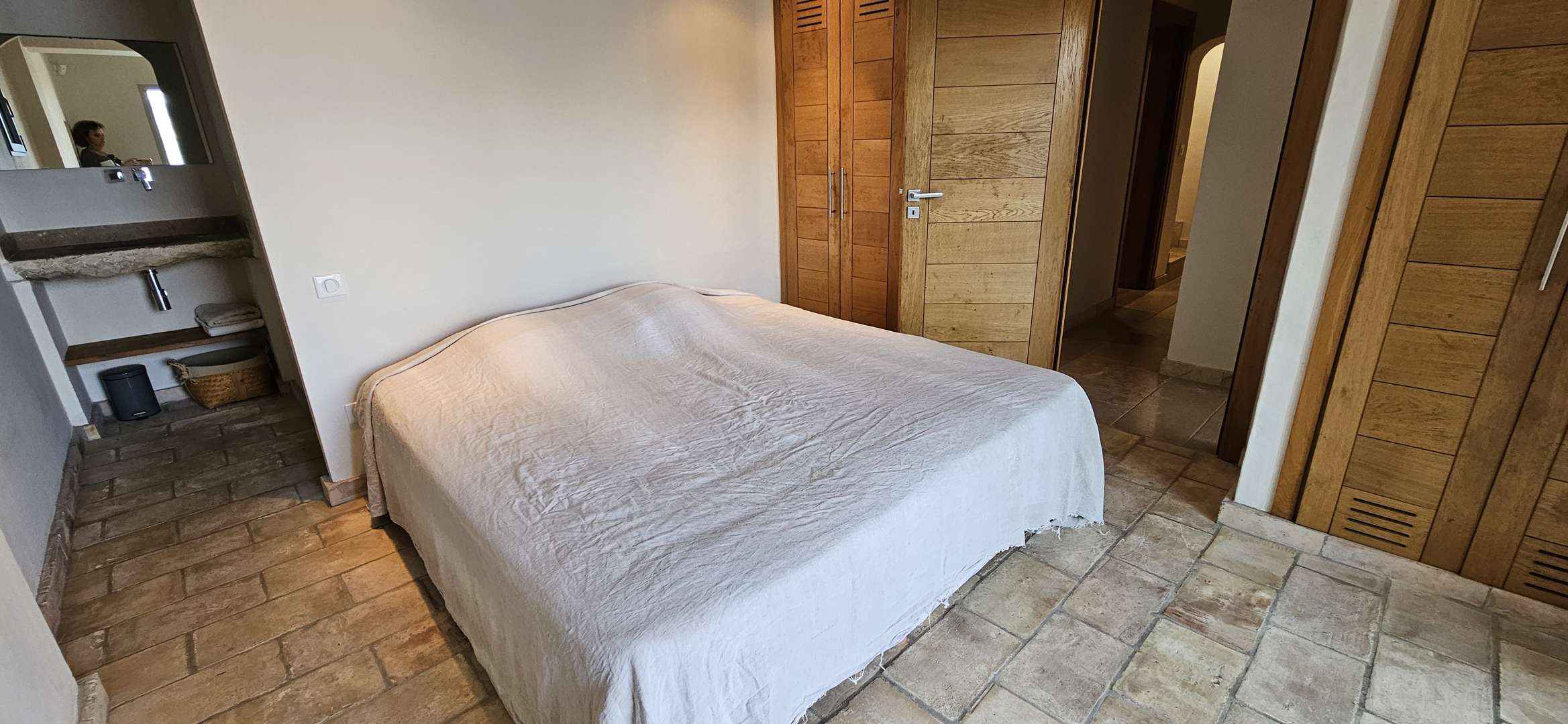 - Chambre 1 (Chambre 1 : suite parentale avec lit en 180, dressing, coffre-fort, balcon vue mer. salle d'eau attenante avec douche à l'italienne, vasque, sèche-serviettes. wc.