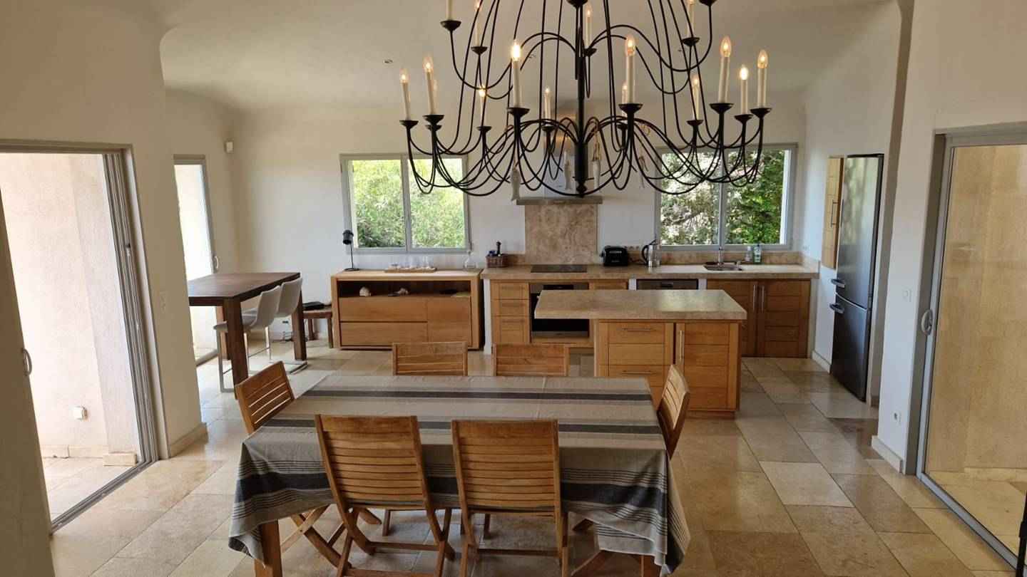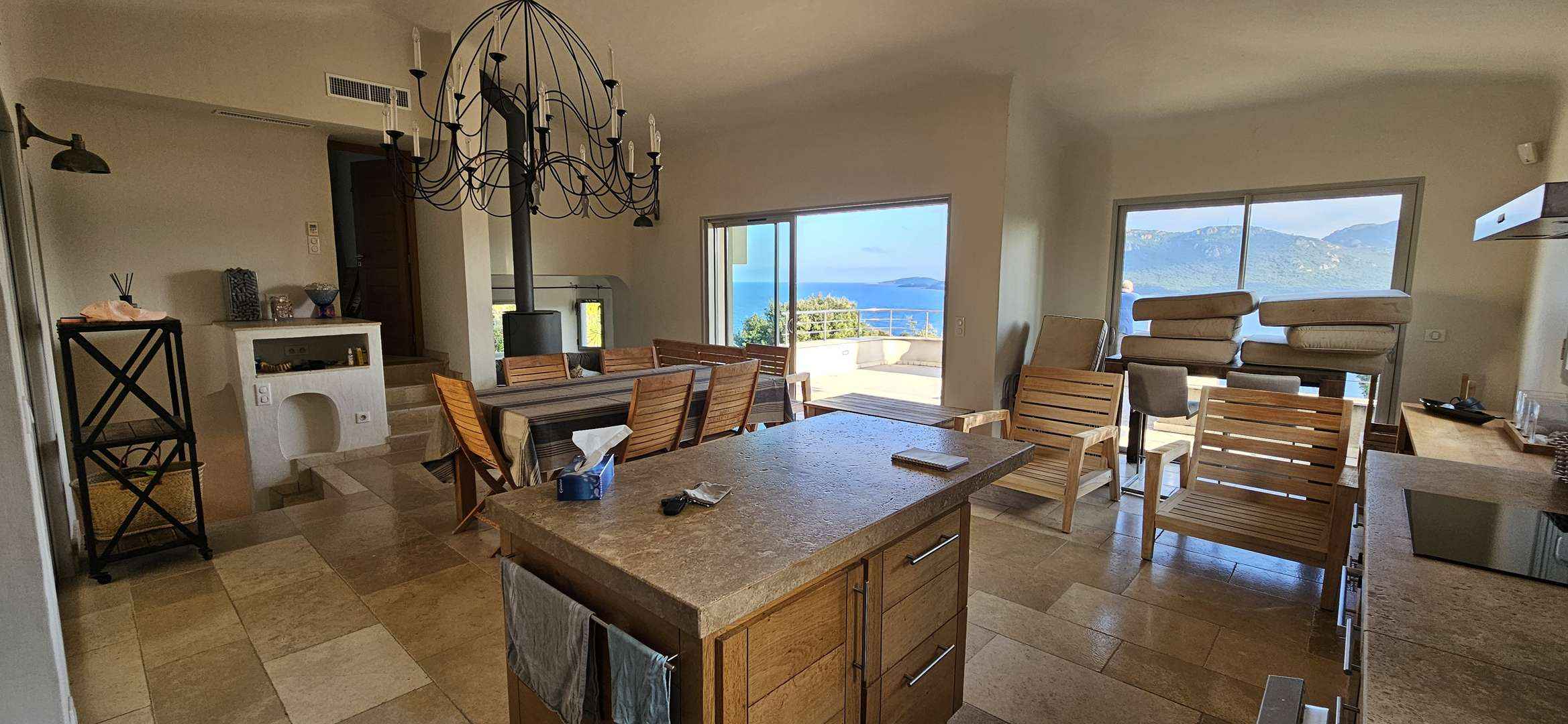 - Séjour/ cuisine (Séjour traversant avec cuisine américaine équipée, lave-vaisselle, cafetière illy, plaque de cuisson vitrocéramique, four électrique, combiné frigo-congélateur, cafetière illy, grille pain, bouilloire... le tout ouvrant sur une terrasse couverte côté nord avec un barbecue fixe et salle à manger, et une terrasse côté sud avec magnifique vue sur le golfe et port de porto-vecchio. un joli salon avec banquette maçonnée et tv.
