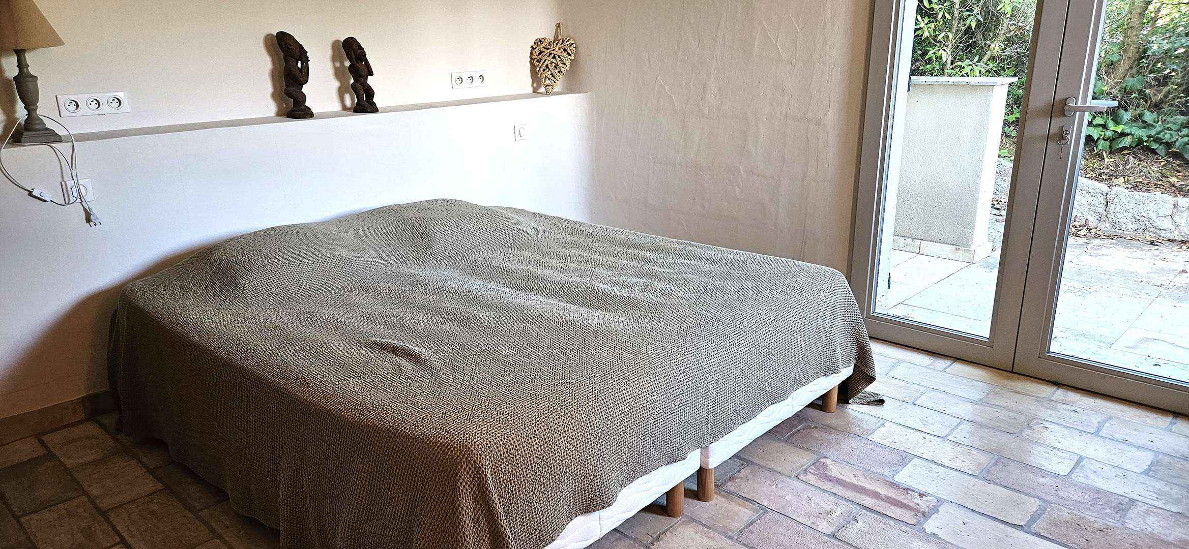Chambre 3 : 1 lit en 160, porte-fenêtre donnant sur piscine, salle d'eau avec douche, vasque, sèche-serviettes.