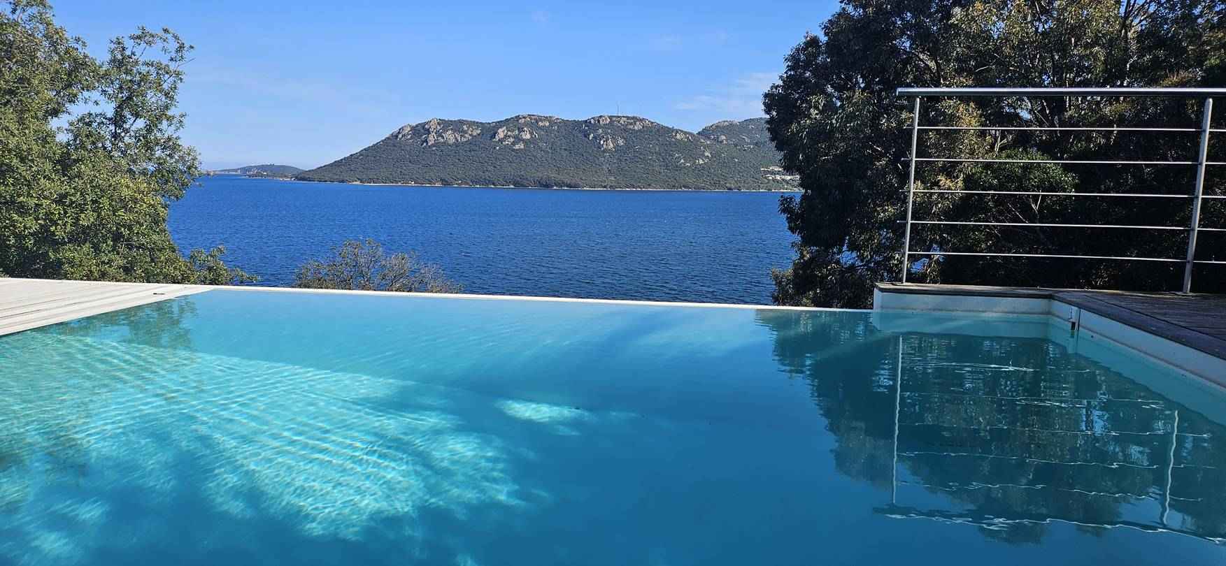 Une terrasse en Ipé exposée plein sud avec table et chaises de jardin , salon de jardin avec une belle vue mer et une piscine a débordement de 10x4 sécurisée par un volet roulant, 10 transats de piscine et une douche extérieure.