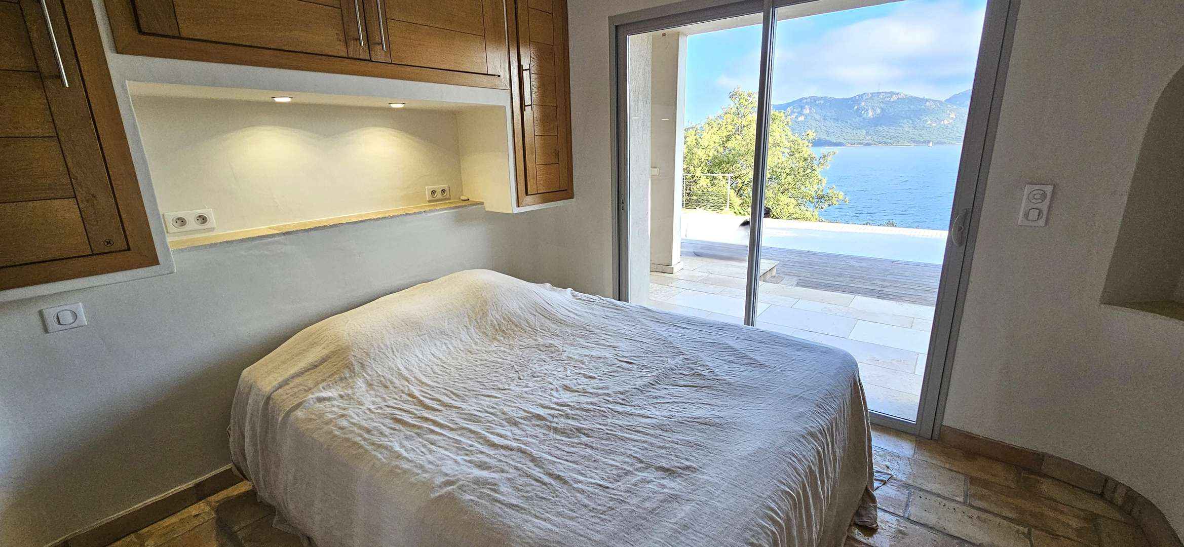Chambre 1 : suite parentale avec lit en 180, dressing, coffre-fort, balcon vue mer. Salle d'eau attenante avec douche à l'italienne, vasque, sèche-serviettes. WC.