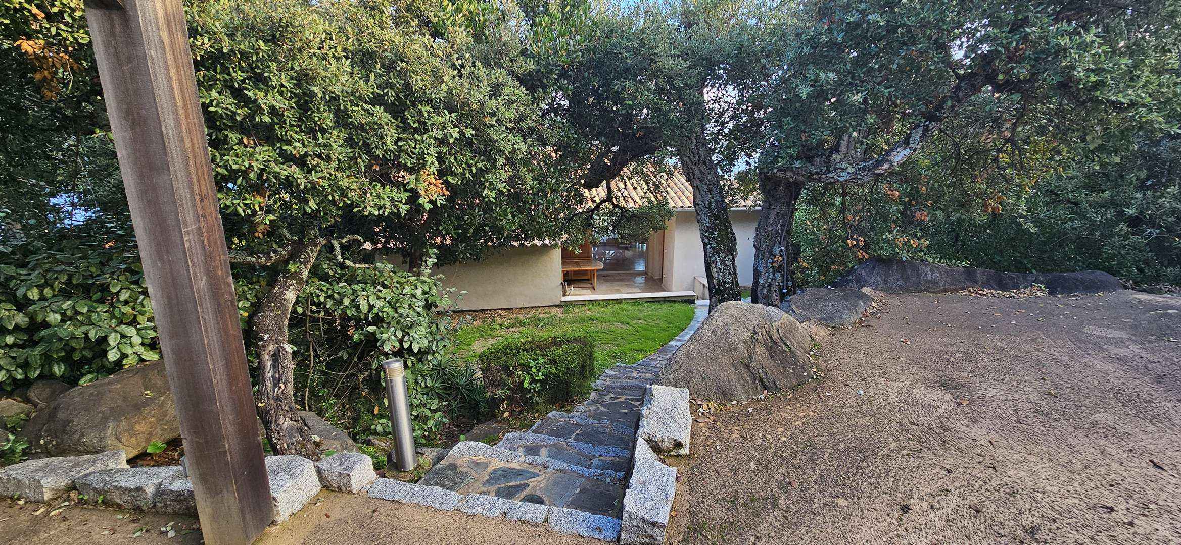 Jardin arboré et clos avec 2 entrées, portails électriques, quart-port 2 véhicules côté nord et garage côté sud.