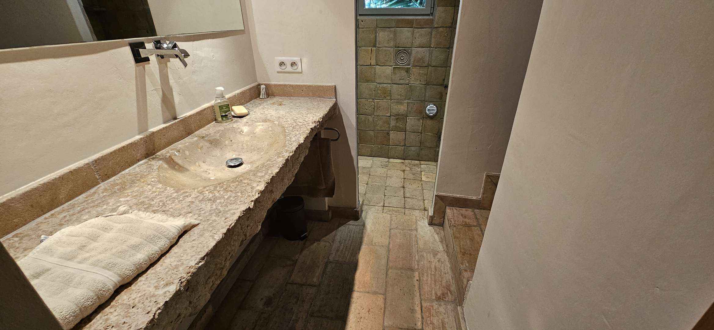 - Chambre 3 (Chambre 3 : 1 lit en 160, porte-fenêtre donnant piscine, salle d'eau avec douche, vasque, sèche-serviettes.
