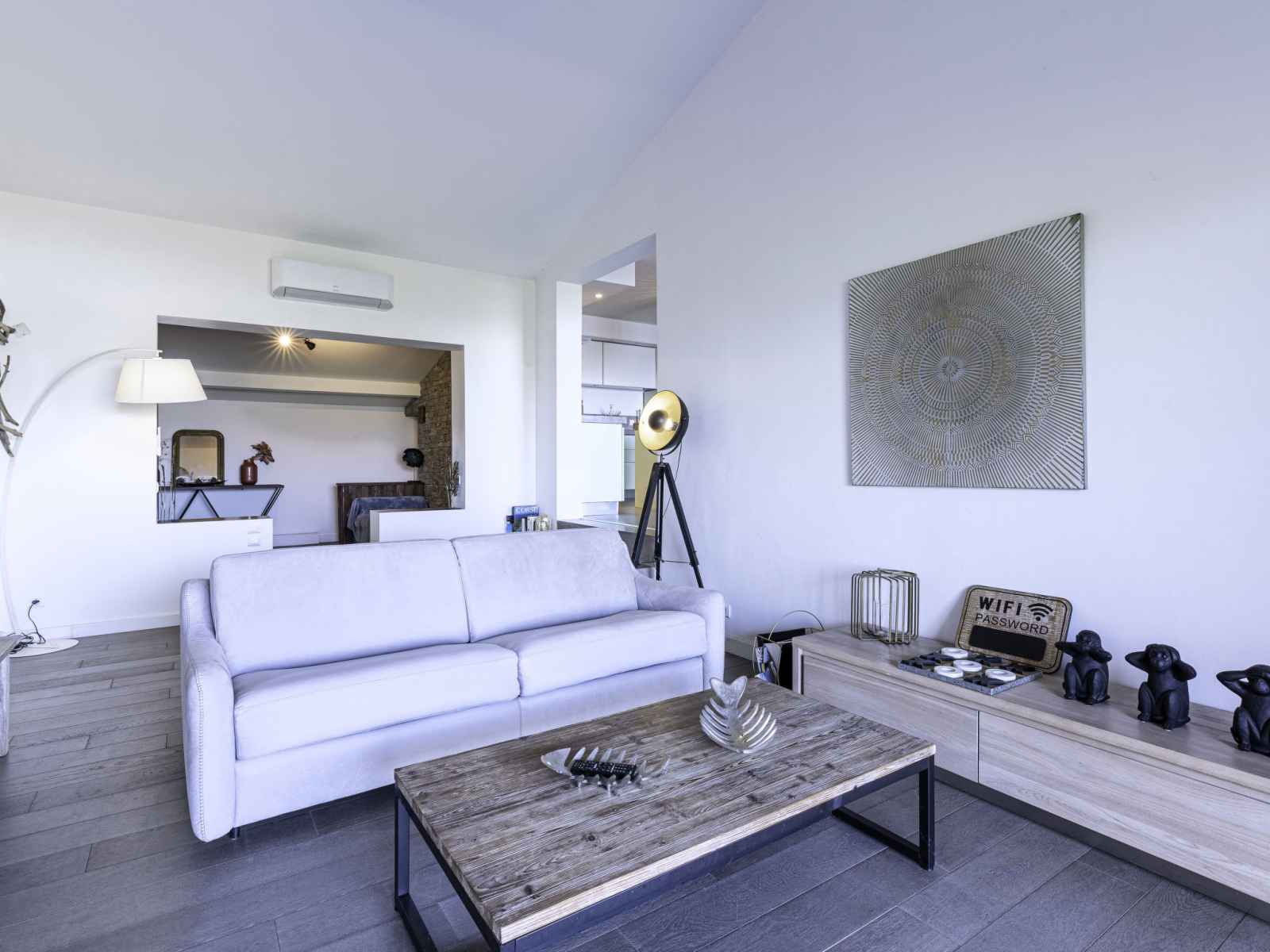 grille-pain, bouilloire électrique, micro-ondes, congélateur, cafetière électrique, ilot de cuisine) avec table pour les repas. Sortie sur la terrasse. Bain/WC. Chauffage électrique, air-conditionné. À l'étage inférieur: 1 chambre avec 1 grand-lit (160 cm, longueur 200 cm), bain/WC et TV (écran plat). Grande terrasse 50 m2, situation ouest. Meubles de terrasse, barbecue, chaises longues (2). Superbe, sur la mer et les montagnes. A disposition: lave-linge. Internet (Connexion WIFI, gratuit). Veuillez noter: logement non-fumeur. Détecteur de fumée. Annonce d'un particulier (art 155, IV du CGI).