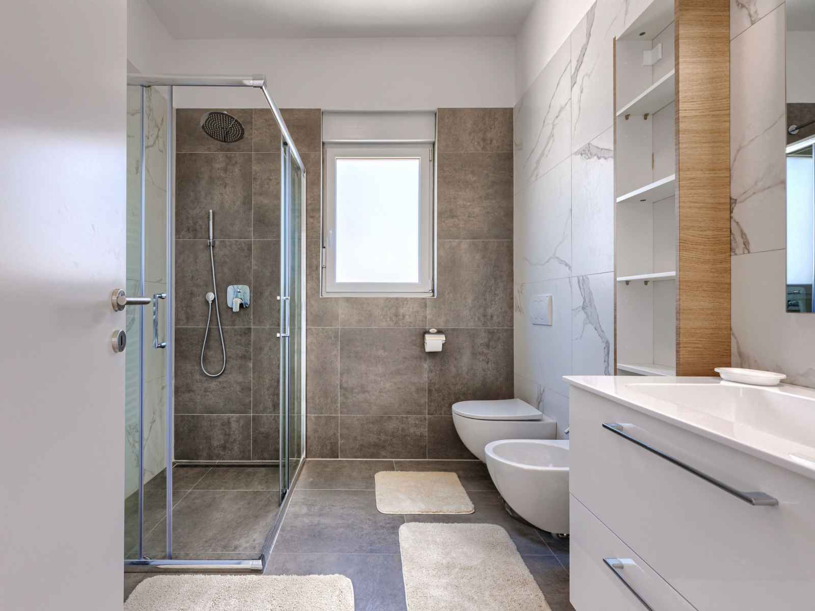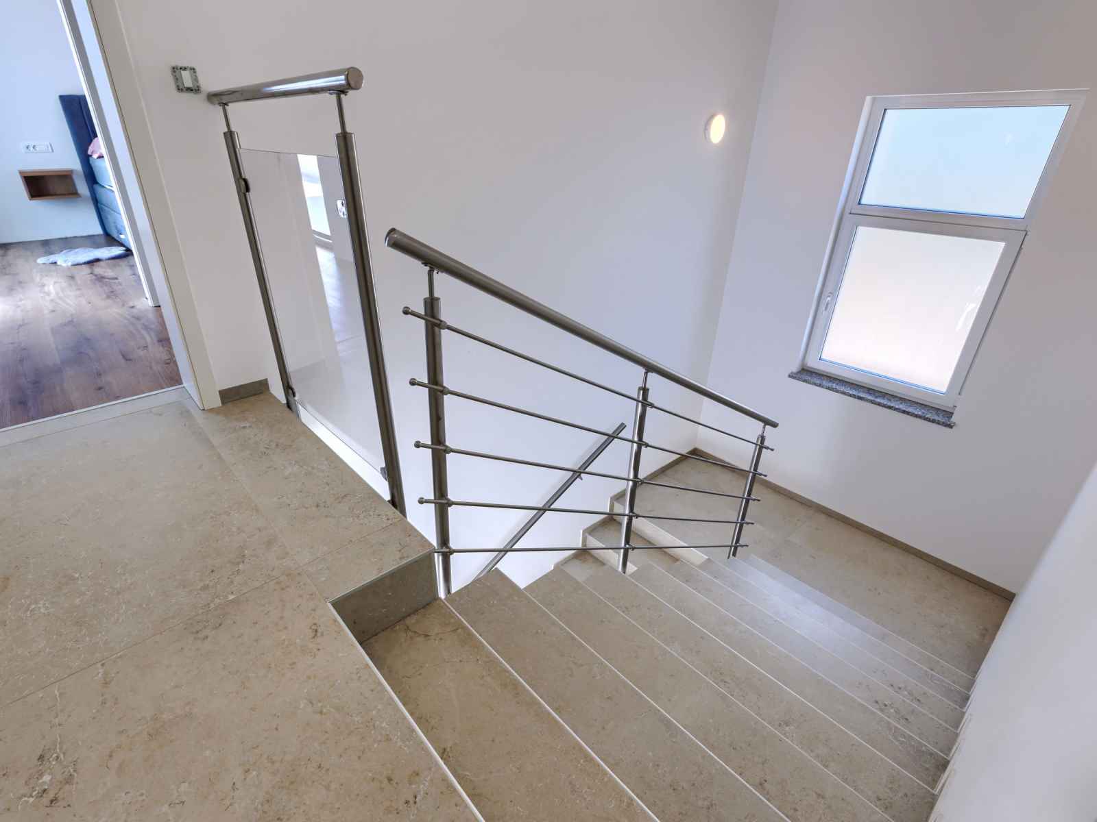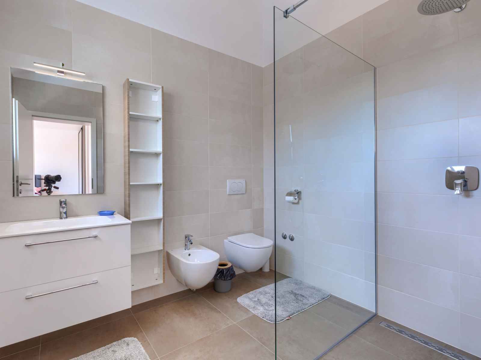 lave-vaisselle, 4 plaques vitrocéramiques, grille-pain, bouilloire électrique, micro-ondes, congélateur, cafetière électrique). WC séparé. À l'étage supérieur: 3 chambres, chaque chambre avec: 1 grand-lit (160 cm, longueur 200 cm), douche/WC et TV (satellite) (écran plat), air-conditionné. Terrasse 6 m2. Meubles de terrasse, chaises longues. Vue partielle sur la mer. A disposition: sèche-cheveux. Internet (Connexion WIFI, gratuit). Maximum 1 animal/ chien autorisé.