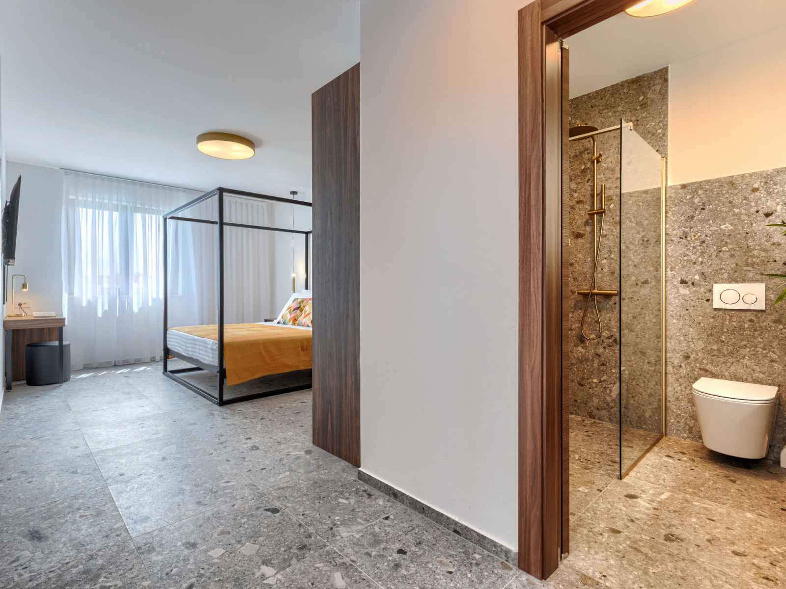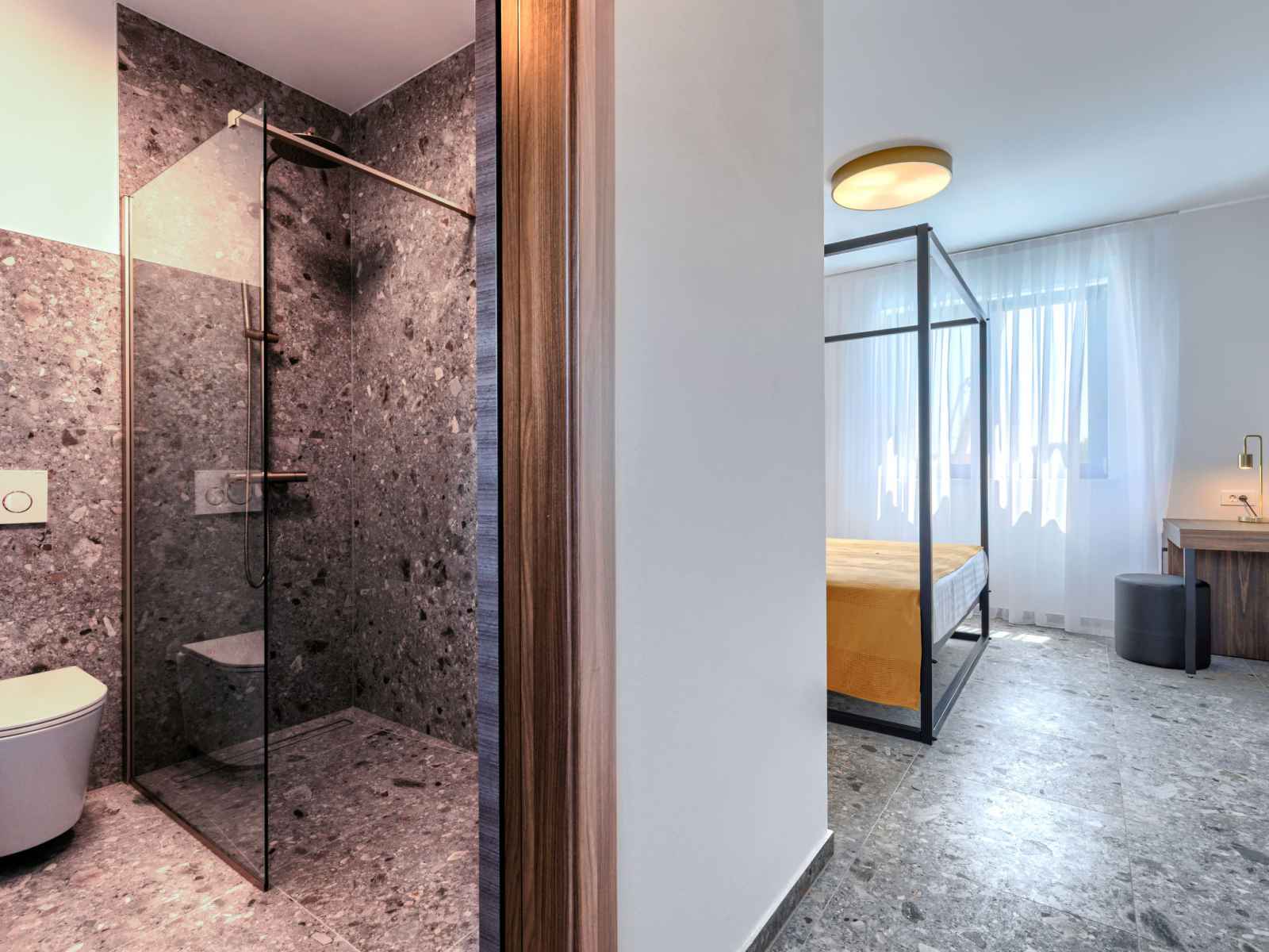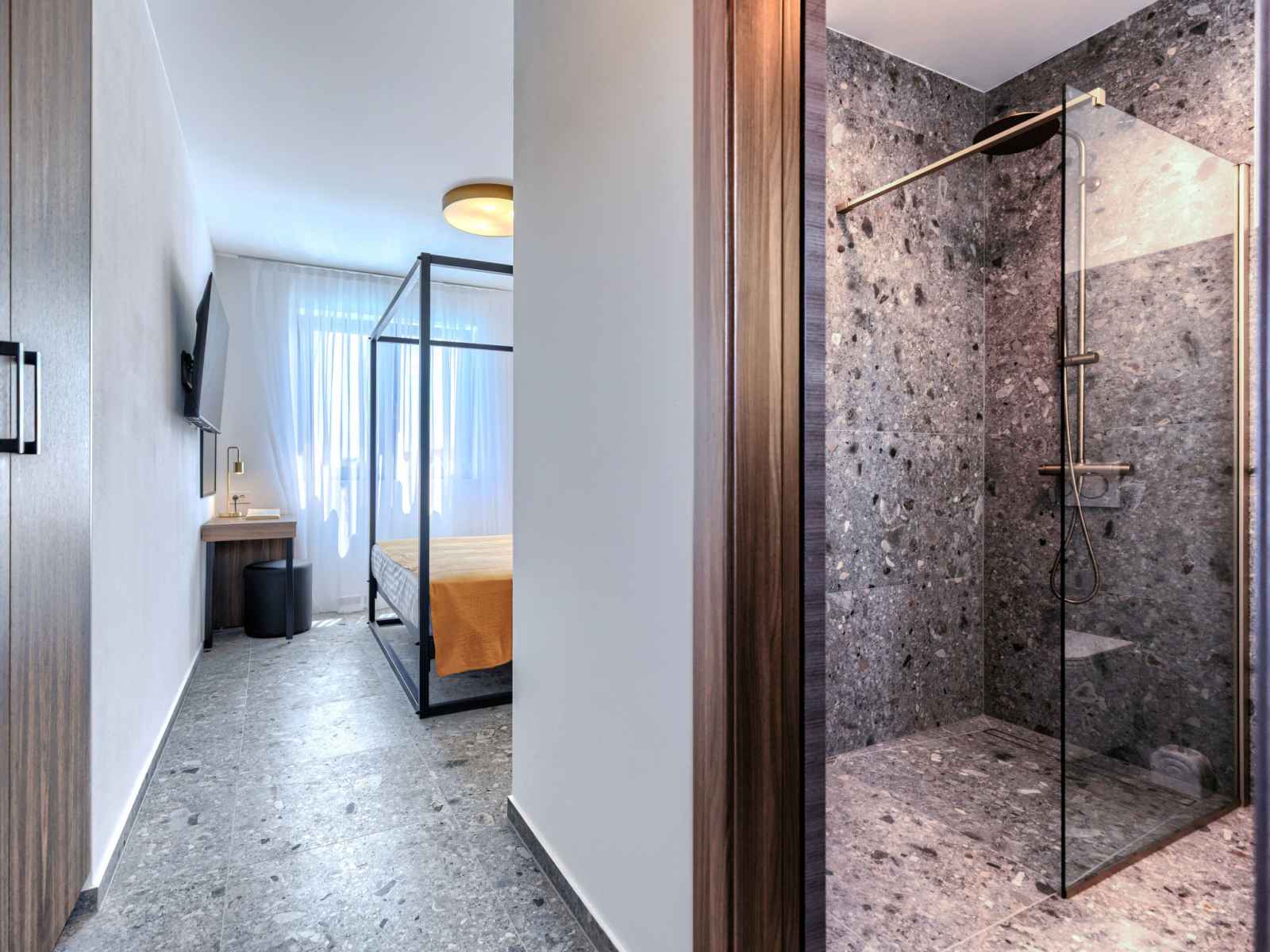 sur la terrasse. WC séparé. À l'étage supérieur: 4 chambres, chaque chambre avec: 1 grand-lit (180 cm, longueur 200 cm), douche/WC et TV (satellite) (écran plat), air-conditionné. A disposition: lave-linge, coffre-fort, chaise haute pour enfant, lit bébé jusqu'à 2 ans, sèche-cheveux. Internet (Connexion WIFI, gratuit).