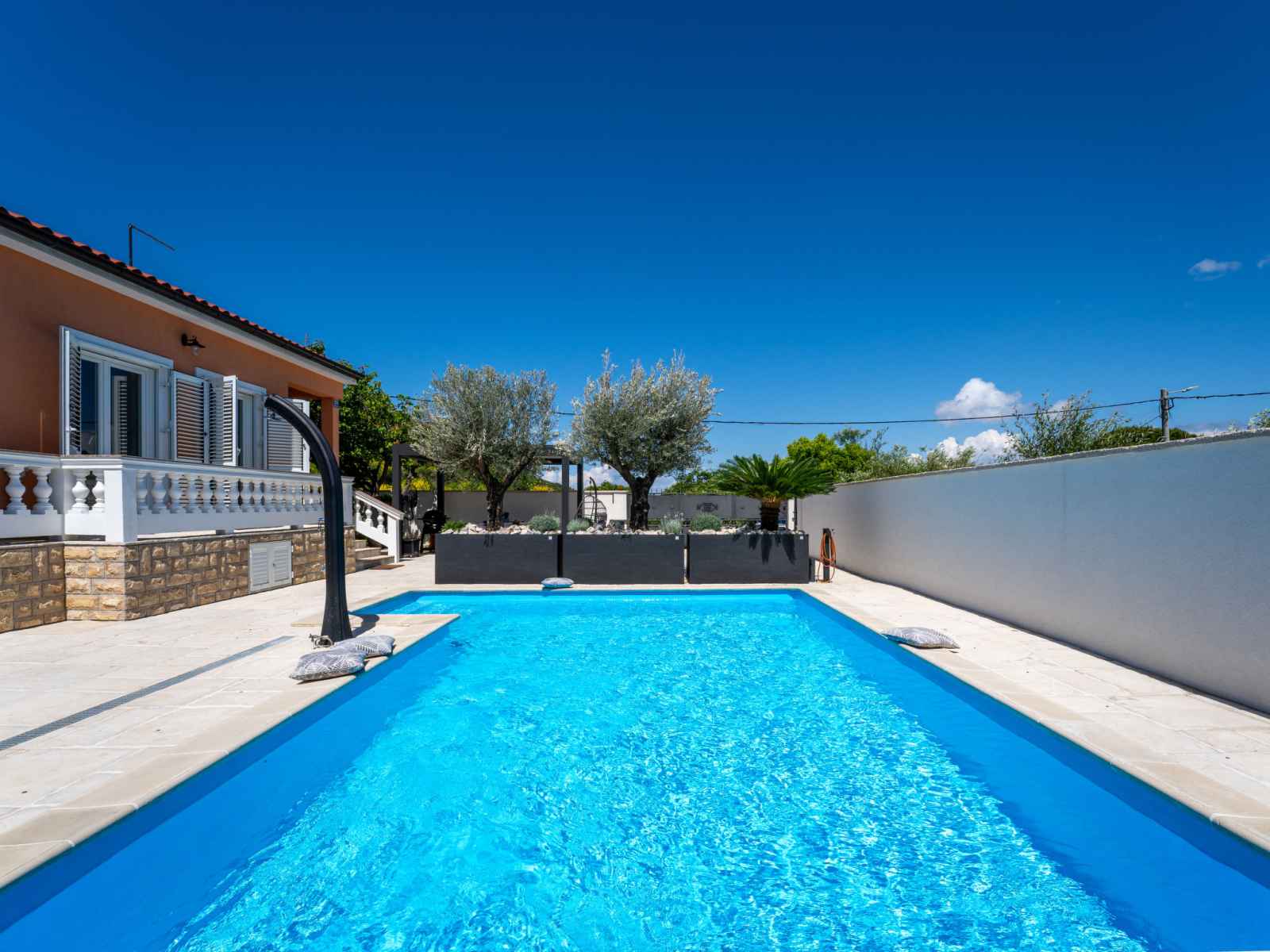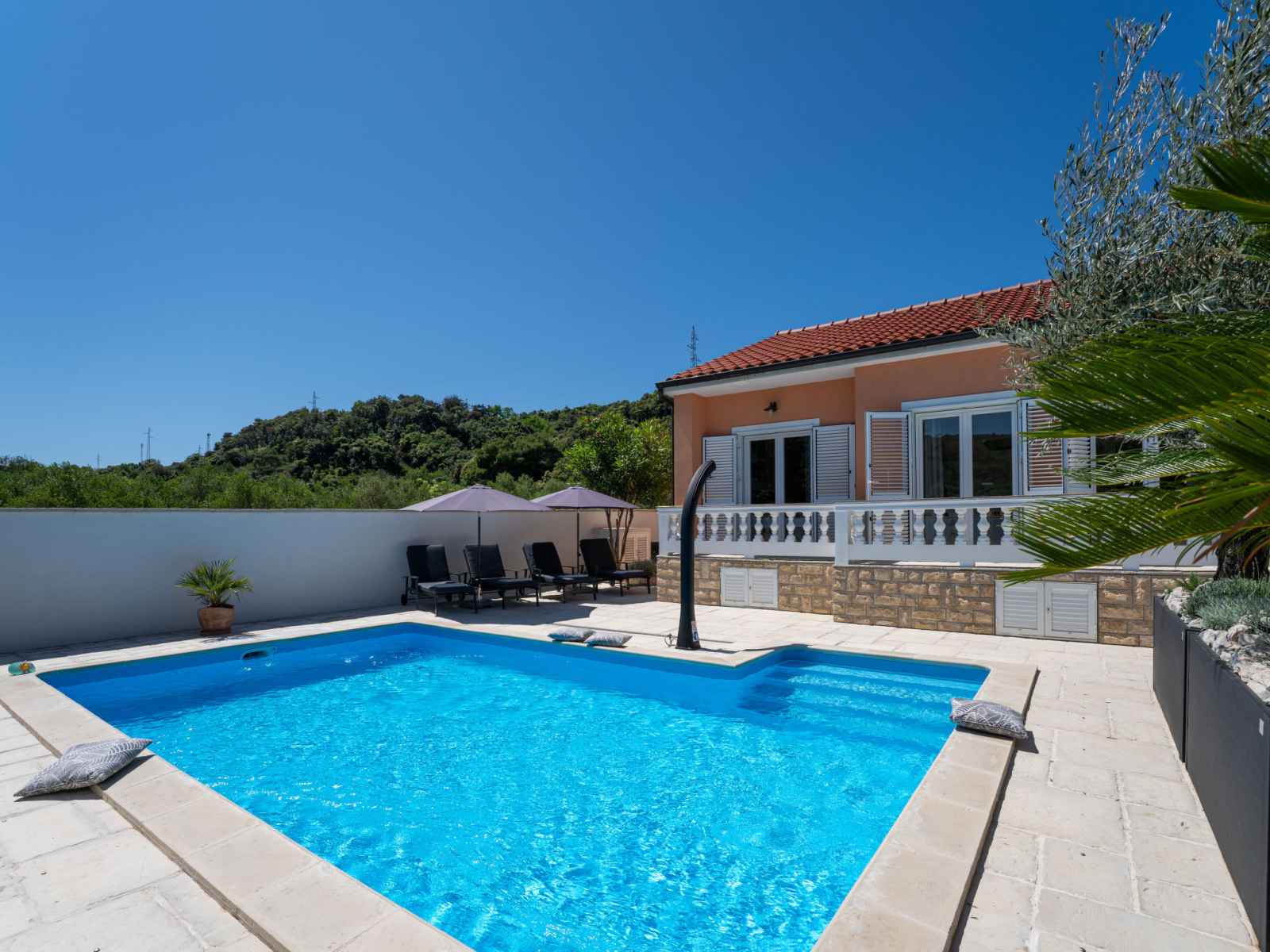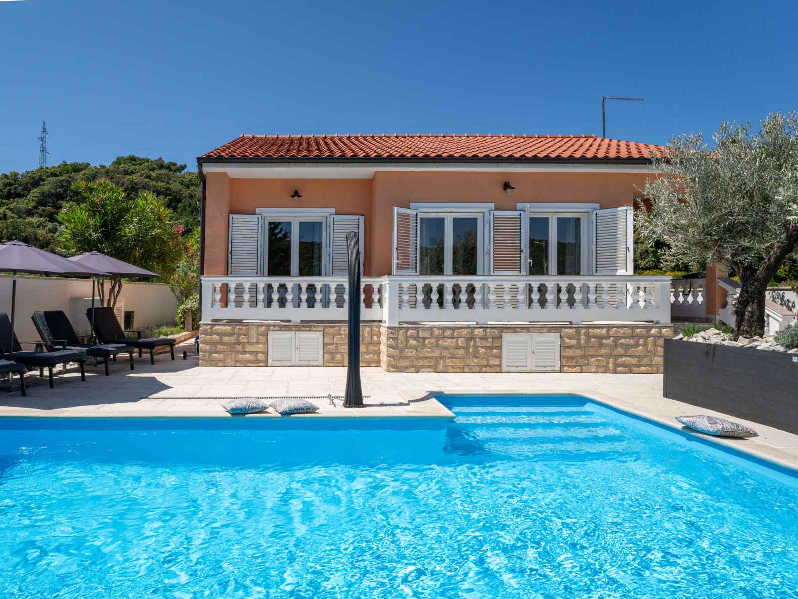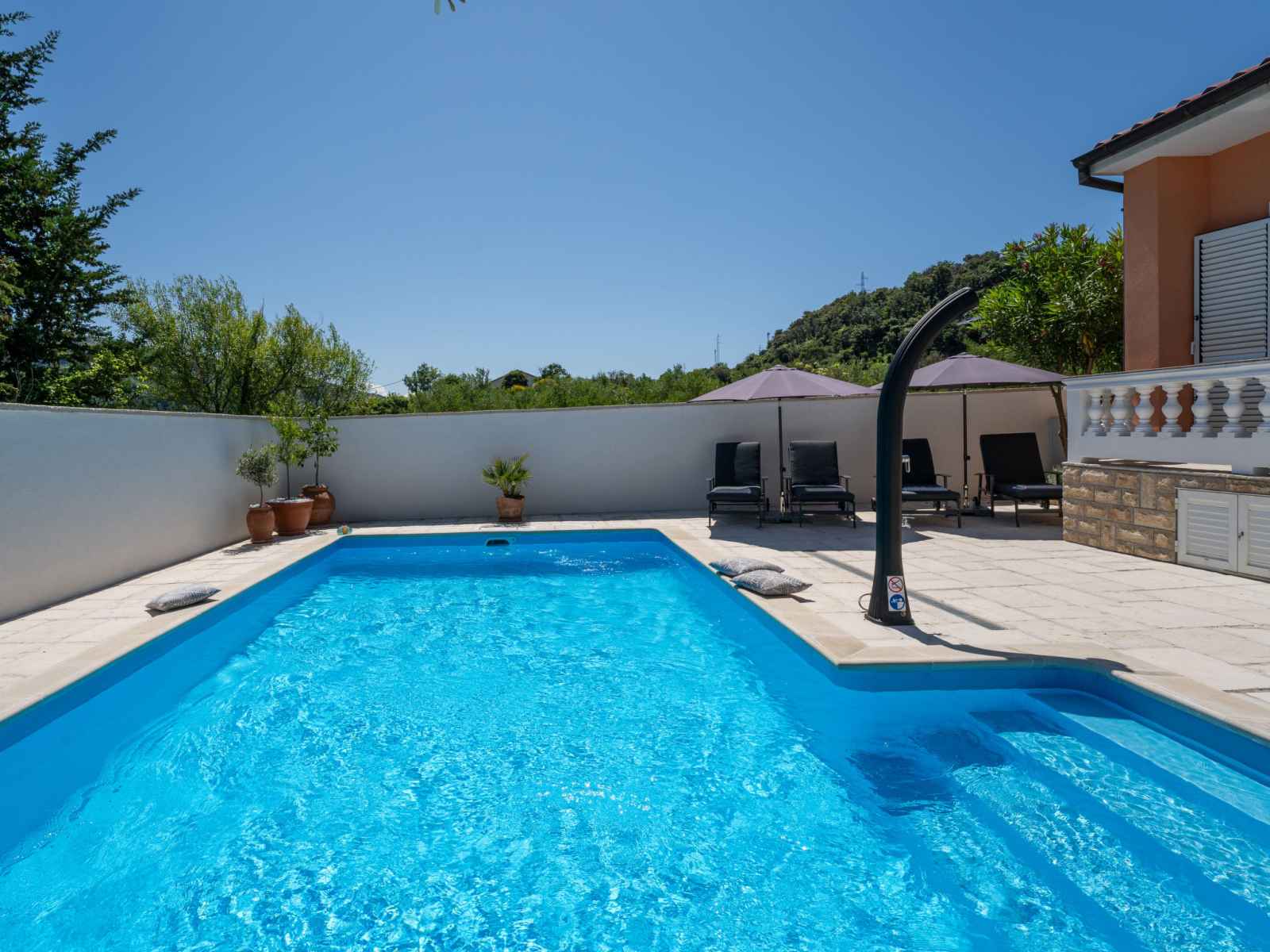 Maison individuelle "happy home rab". dans le hameau de mundanije, à 4 km du centre de rab, situation ensoleillée, à 4.3 km de la mer, à 4.4 km de la plage. a usage privé: terrain 520 m2 (clôturé) avec pelouse 100 m2 plantes, piscine rectangulaire (7 x 4 m, profondeur 110 - 140 cm, disponibilité saisonnière: 01.mai. - 15.oct.) avec