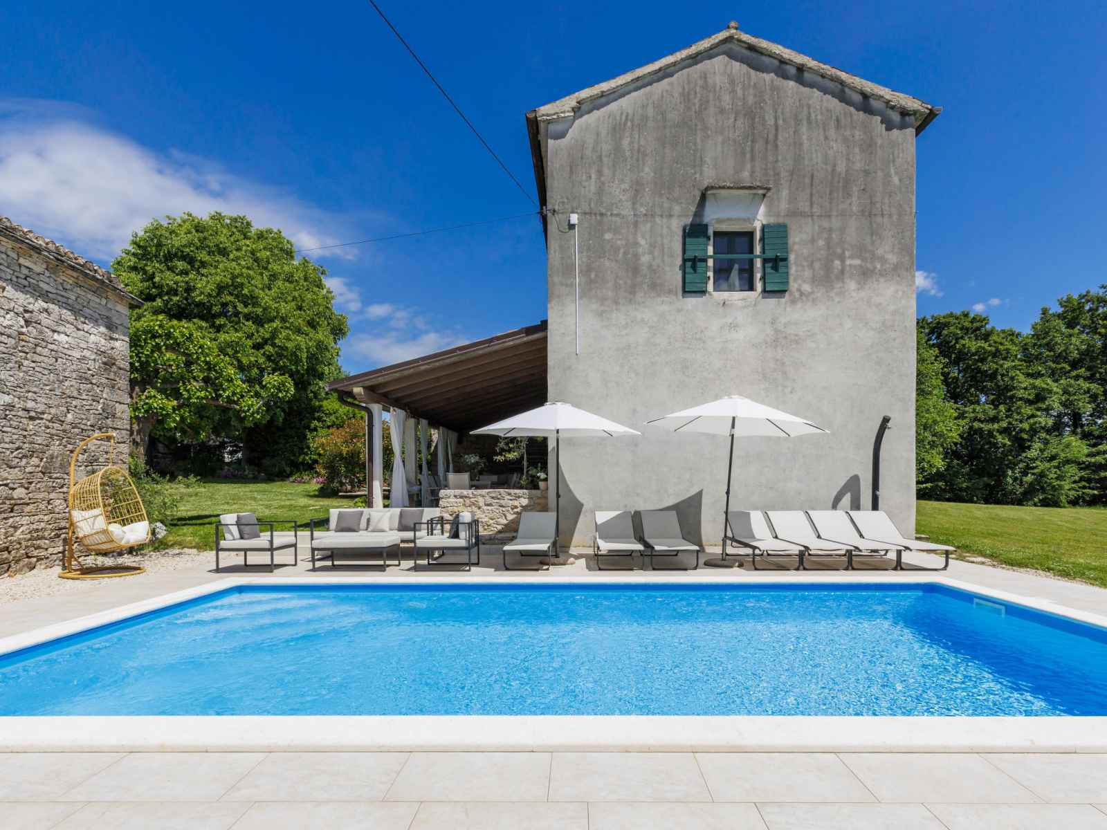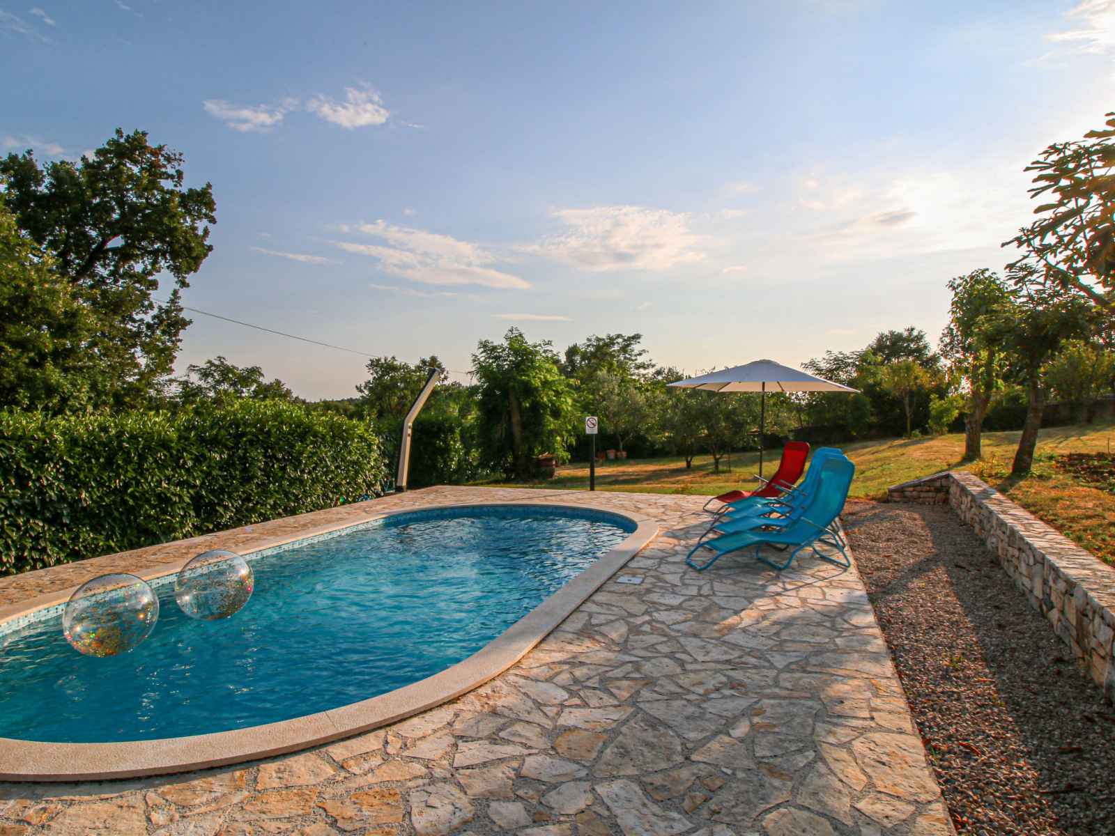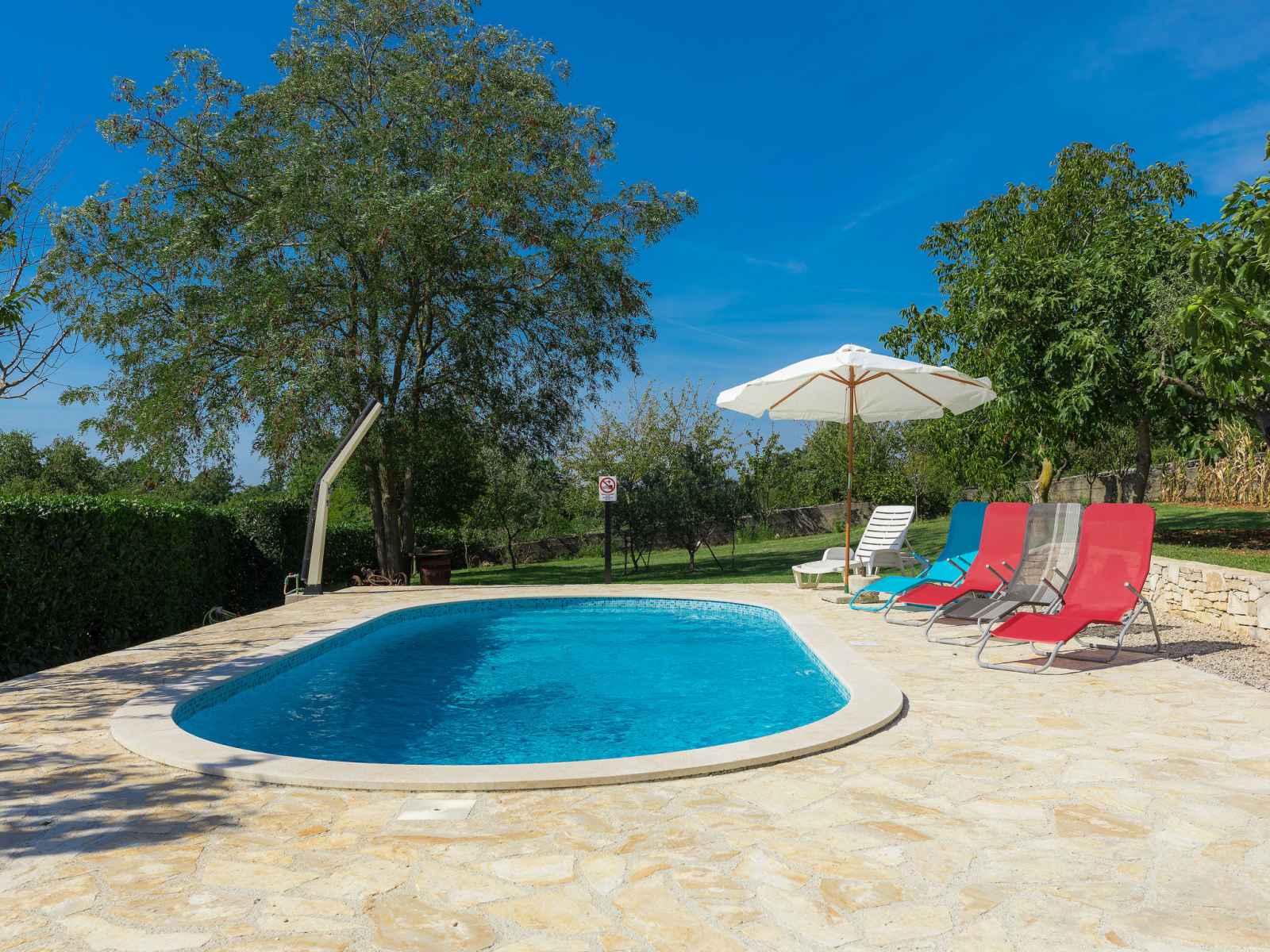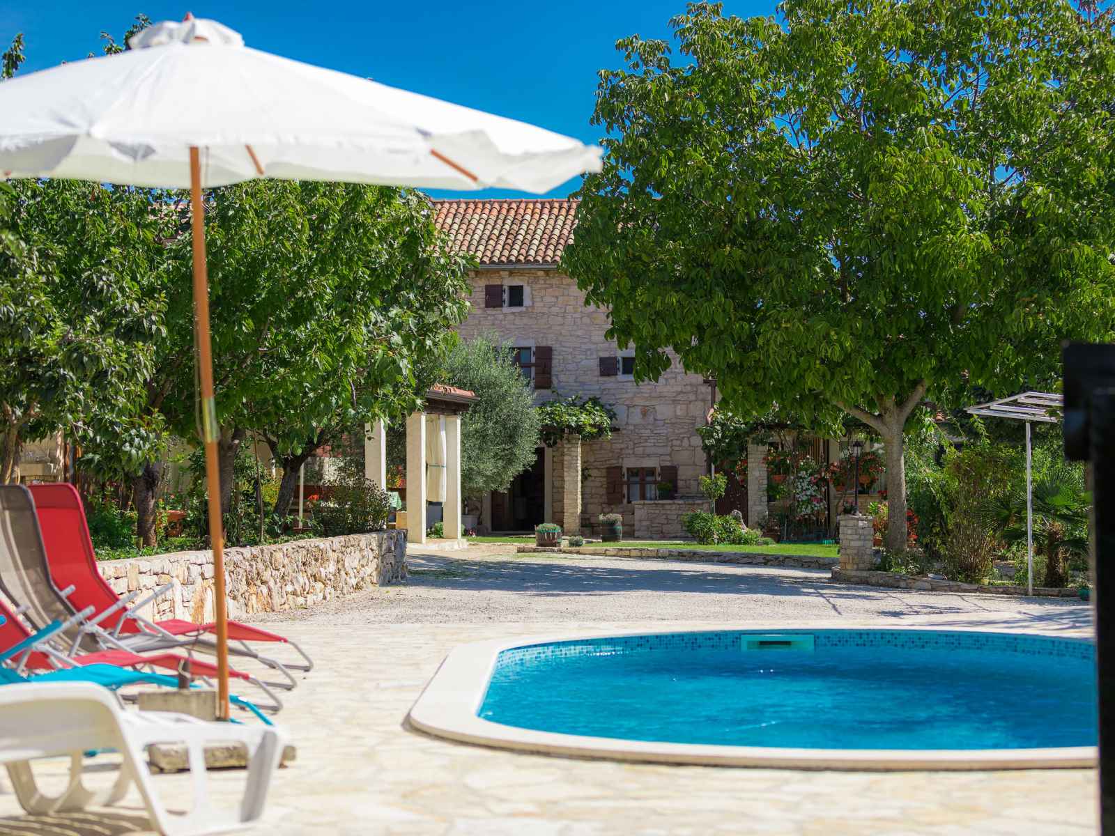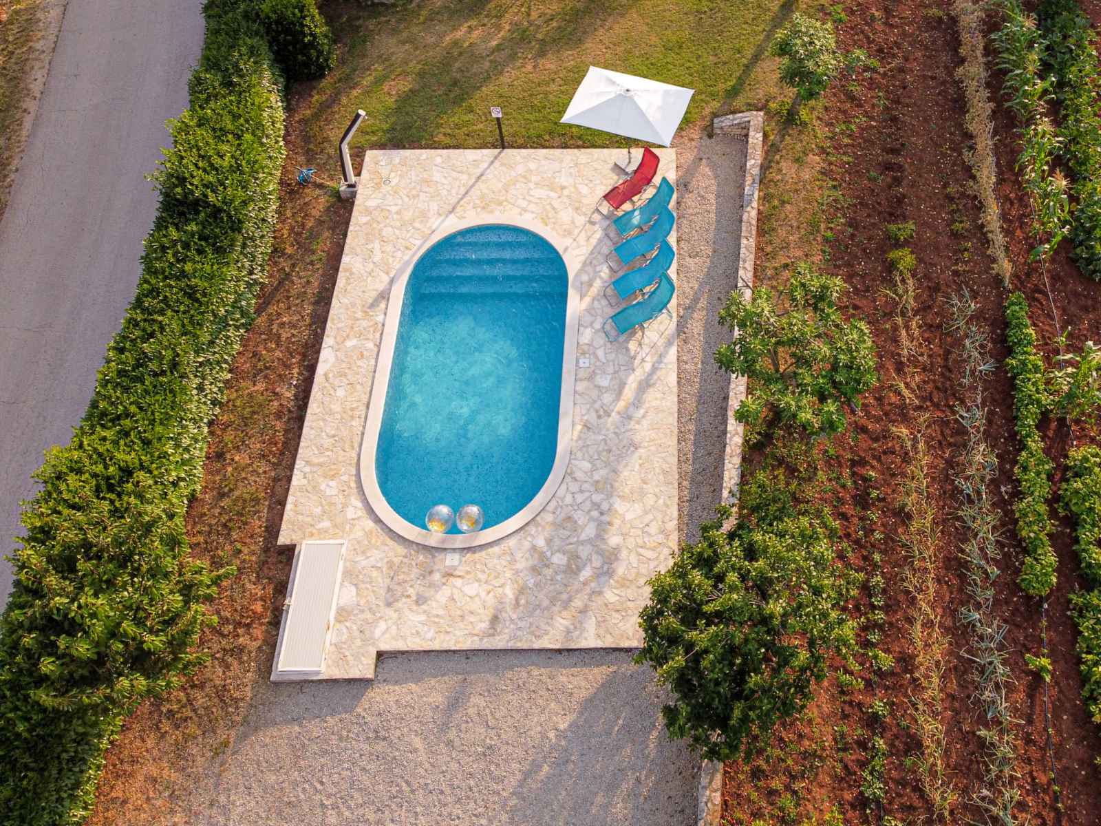 Maison jumelée "jadranka", de 3 étages. dans le hameau de folići, à 5 km du centre de Žminj, à 23 km du centre de rovinj, à 21 km de la mer. en commun: terrain 1'000 m2 avec pelouse et arbres. a usage privé: piscine (26 m2, profondeur 120 - 140 cm, disponibilité saisonnière: 15.mai. - 30.sep.) avec marches intérieures. terrasse, meubles
