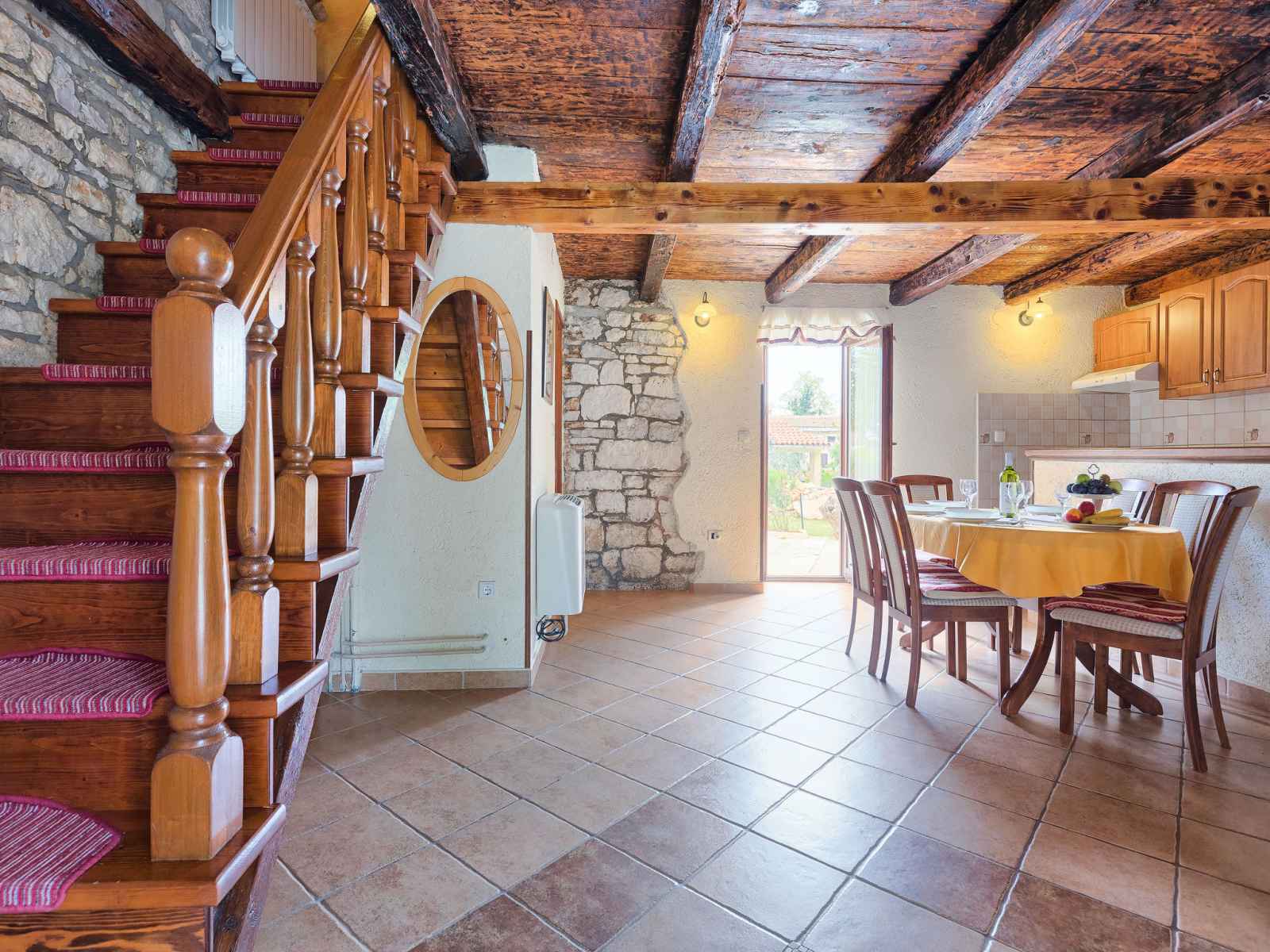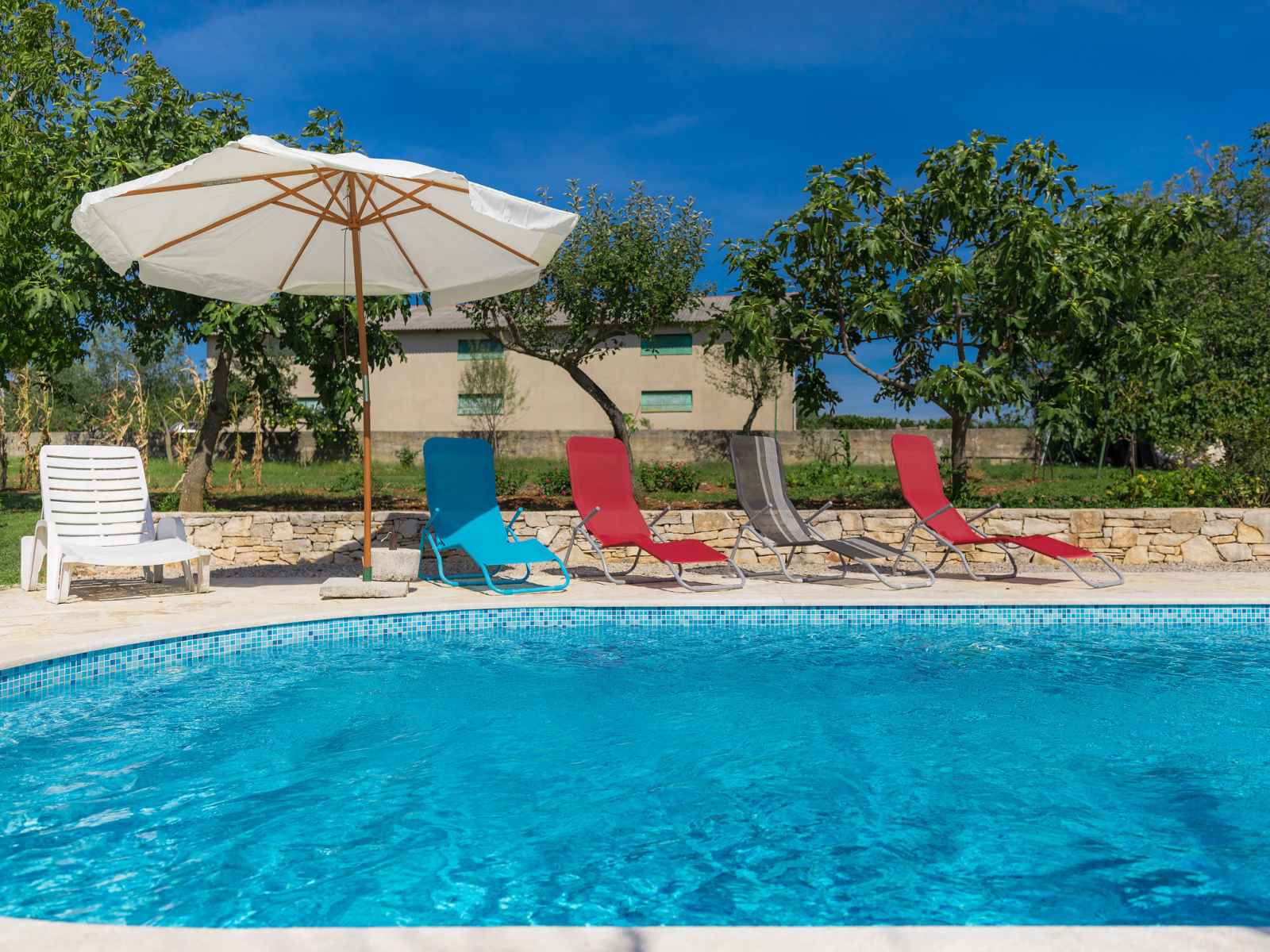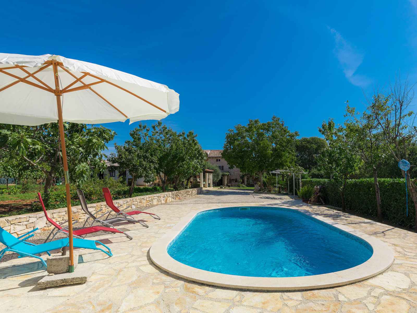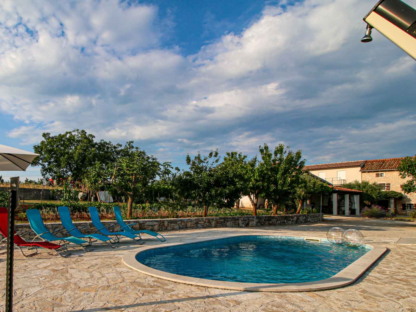 Maison jumelée "jadranka", de 3 étages. dans le hameau de folići, à 5 km du centre de Žminj, à 23 km du centre de rovinj, à 21 km de la mer. en commun: terrain 1'000 m2 avec pelouse et arbres. a usage privé: piscine (26 m2, profondeur 120 - 140 cm, disponibilité saisonnière: 15.mai. - 30.sep.) avec marches intérieures. terrasse, meubles